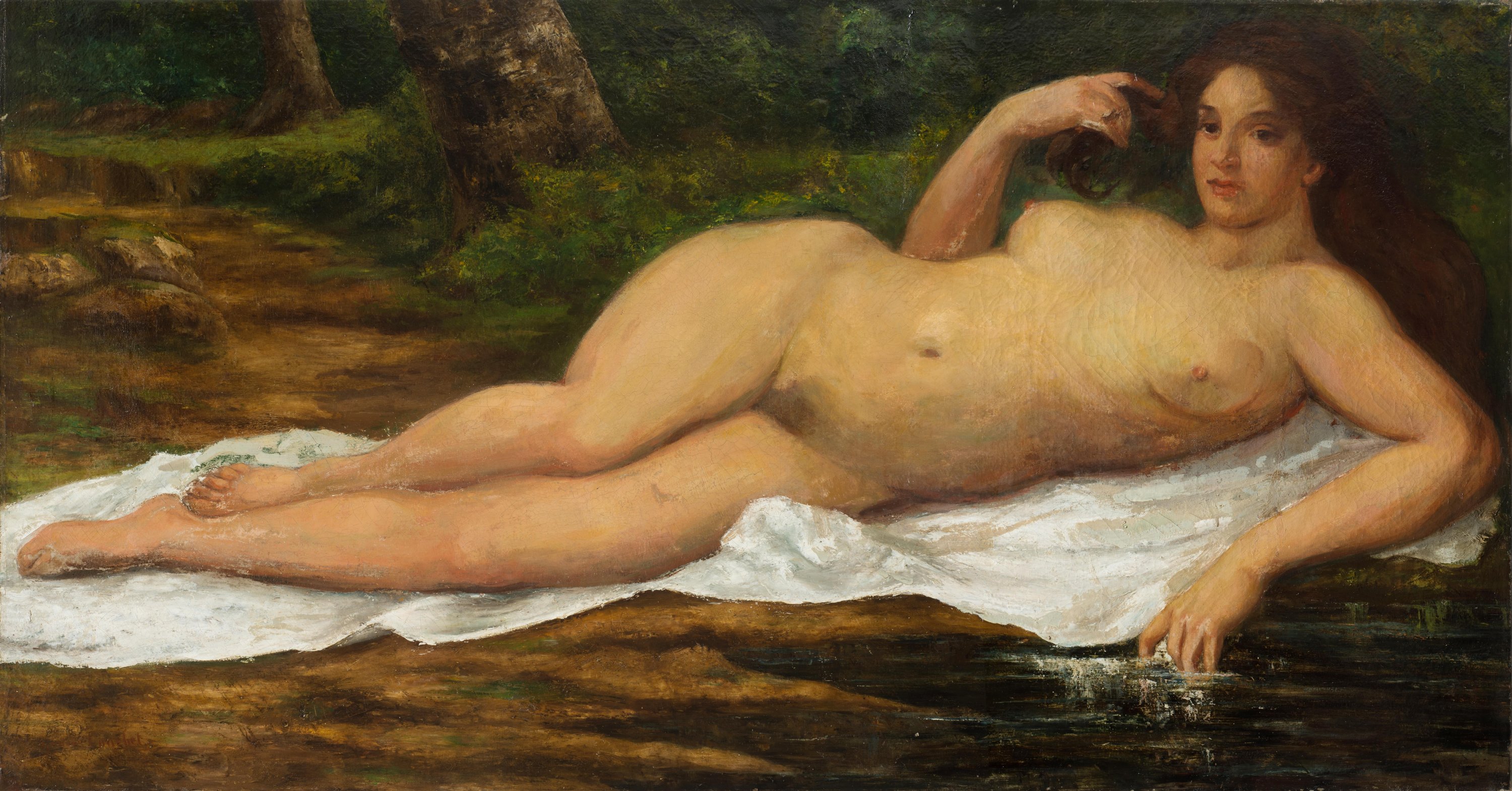 A ca. 1869 painting of a Bather (Female Nude on the Shore) by Gustave Courbet. Oil on original canvas. Signed « Gustave Courbet. » on the lower left corner.