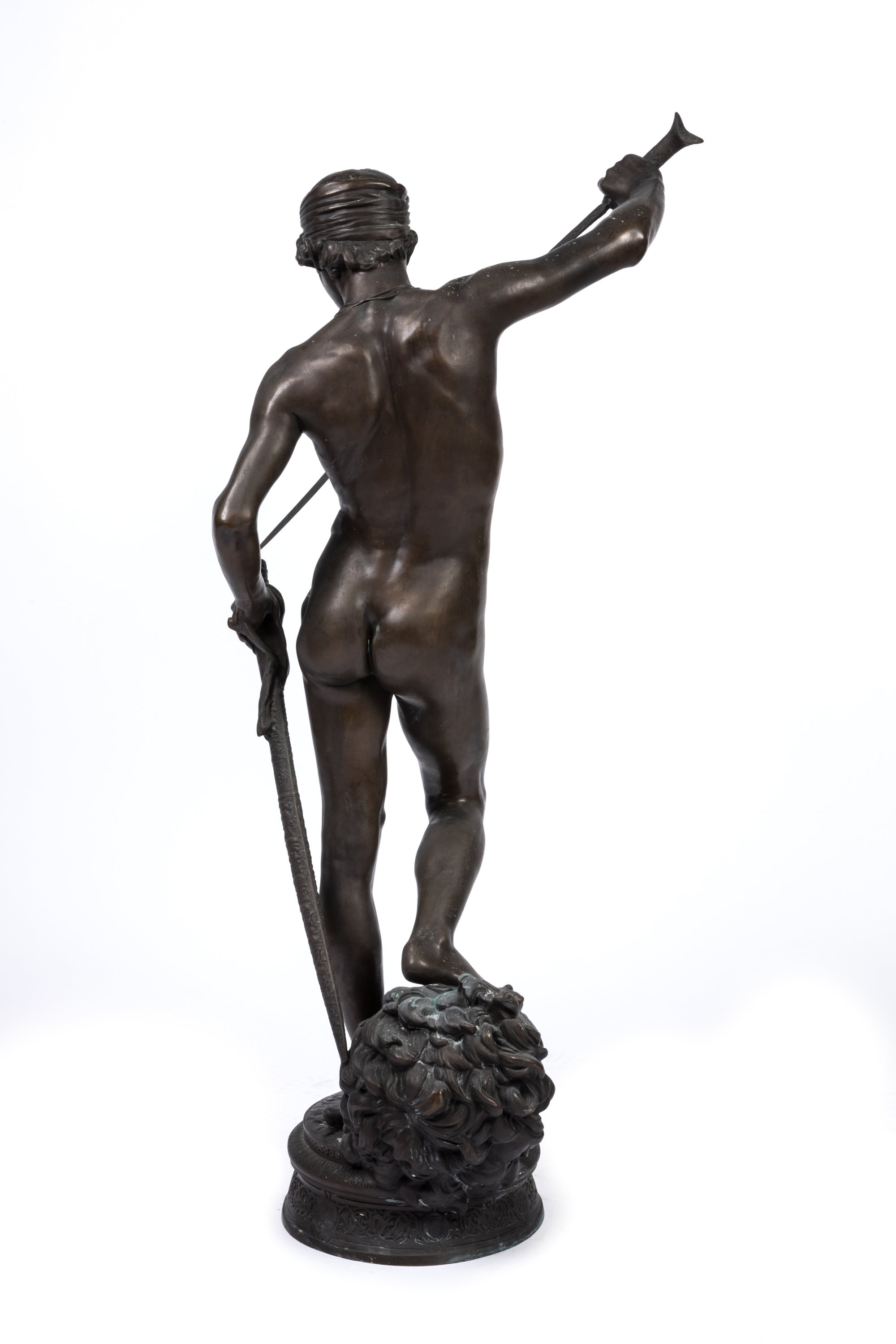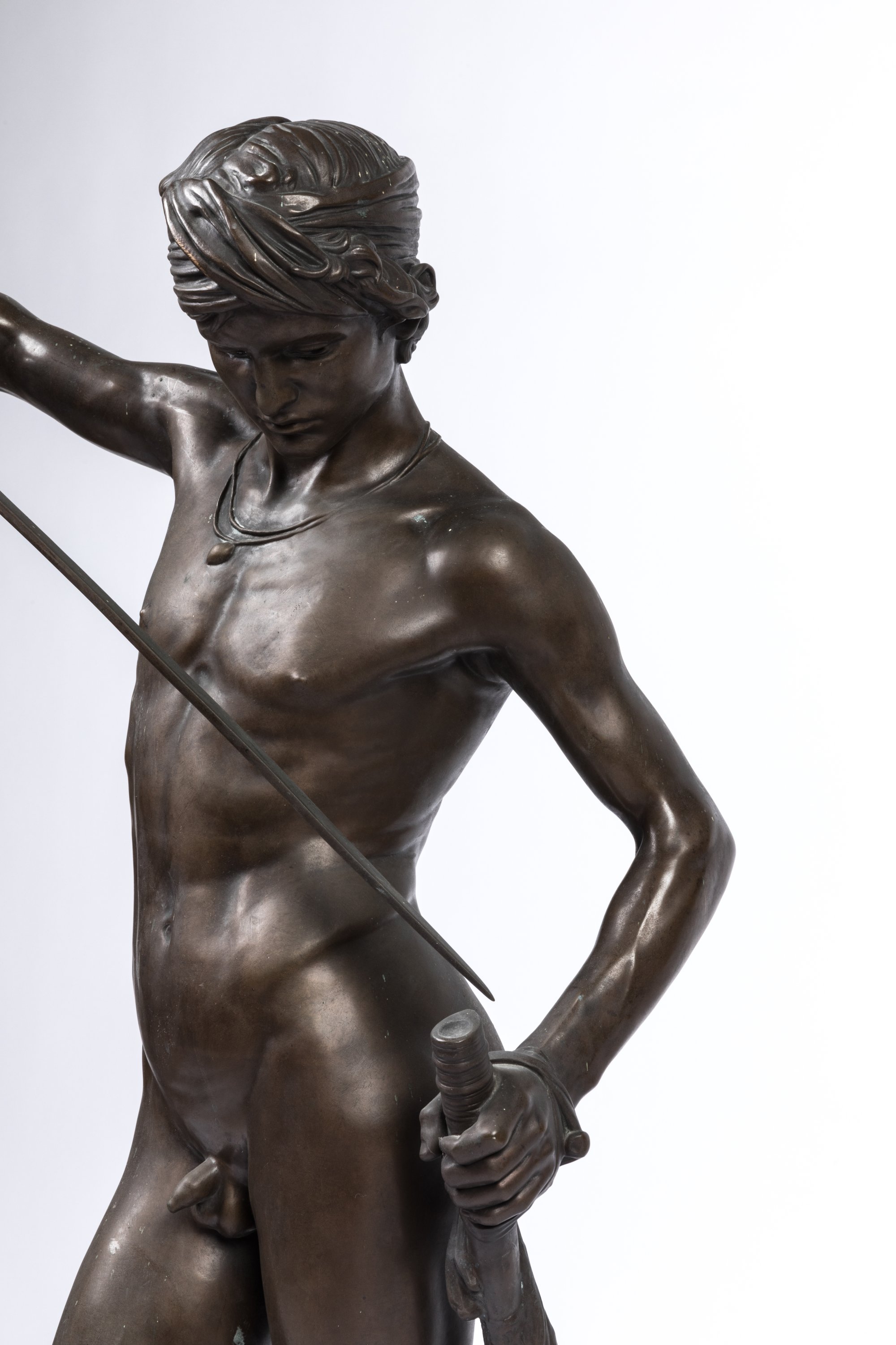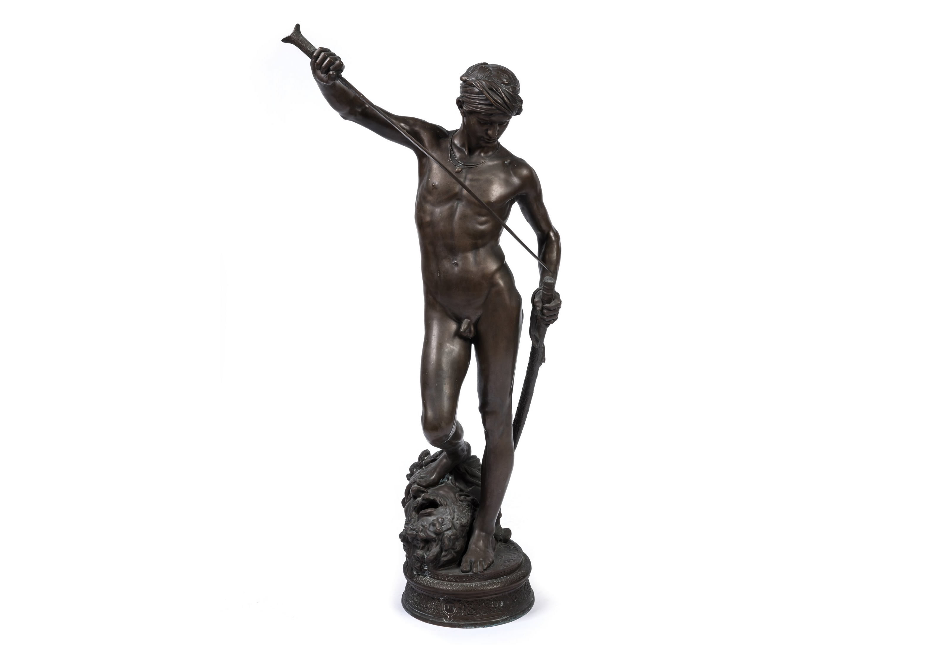 A rare 1869-70 brown patinated bronze figure of David victorious by Antonin Mercié. Barbedienne Foundry stamp. On sculptures cast at a later date, a loincloth was added to cover up David's groin.