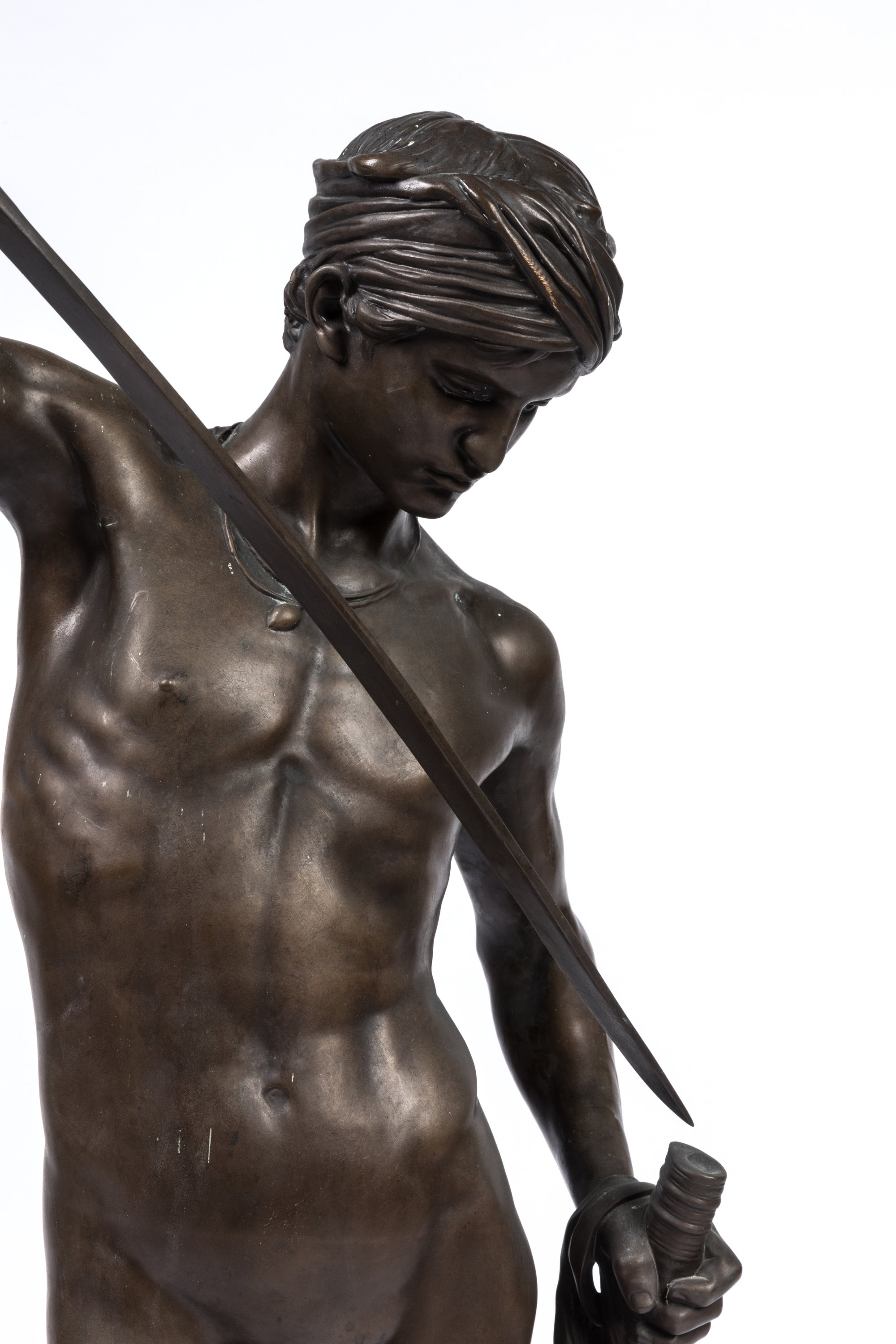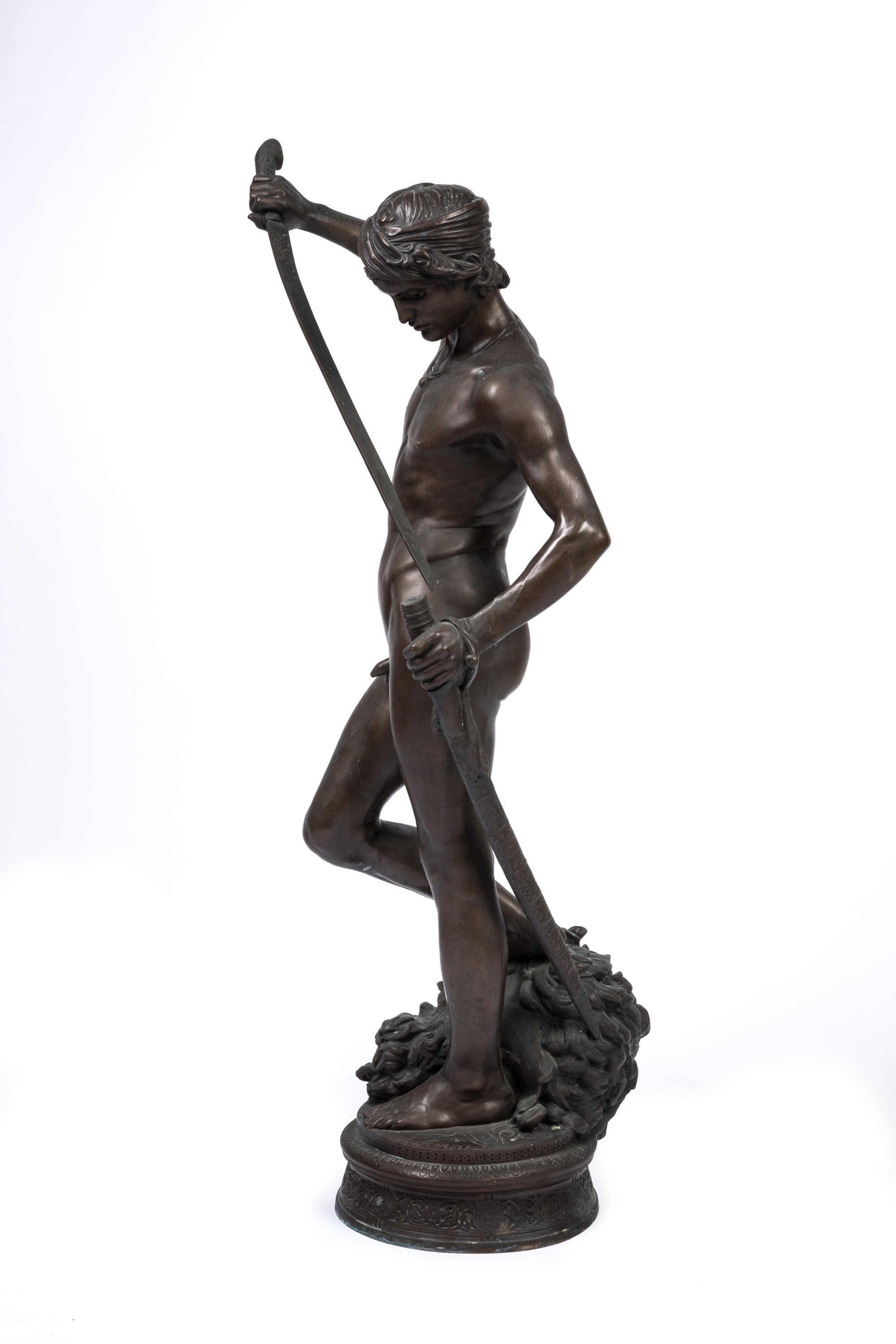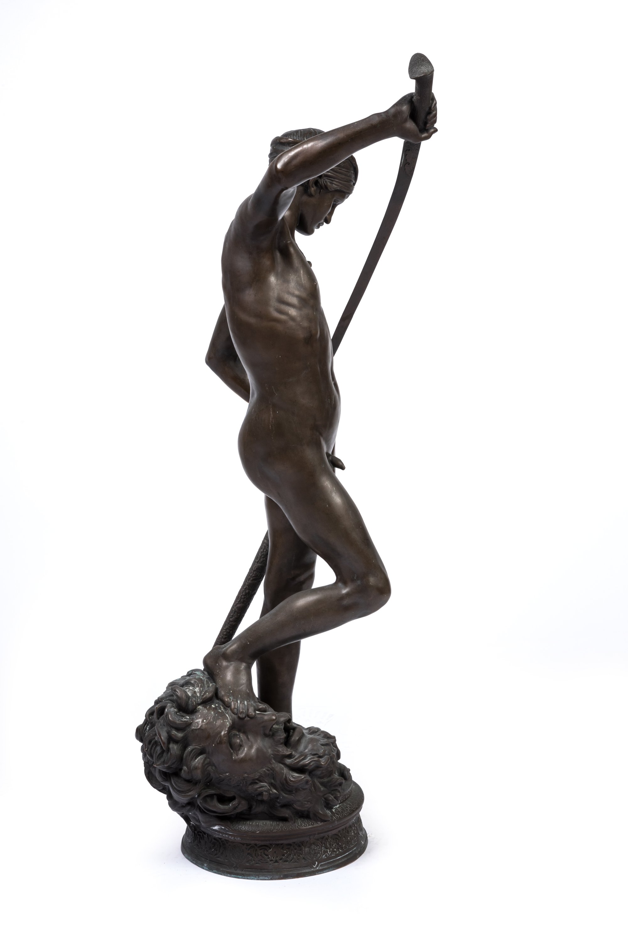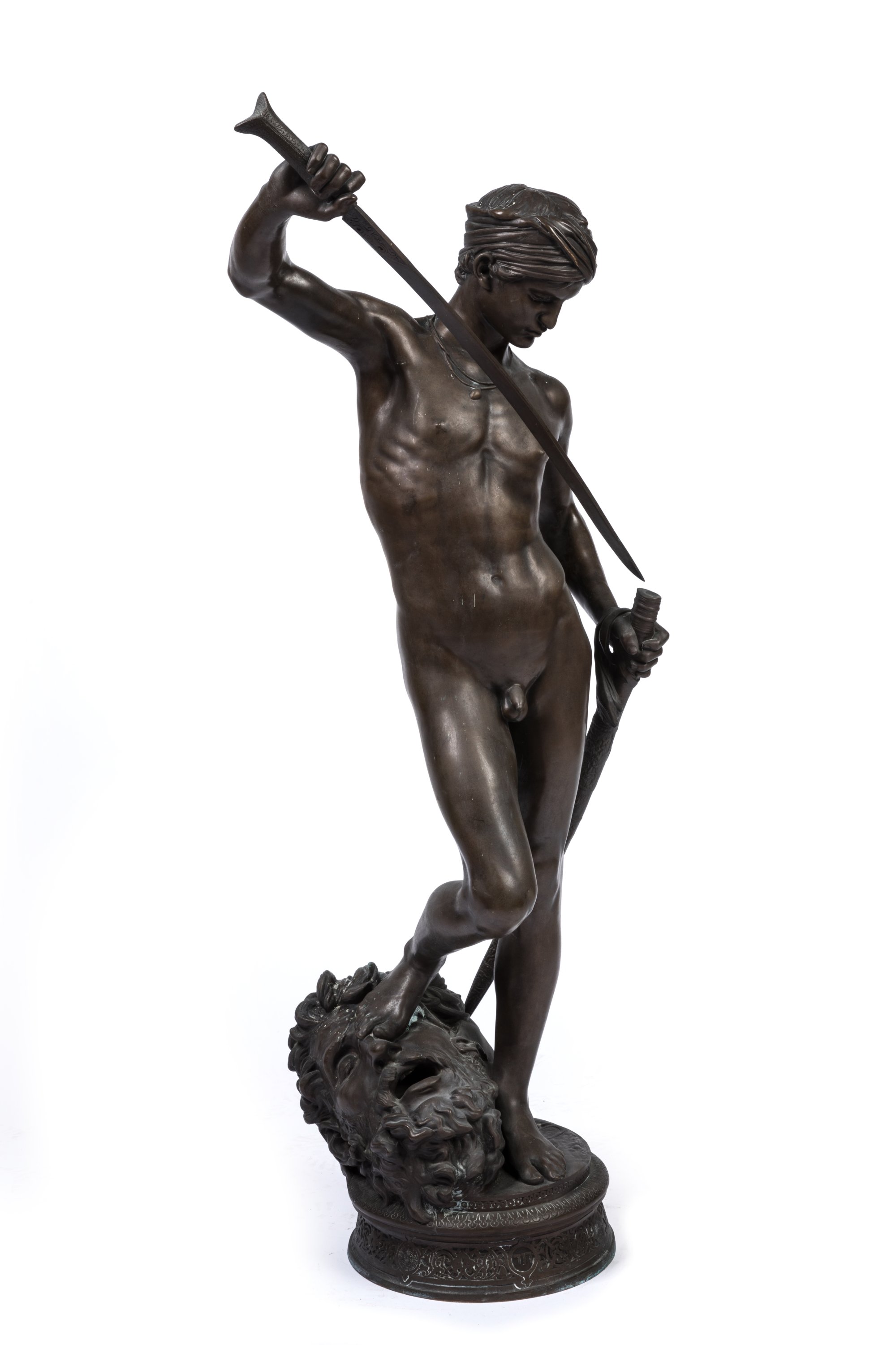 A rare 1869-70 brown patinated bronze figure of David victorious by Antonin Mercié. Barbedienne Foundry stamp. On sculptures cast at a later date, a loincloth was added to cover up David's groin.