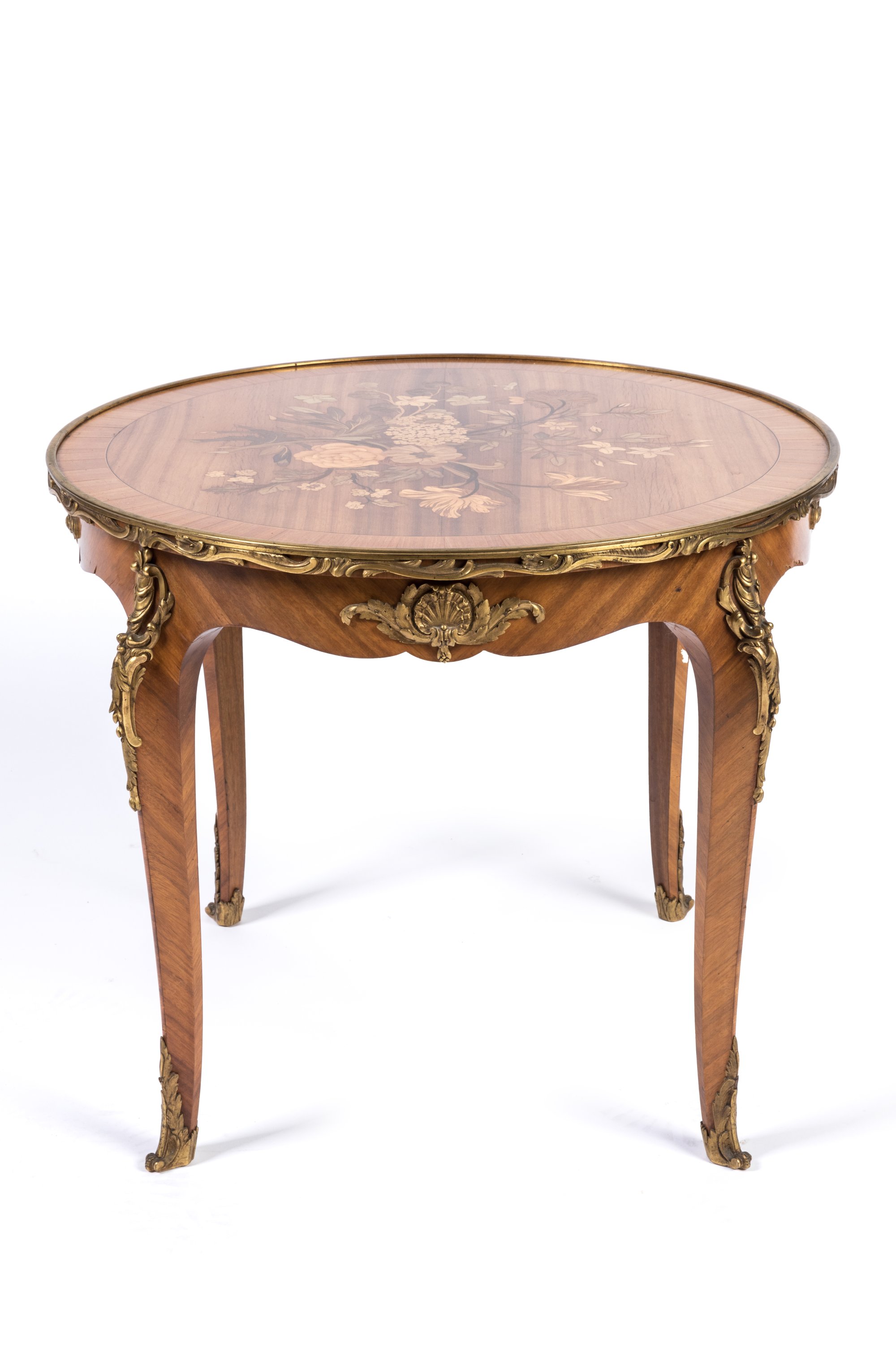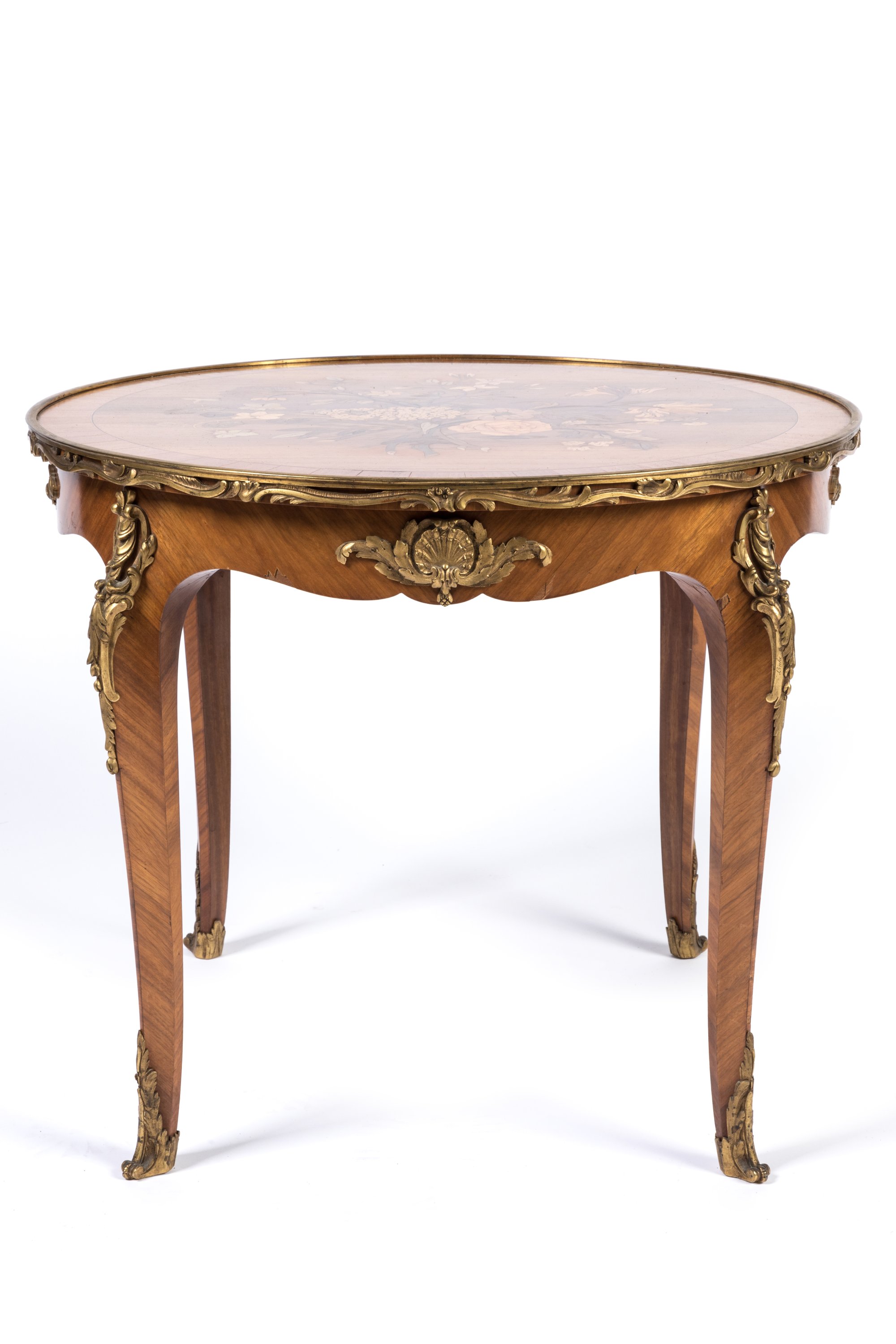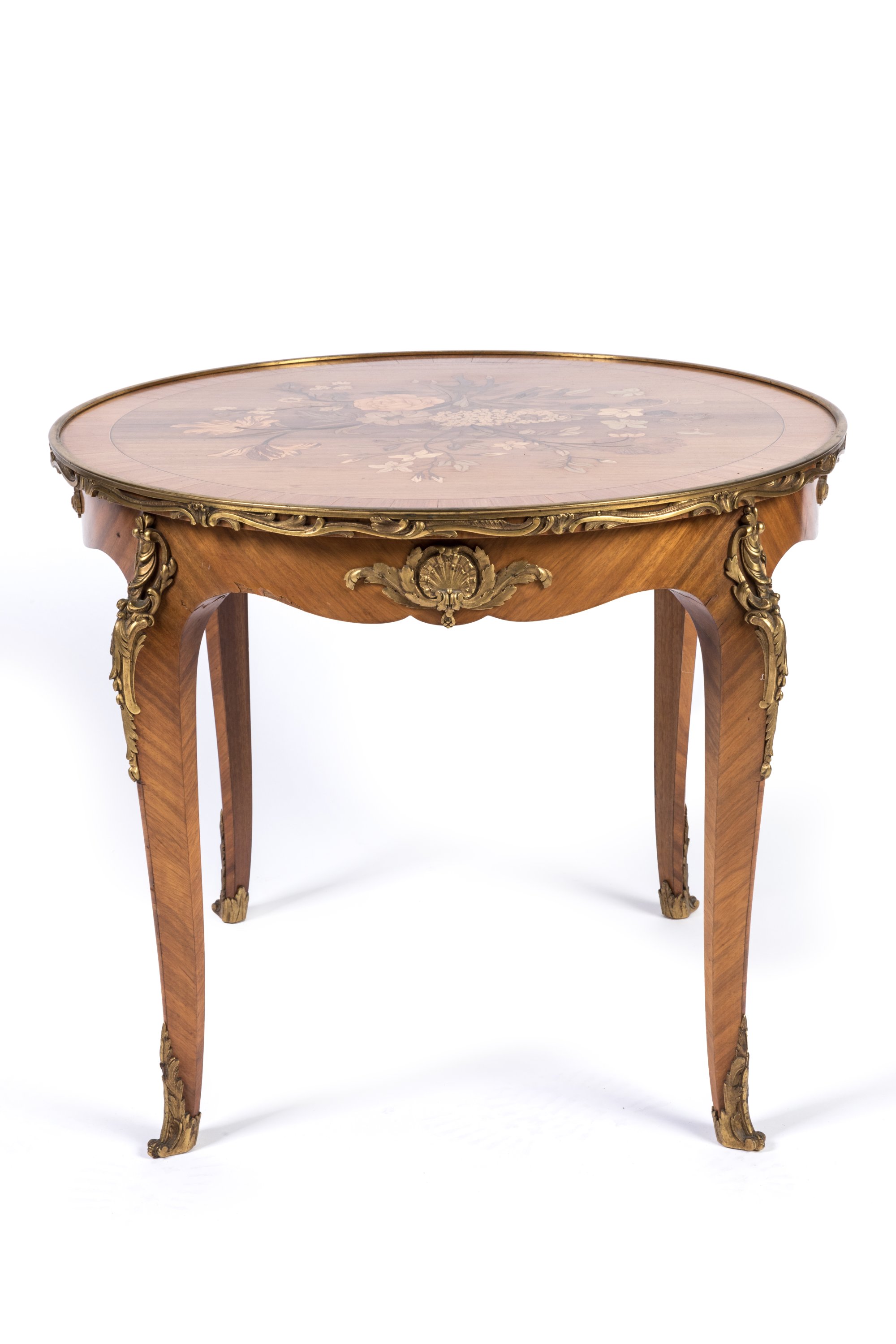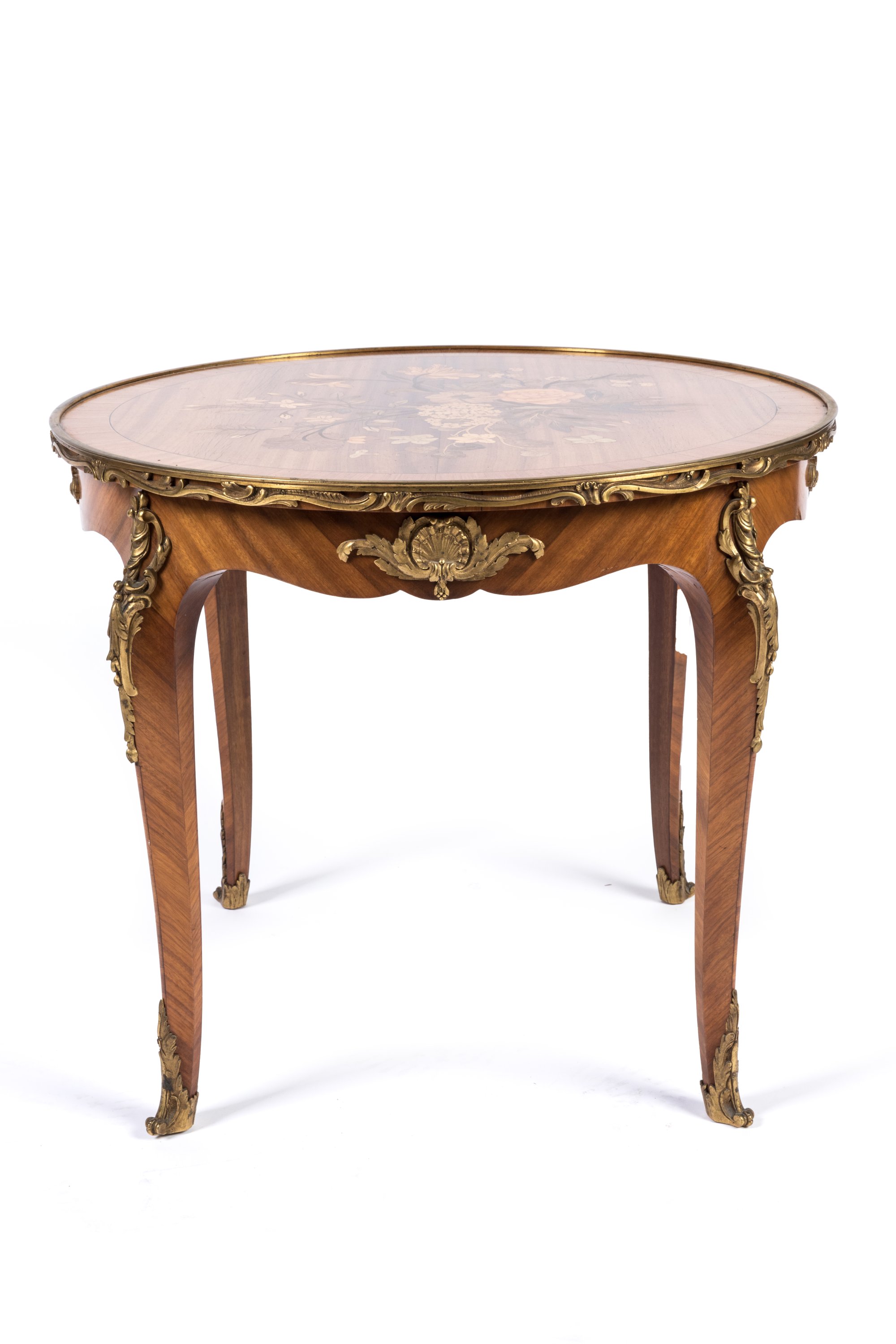 en marqueterie sur fond de bois de rose. Le plateau, décoré d'une marqueterie figurant un bouquet de fleurs dont pivoines et tulipes, est souligné d'une lingotière. La ceinture chantournée est retenue par quatre pieds légèrement cambrés. Riche ornementation de bronze de style rocaille comme cul de lampe, chutes d'angles, astragales et sabots.