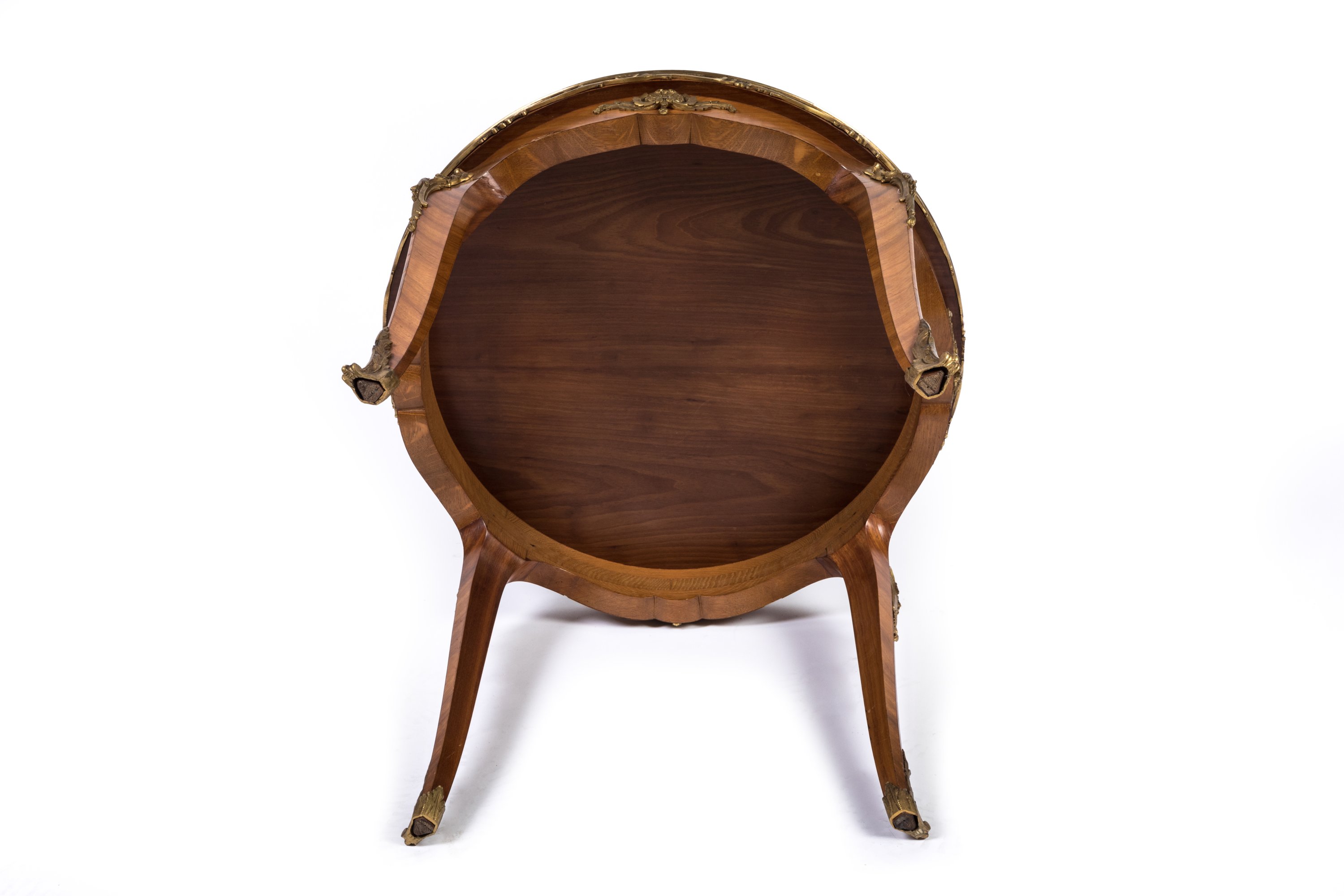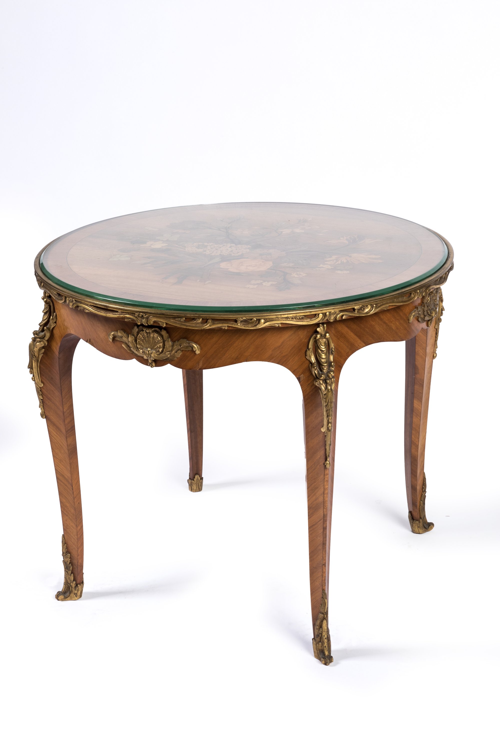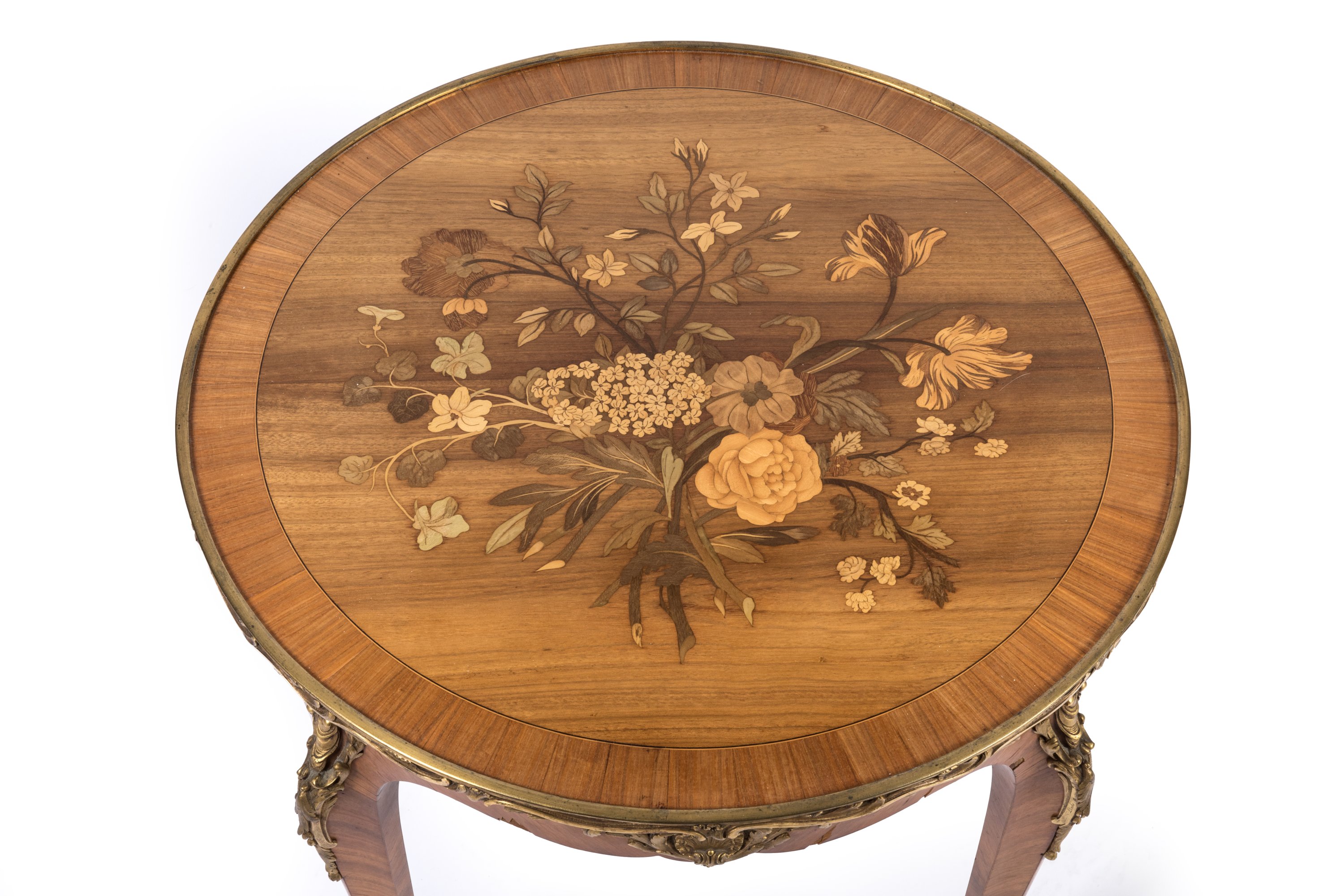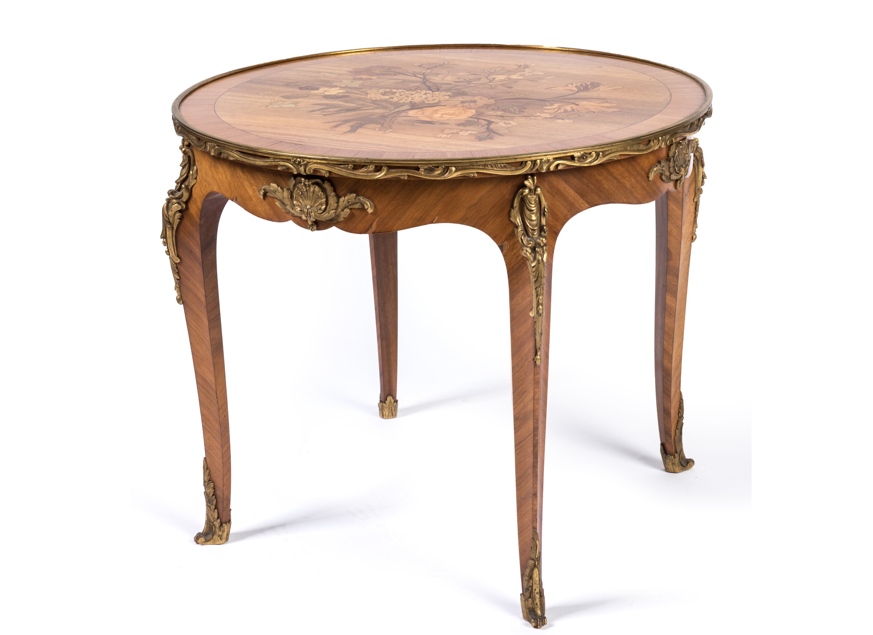 en marqueterie sur fond de bois de rose. Le plateau, décoré d'une marqueterie figurant un bouquet de fleurs dont pivoines et tulipes, est souligné d'une lingotière. La ceinture chantournée est retenue par quatre pieds légèrement cambrés. Riche ornementation de bronze de style rocaille comme cul de lampe, chutes d'angles, astragales et sabots.