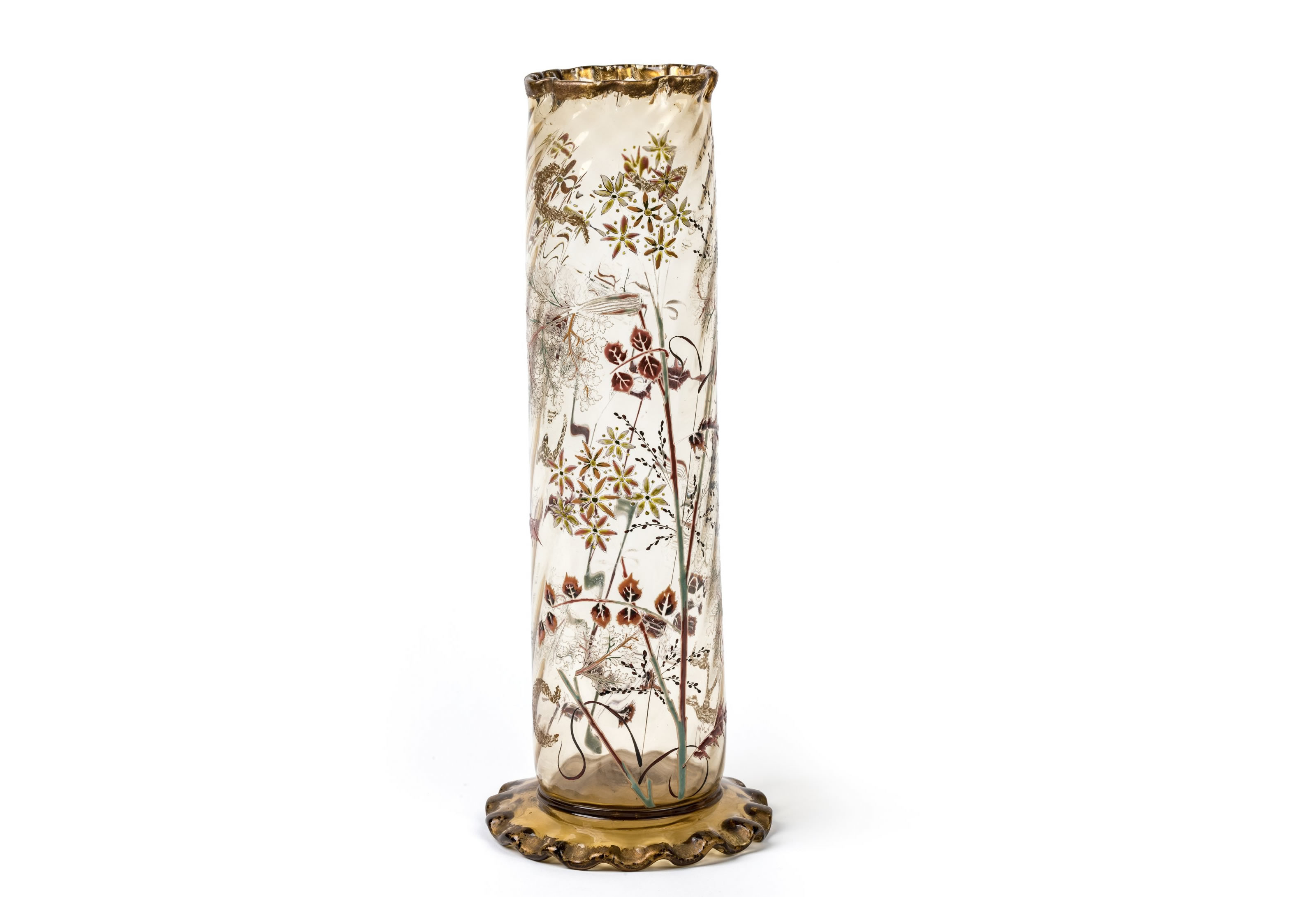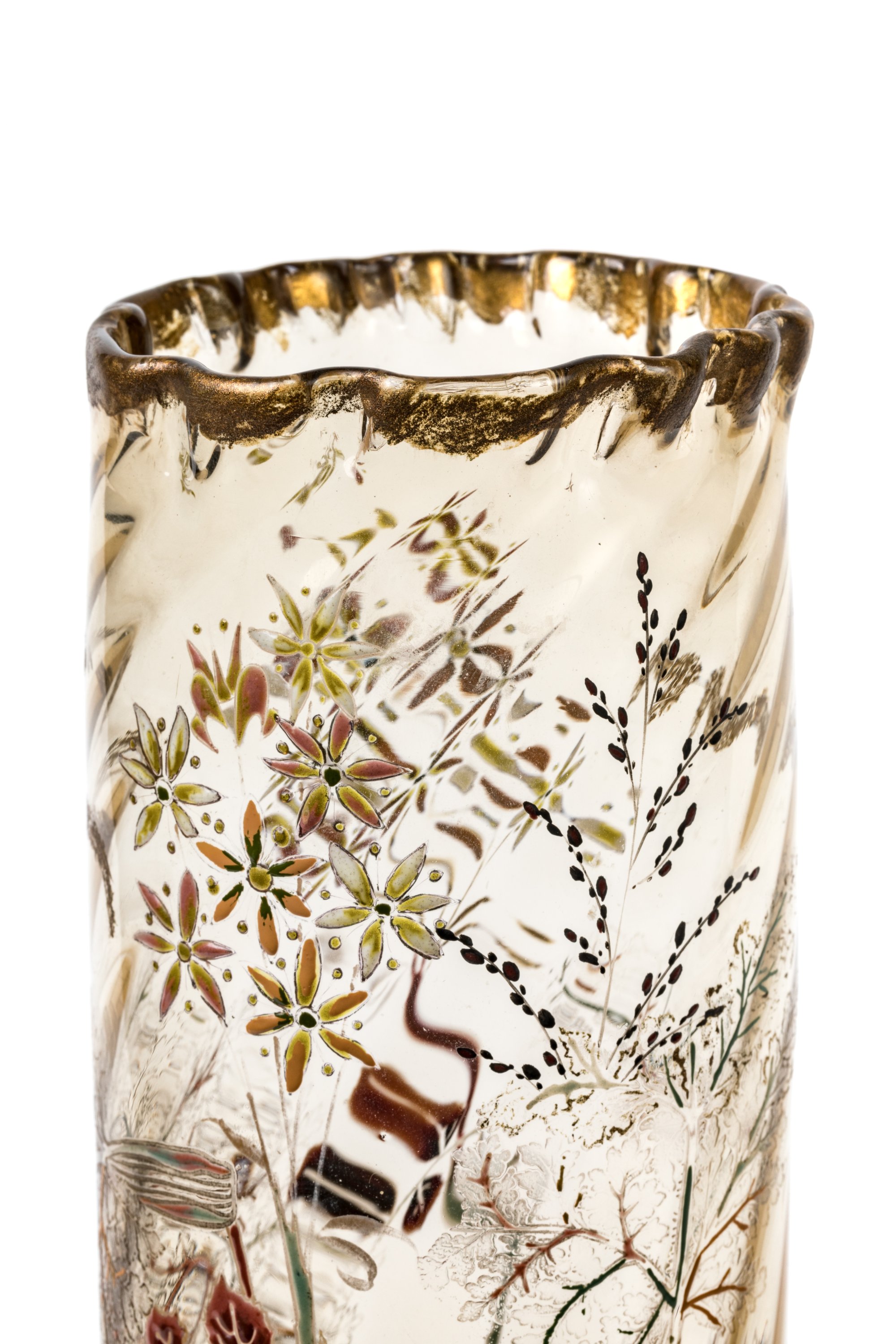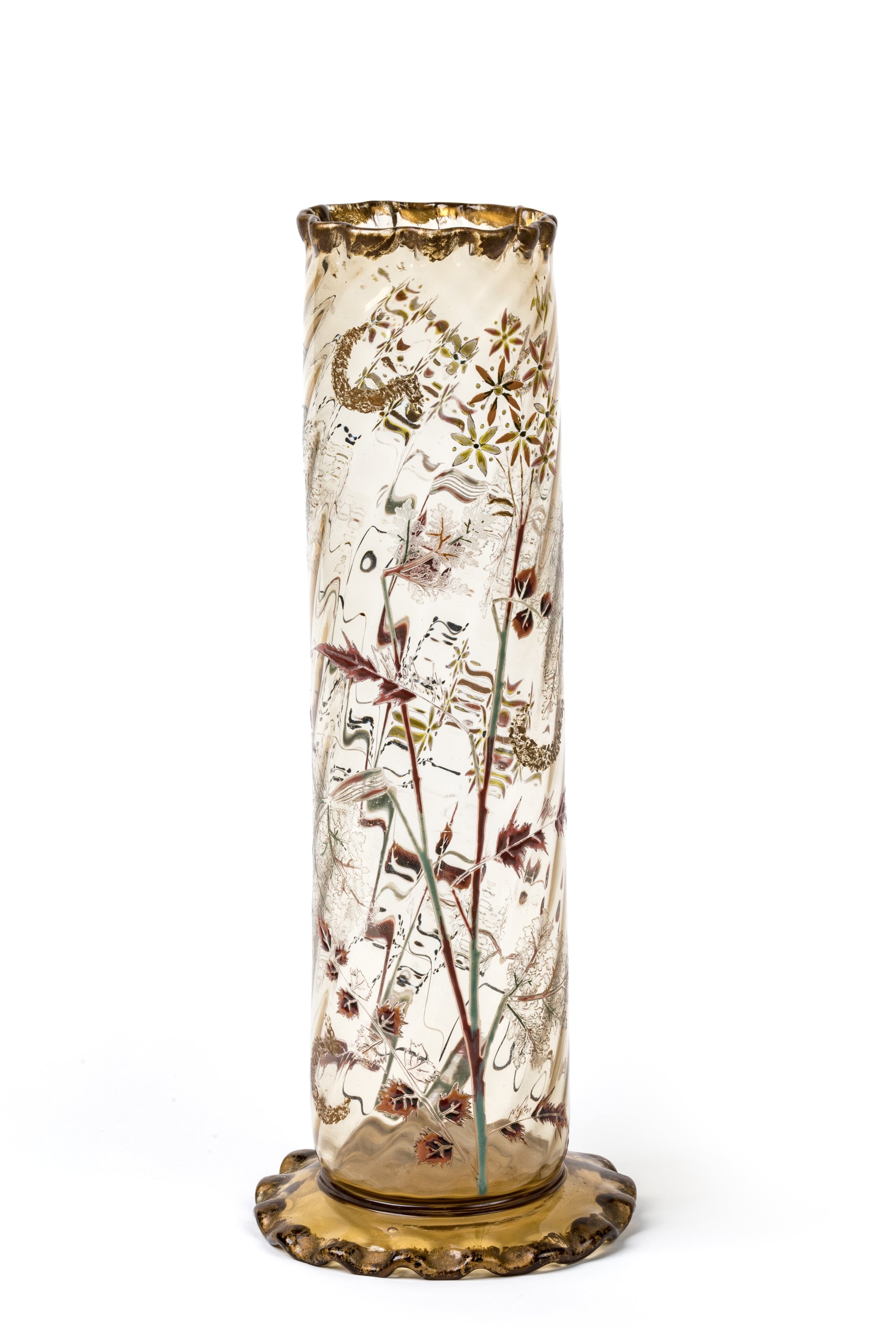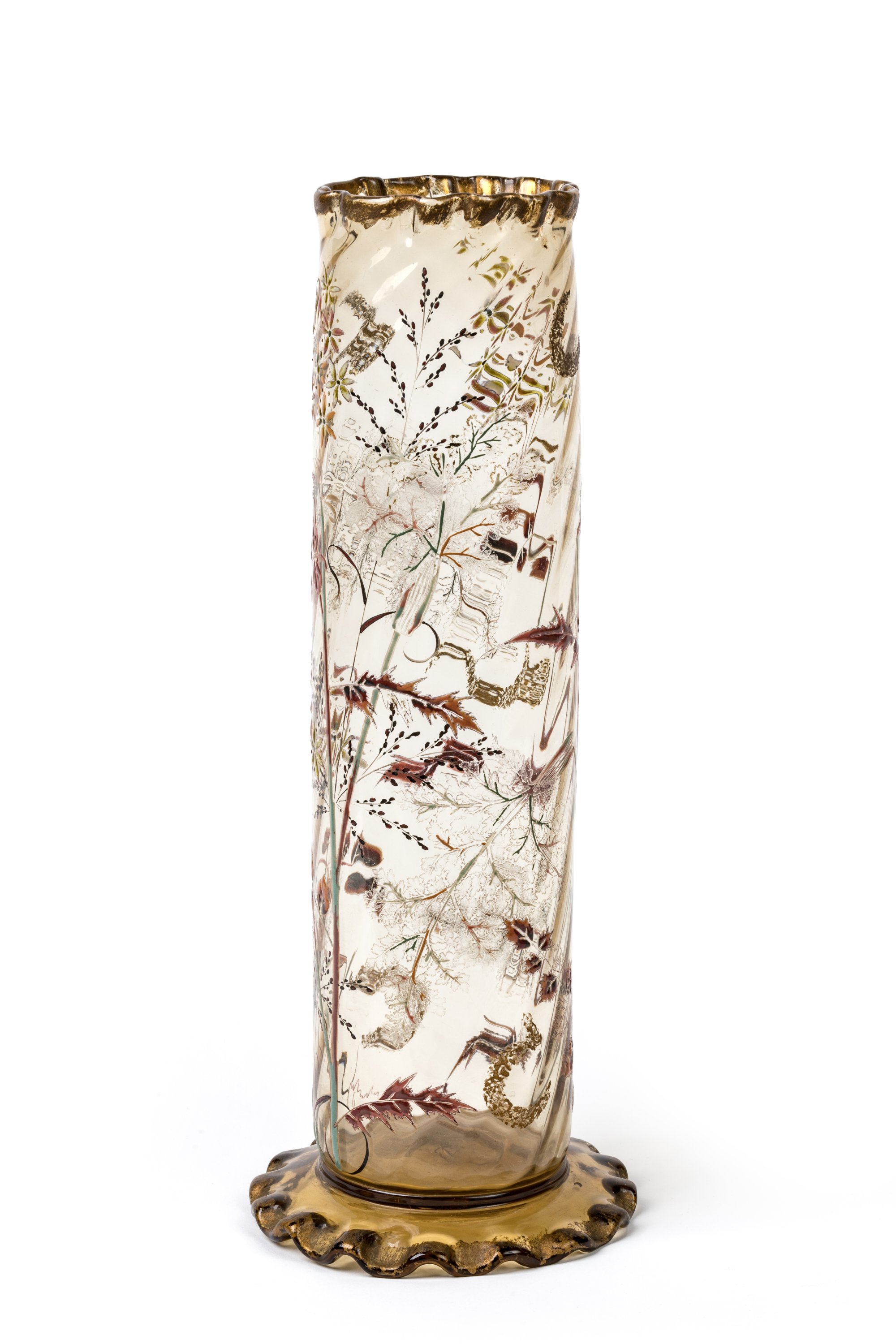 en verre ambré, soufflé, pincé et doré. Le décor végétal émaillé figure des feuilles de fougère et fleurs des champs. La base circulaire festonnée.