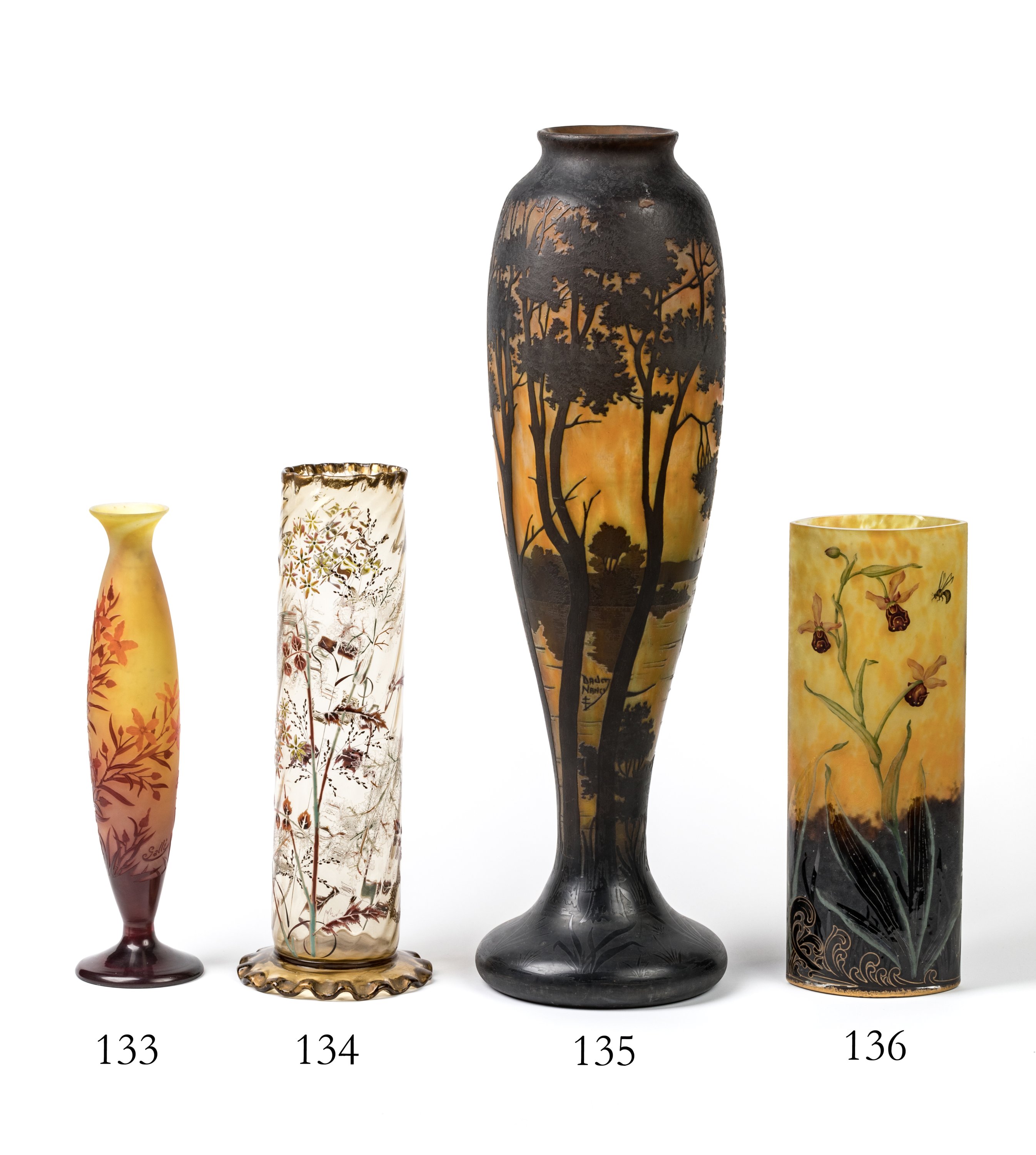 An amber glass vase by Emile Gallé decorated with fern leaves and wild flowers and enhanced with gilding.