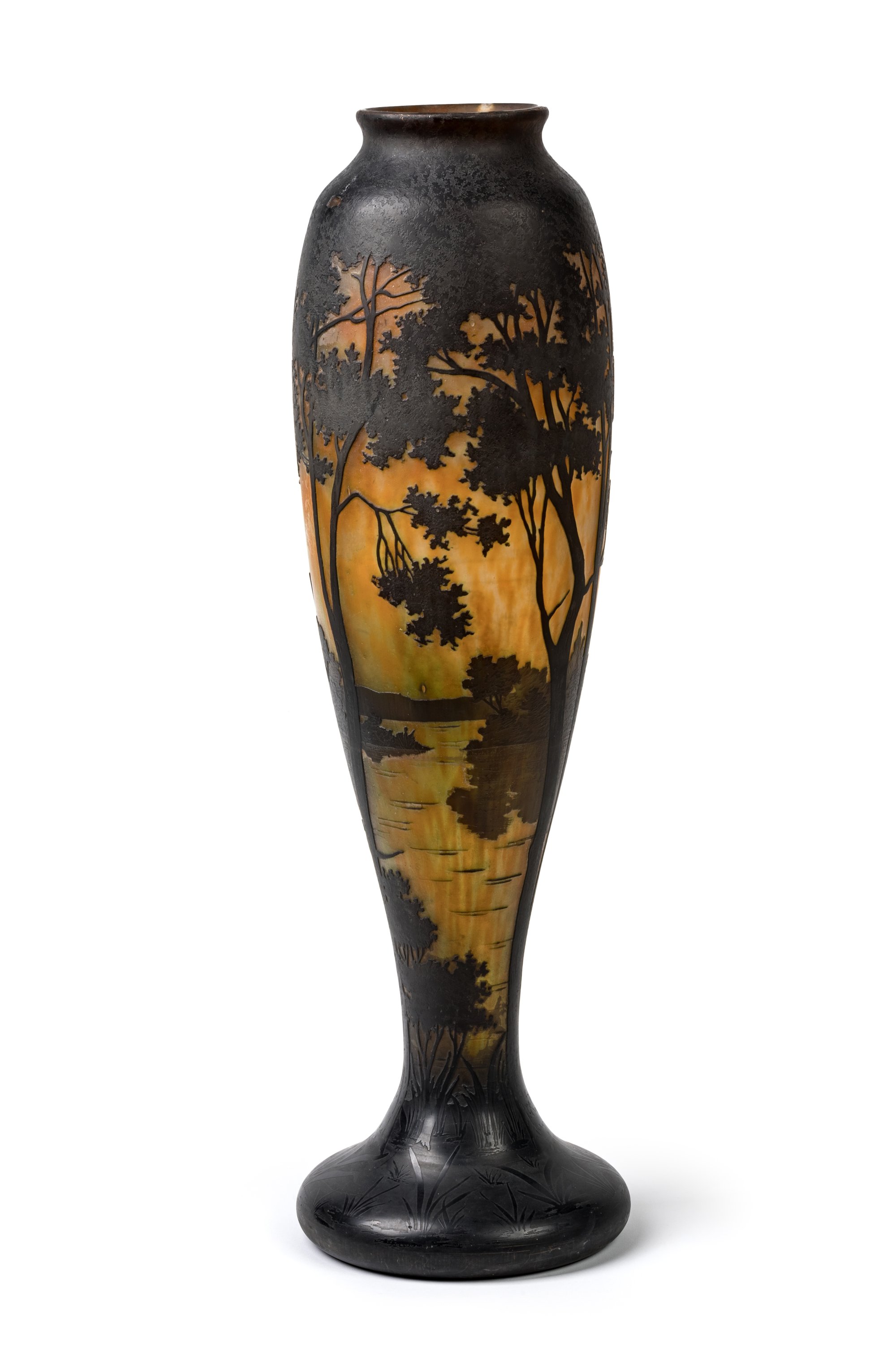 A ca. 1910 orange and brown glass baluster vase by Daum Nancy decorated with a lake landscape.