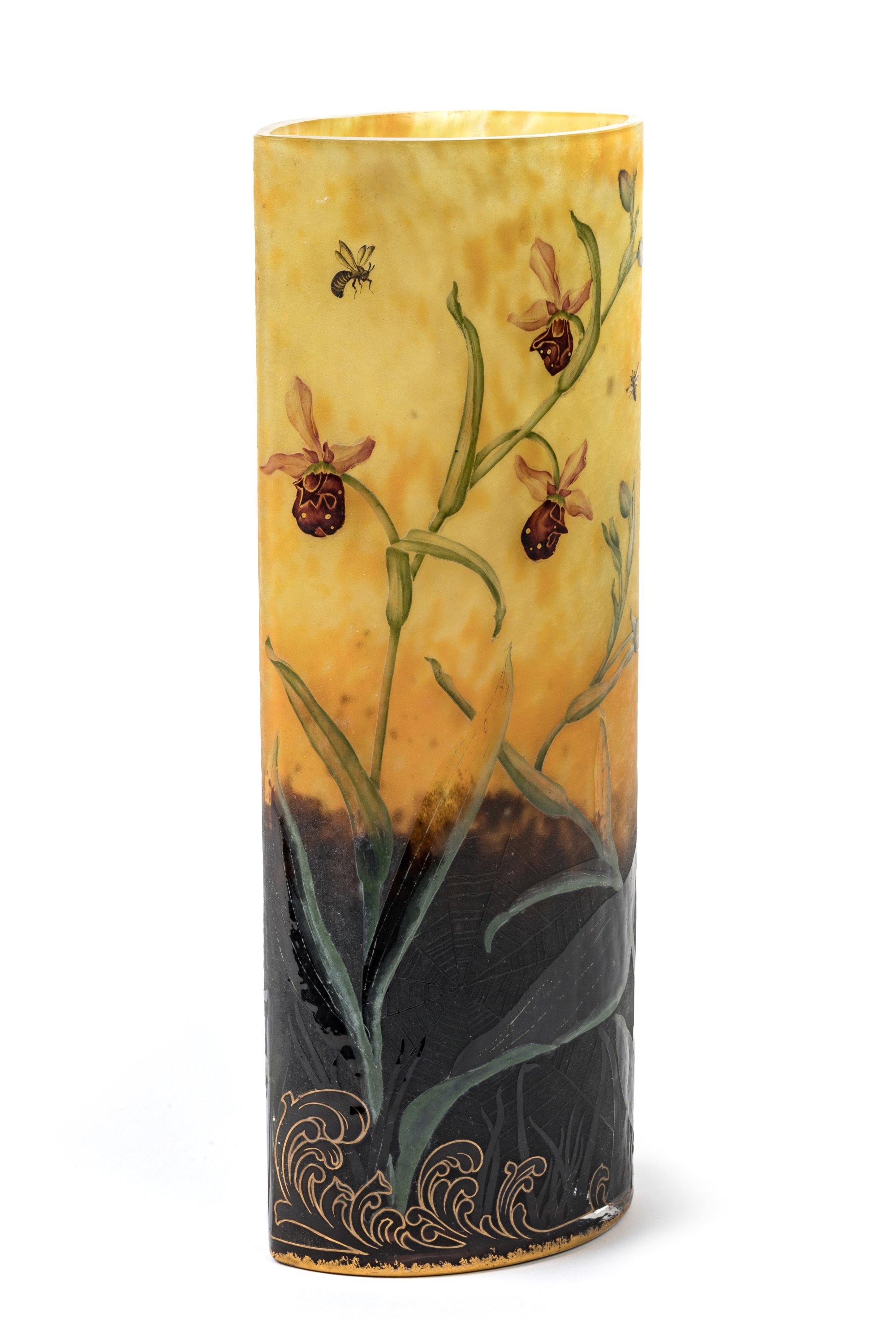 A yellow glass vase by Daum Nancy decorated with bee orchids and honeybees and enhanced with gilding.