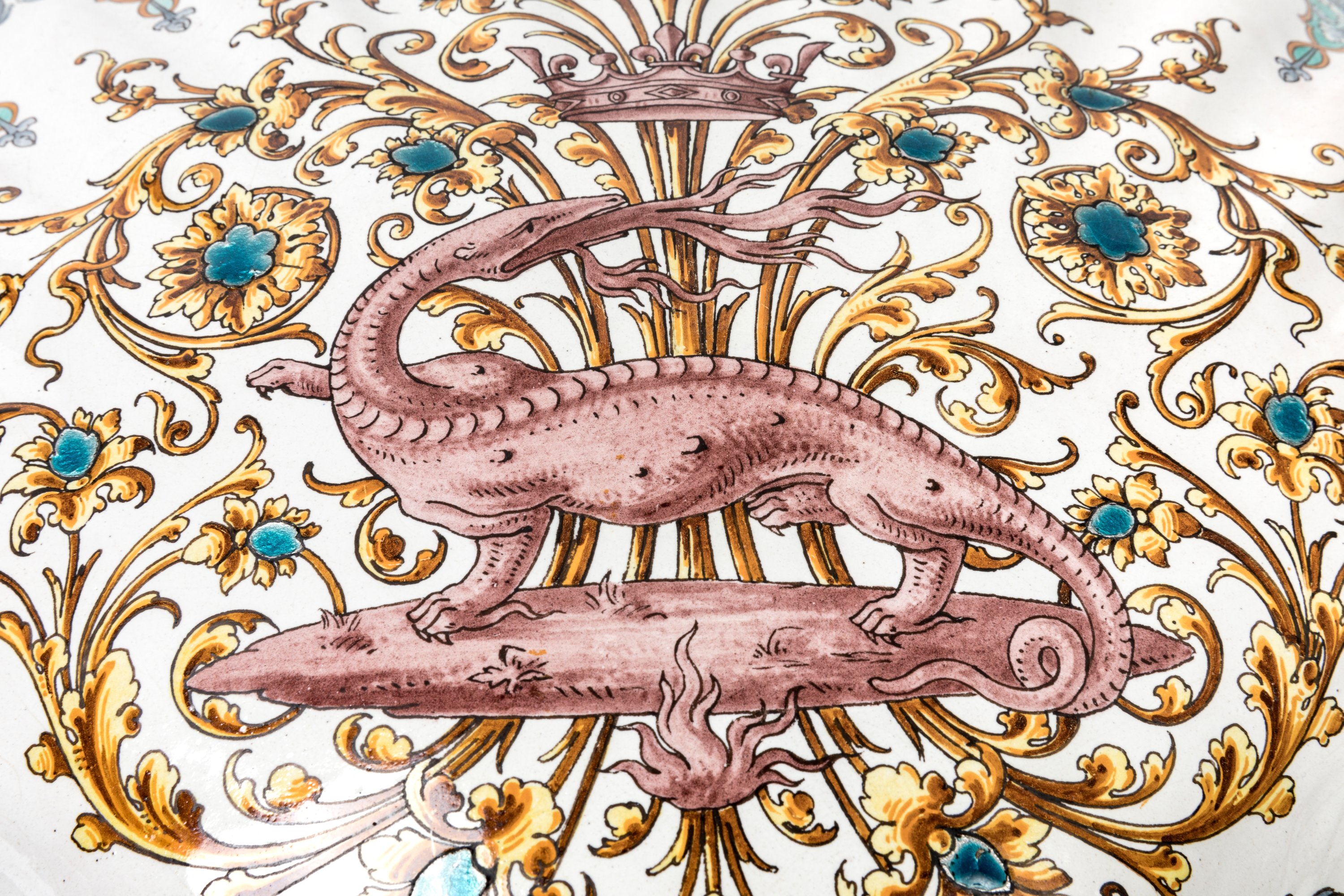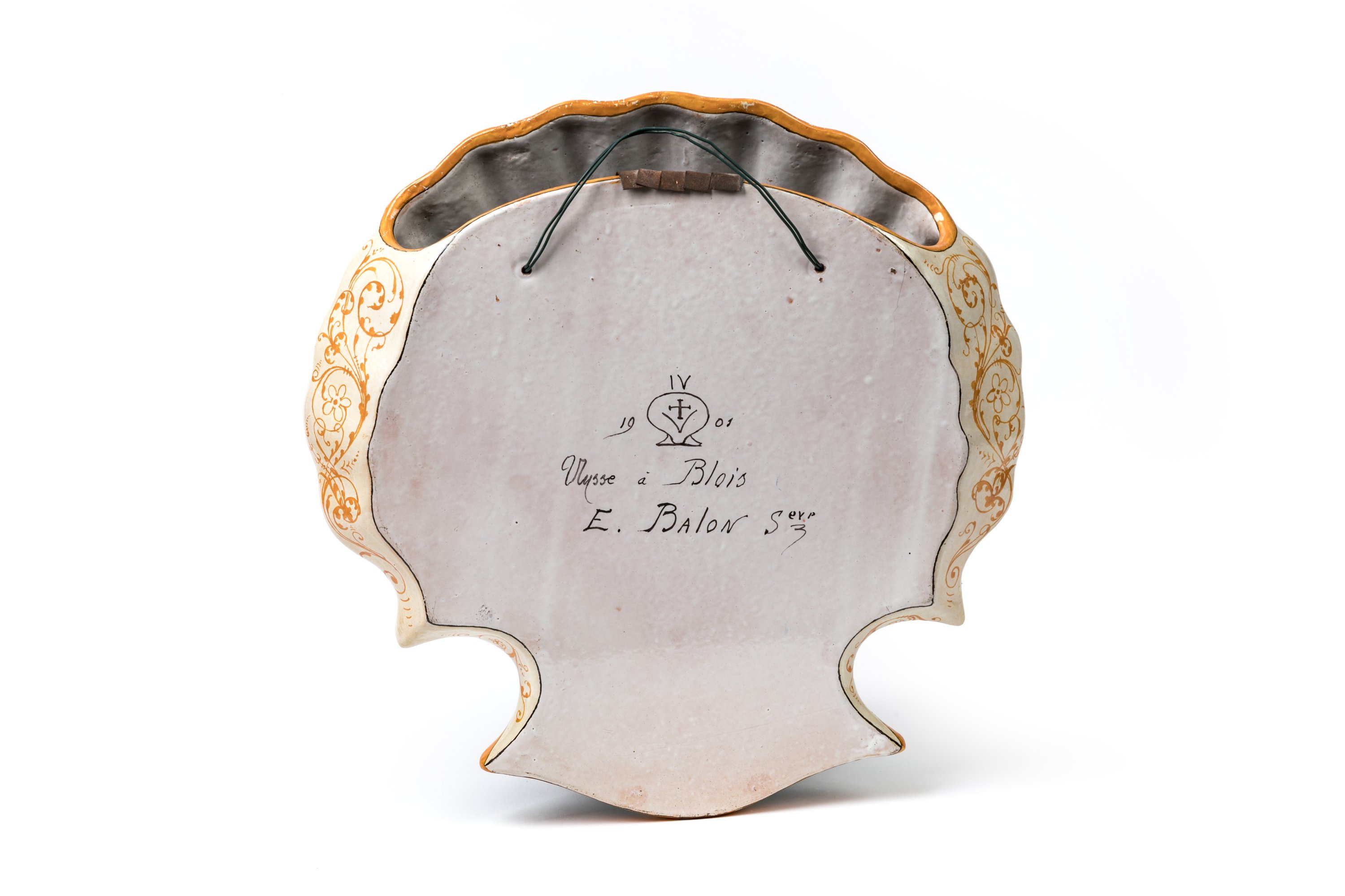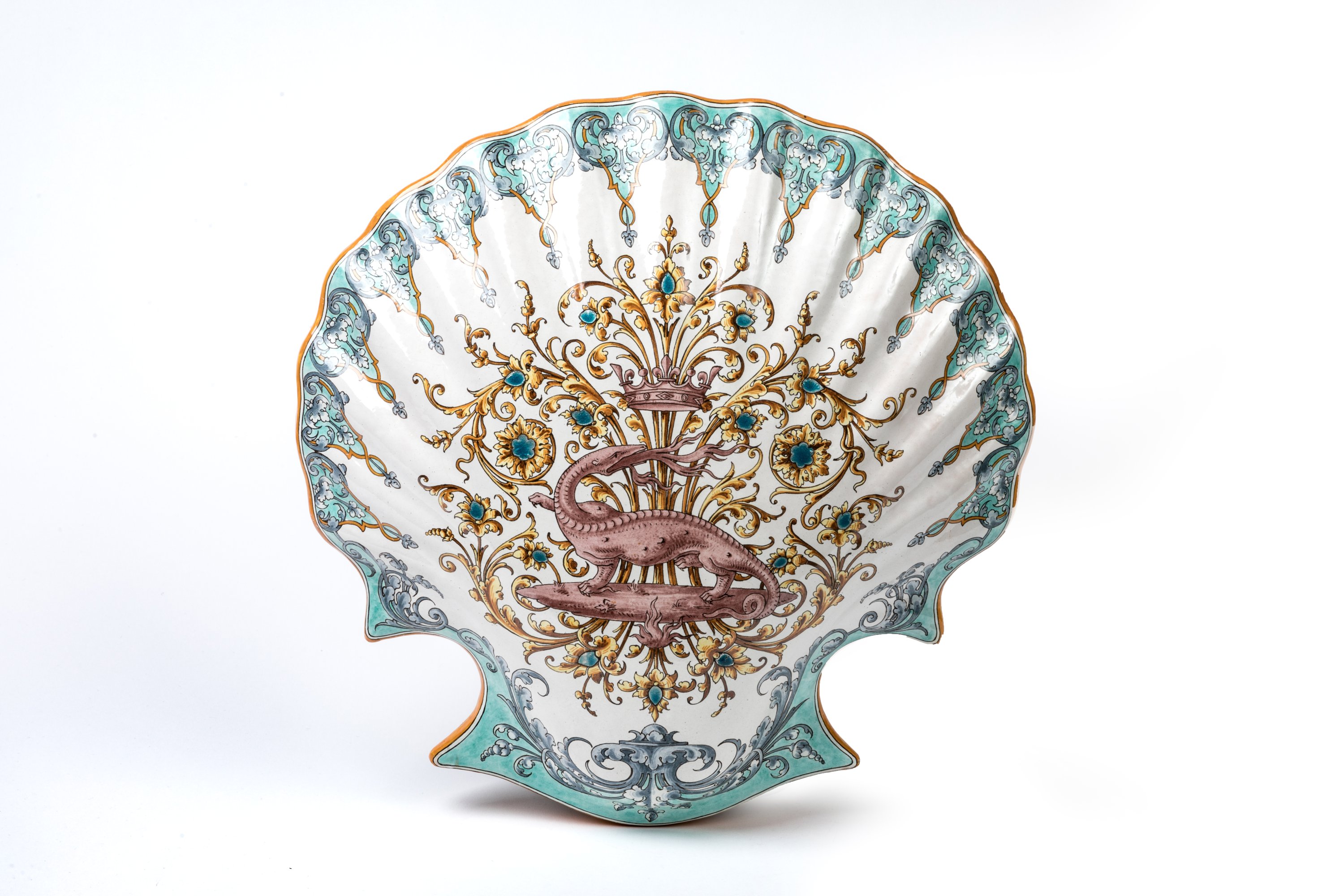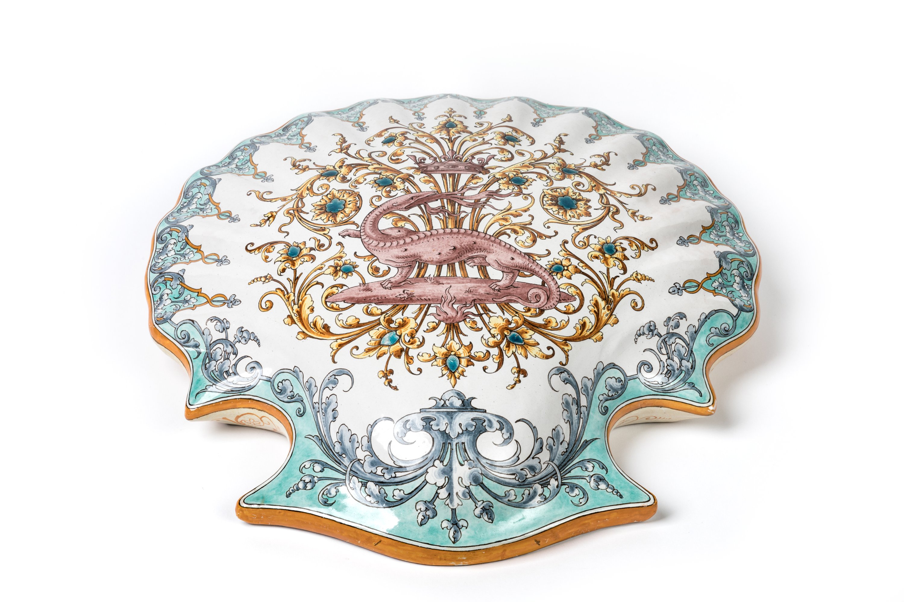 A 1901 polychrome majolica shell or bouquetiere by Emile Balon decorated with a crowned salamander.