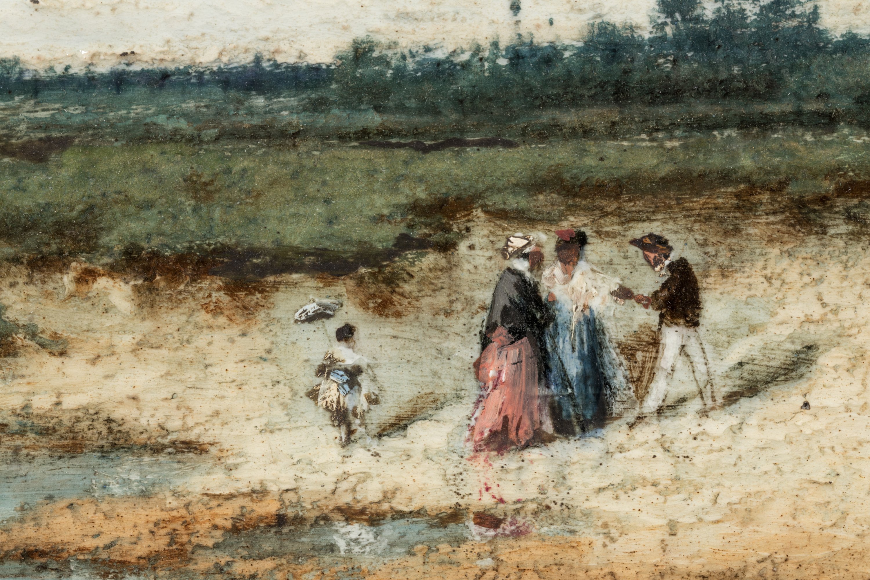 Importante plaque de faïence représentant une famille sur une plage de sable au bord d'une rivière.