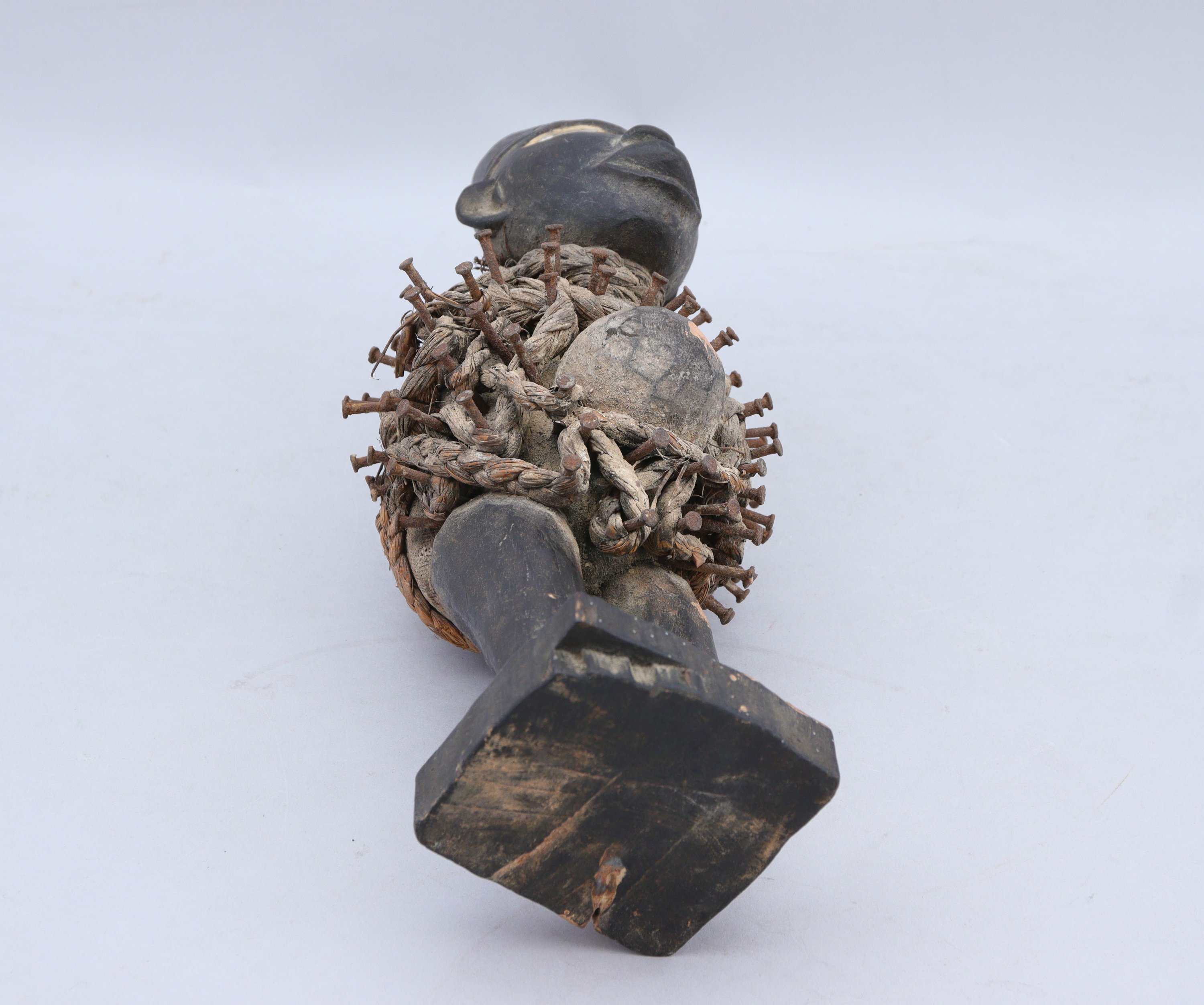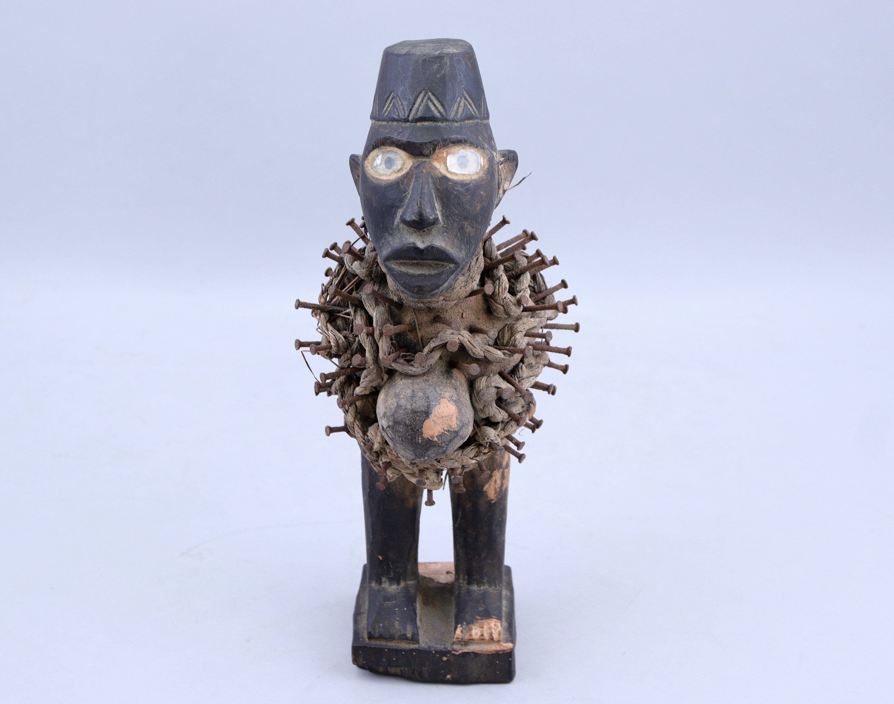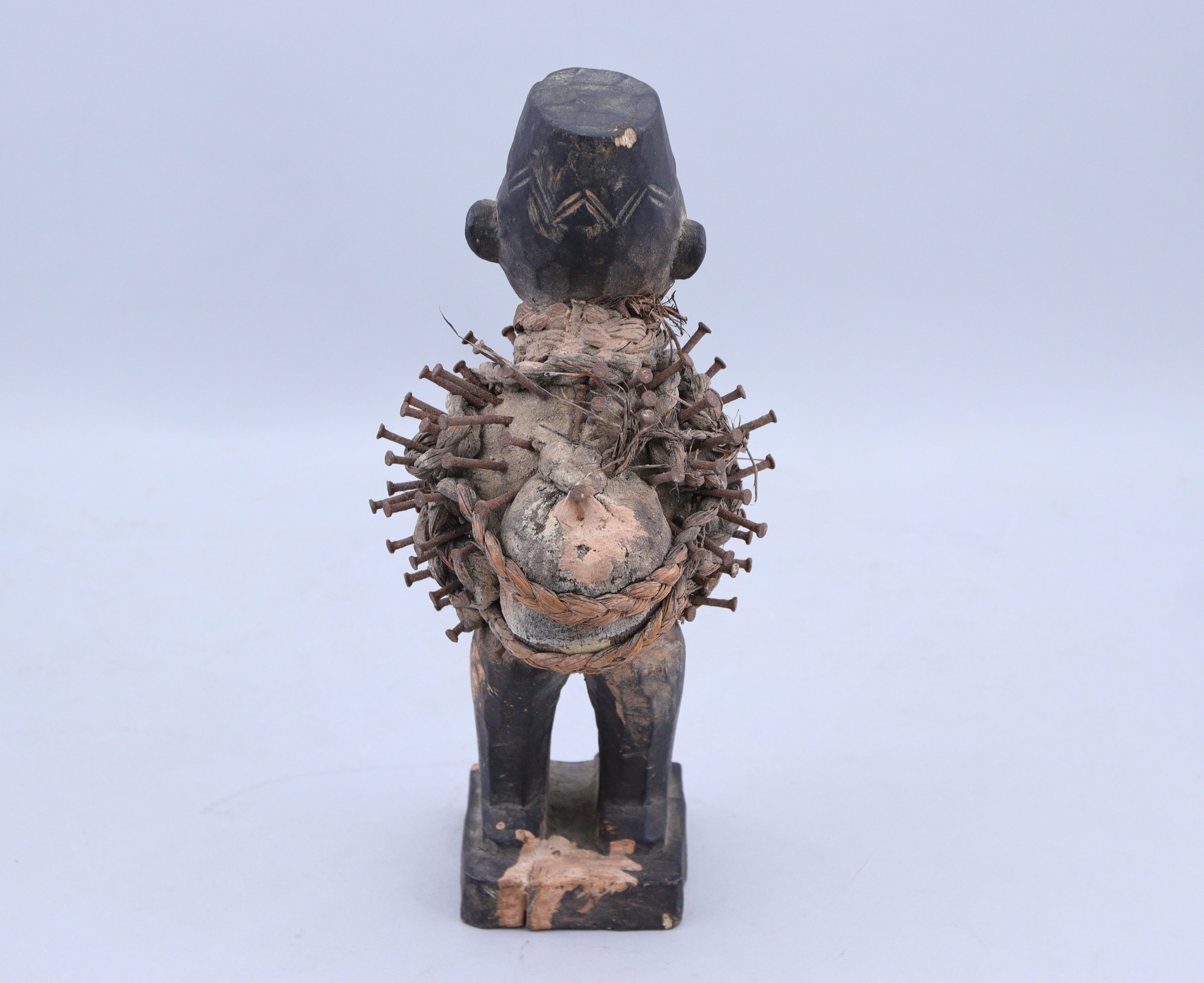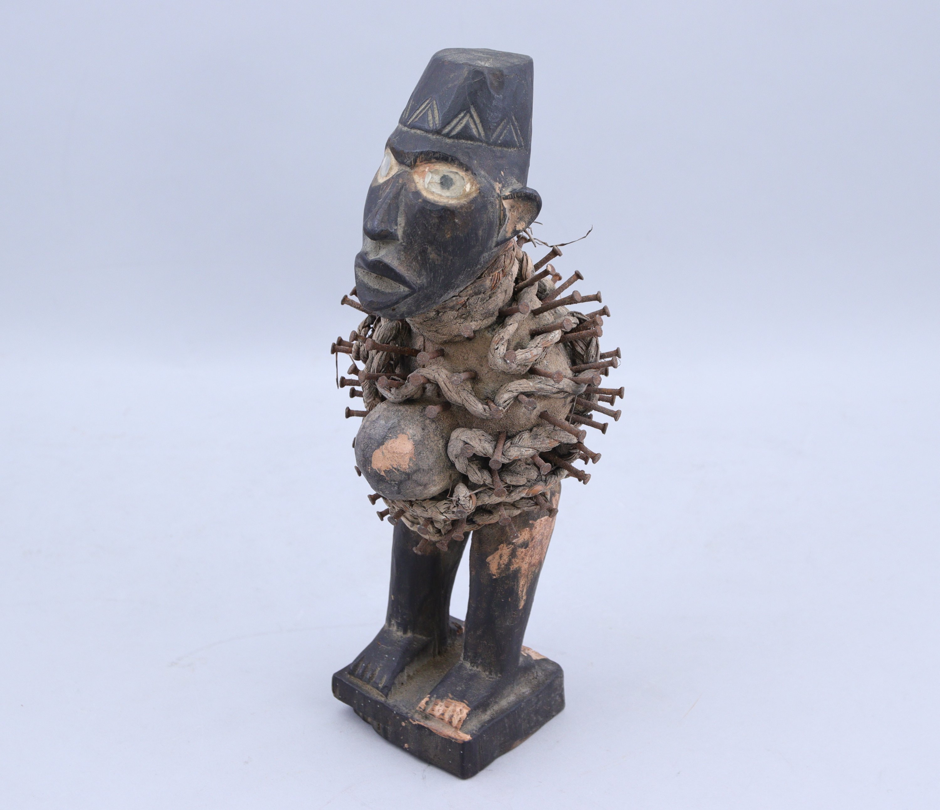 représentant un personnage debout sur un socle rectangulaire, la tête coiffée dun couvre-chef et les yeux recouverts de verre. Le torse est transpercé de clous de fer, chaque cloutage effectué par le Nganga (forgeron-sorcier) est la mémoire dun sort relié à une action particulière servant à la protection.