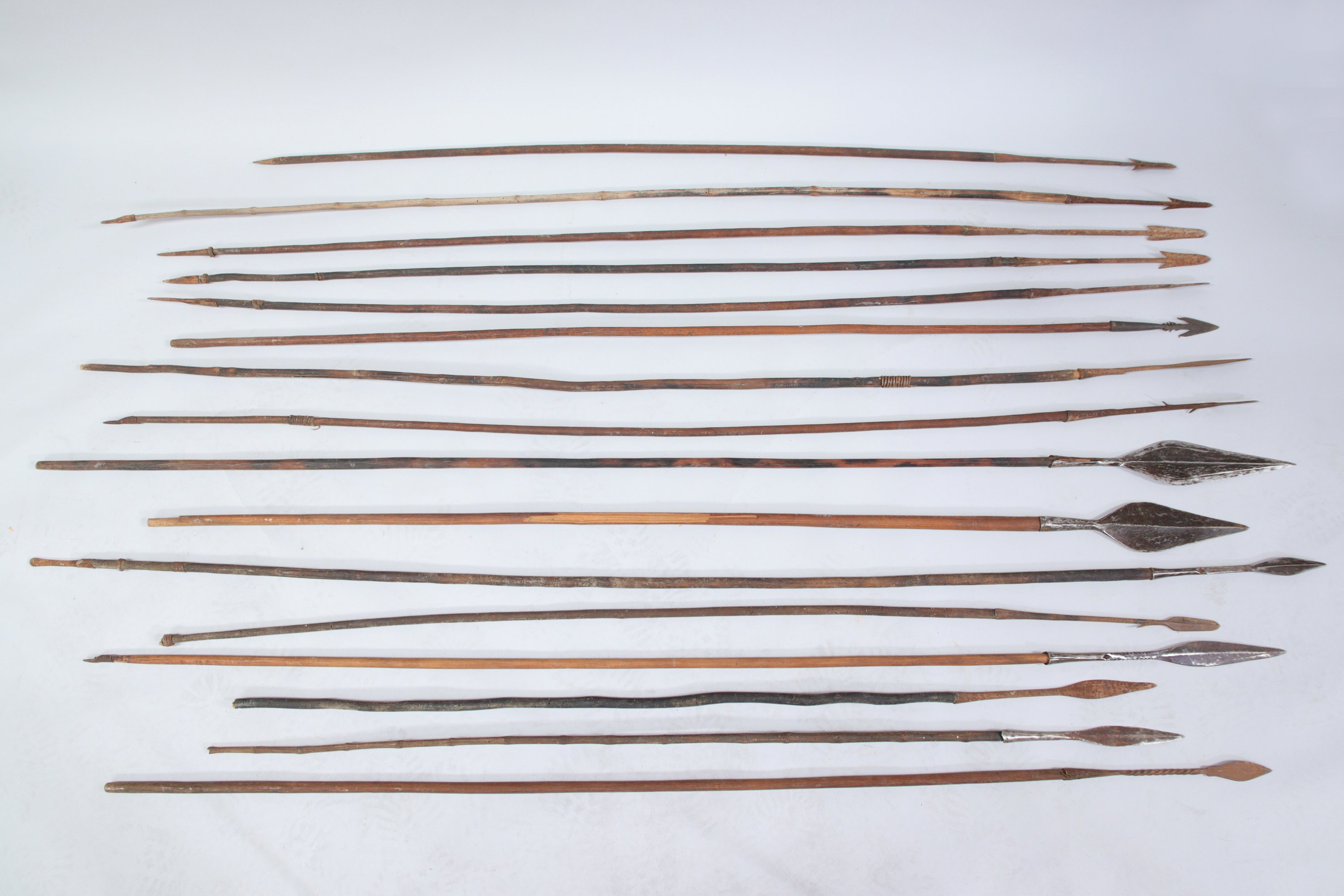 comprenant seize lances ou armes de jet à pointes de fer parfois torsadé et hampes de bois légers divers réunies dans une gaine d'osier tressée.