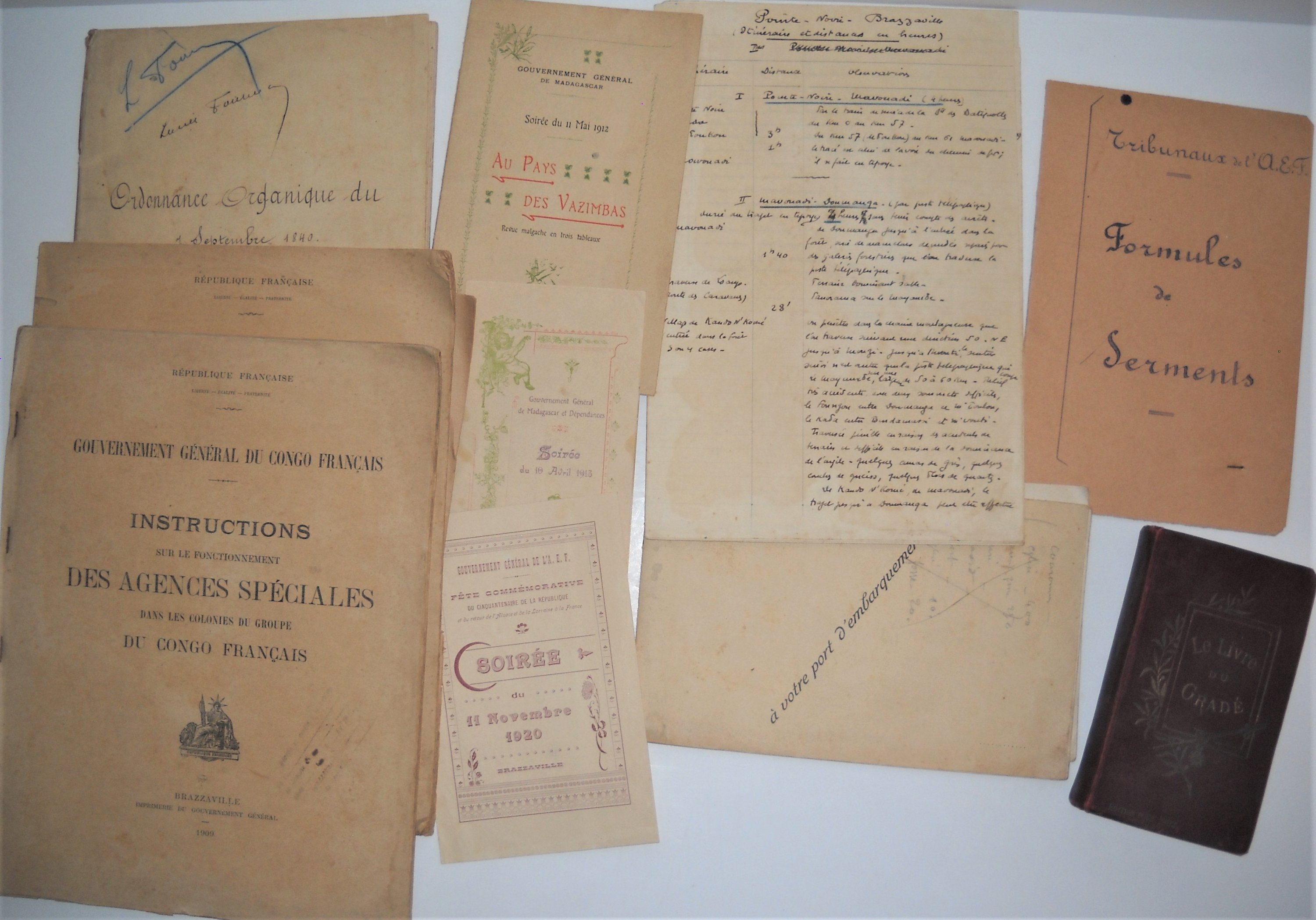 Formulaire de serment de la cour dappel et tribunaux de Brazzaville (A.E.F.) ; Cahier manuscrit « Pointe-Noire, Brazzaville, itinéraire et distances en heures », 17 pp. in-4 ; Note tapuscrite « Note sur les routes et les voies navigables de lOubangui-Chari », 1922, 18 pp. in-4 ; Copie du discours prononcé par le gouverneur général Piquié à loccasion du chemin de fer de Brickaville à Tamatave (Madagascar) ; Copie manuscrite de l« Ordonnance organique du 7 septembre 1840 » ;