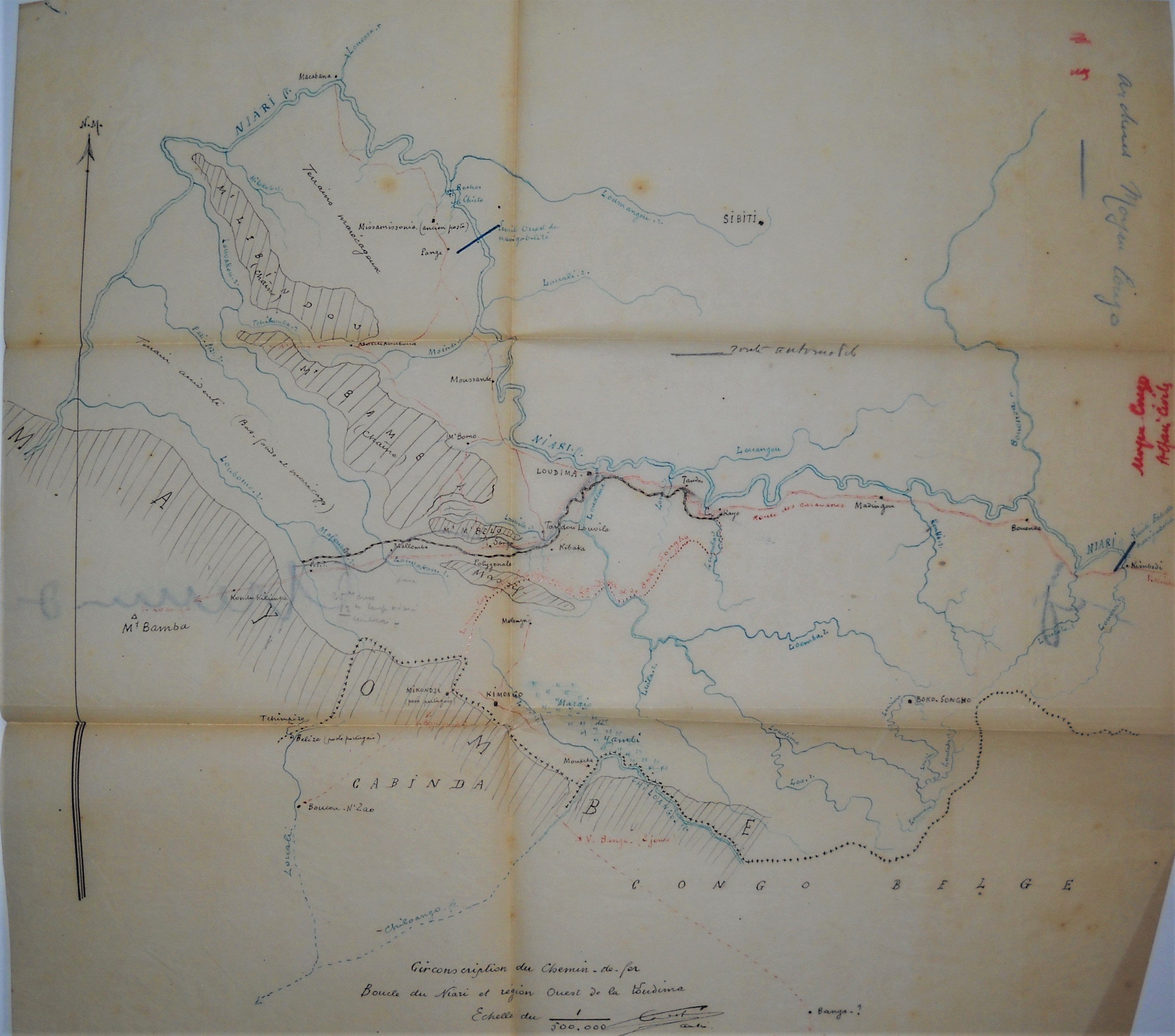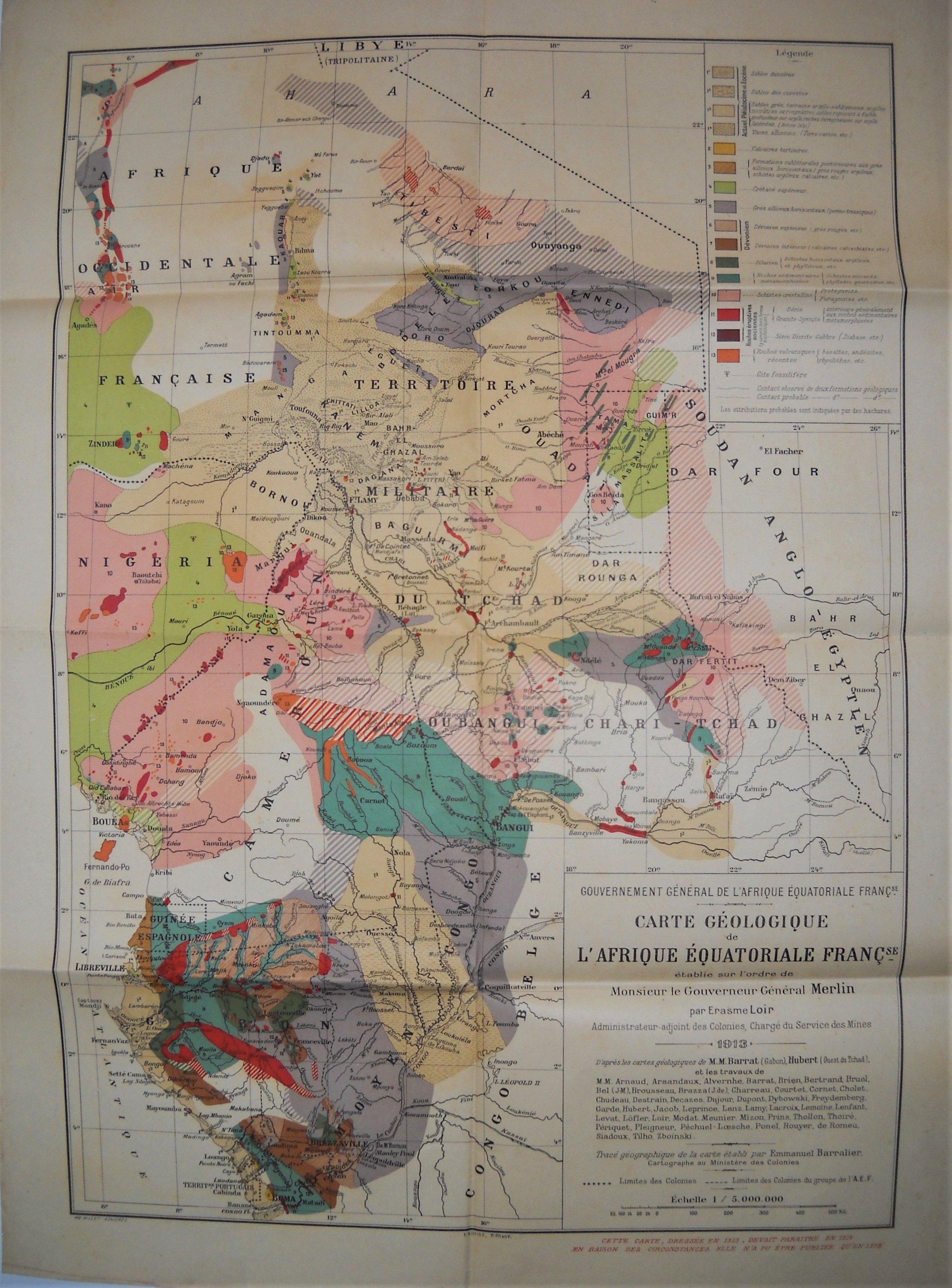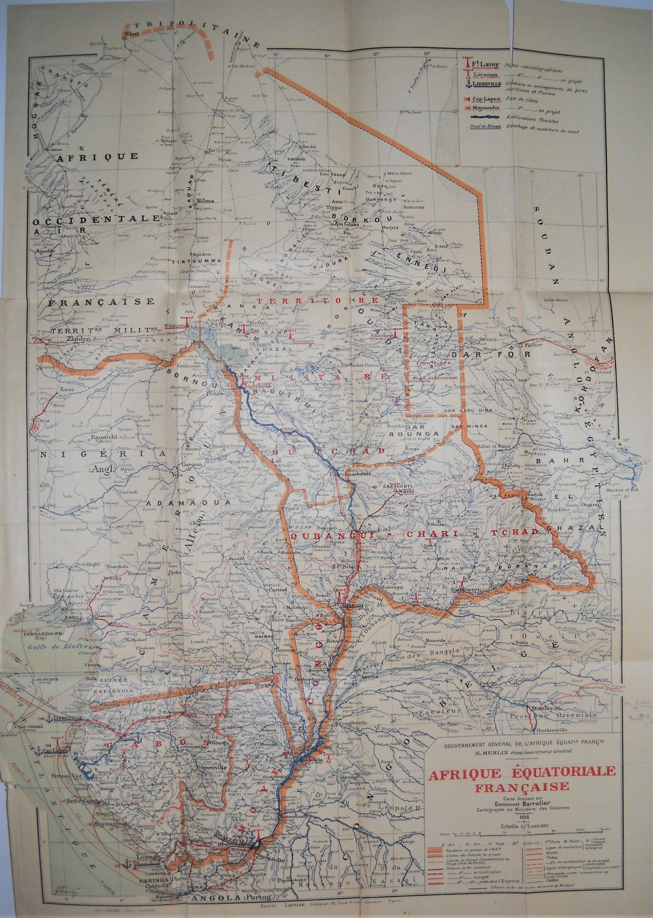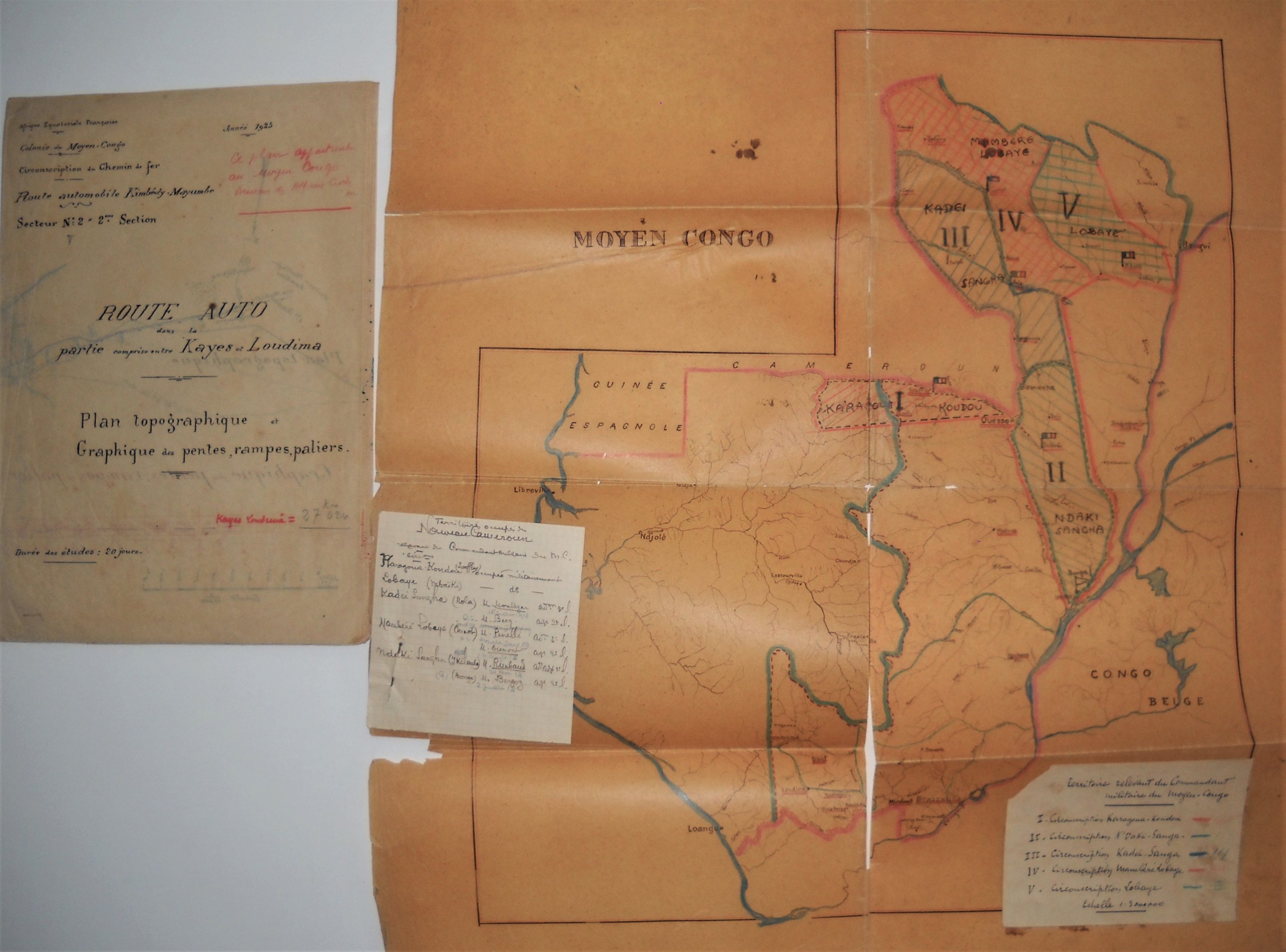 15 cartes dépliantes imprimées ou dessinées sur calque, tous formats dont: carte du territoire militaire du Tchad ; 2 cartes schématiques des concessions de lAfrique équatoriale française, 1908 et 1912 ; Carte du gouvernement général de lAfrique équatoriale française, 1913 ; Carte géologique de lAfrique équatoriale française, 1913 ; Carte de lOubangui-Chari ; Carte du Gabon ; Carte du territoire relevant du commandant militaire du Moyen Congo ; Circonscription du chemin de fer, boucle du Niai et région Ouest de la Loudima (Moyen Congo) ; Route auto dans la partie comprise entre Kayes et Loudima (Moyen Congo), plan topographique et graphique des pentes, rampes et paliers, 1925 ; Carte des permis et concessions du Moyen Congo ; Carte de la tournée du 11 au 22 février 1914, Libreville, 16 avril 1914 ; etc.