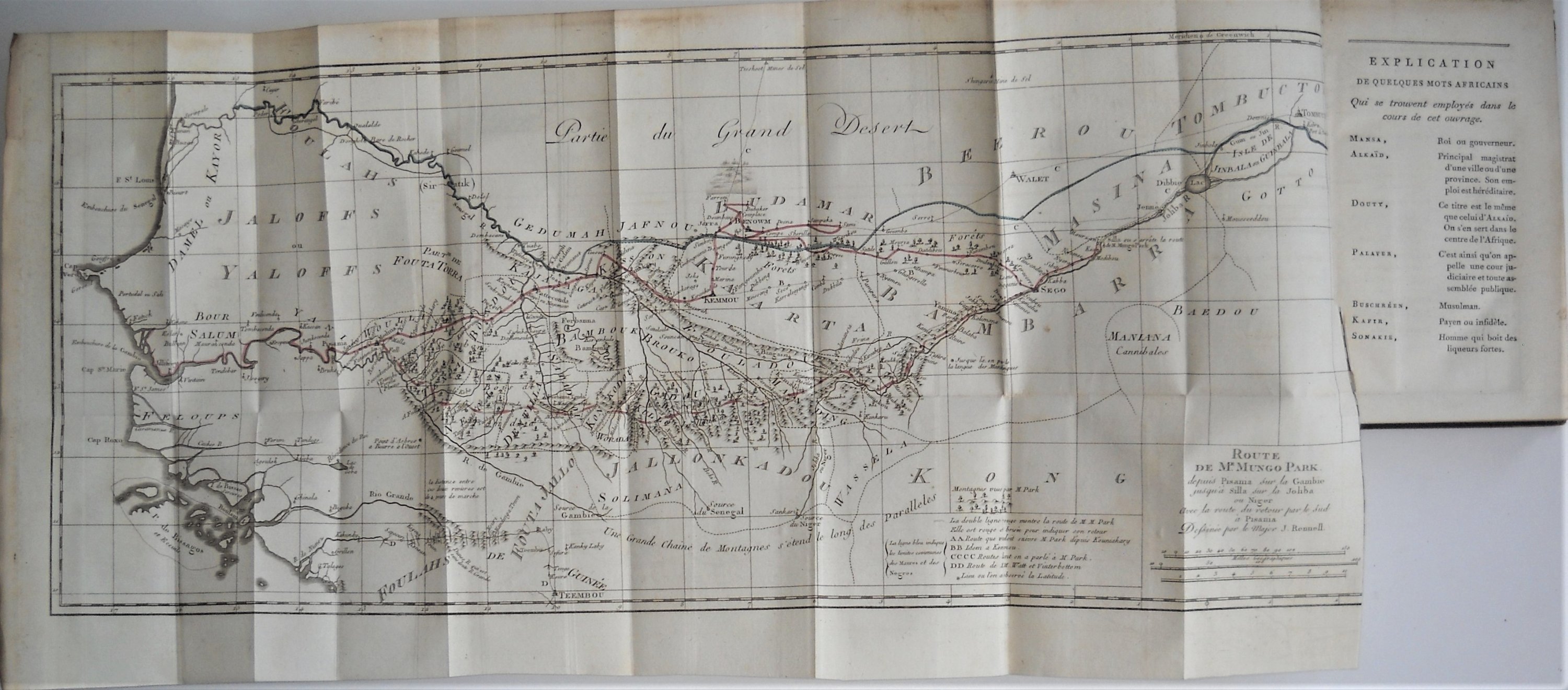 Tome I: frontispice, XII-411 pp. avec une carte dépliante (Route de Mungo Park de Pisania jusqu'à Silla) et 3 planches hors texte ;