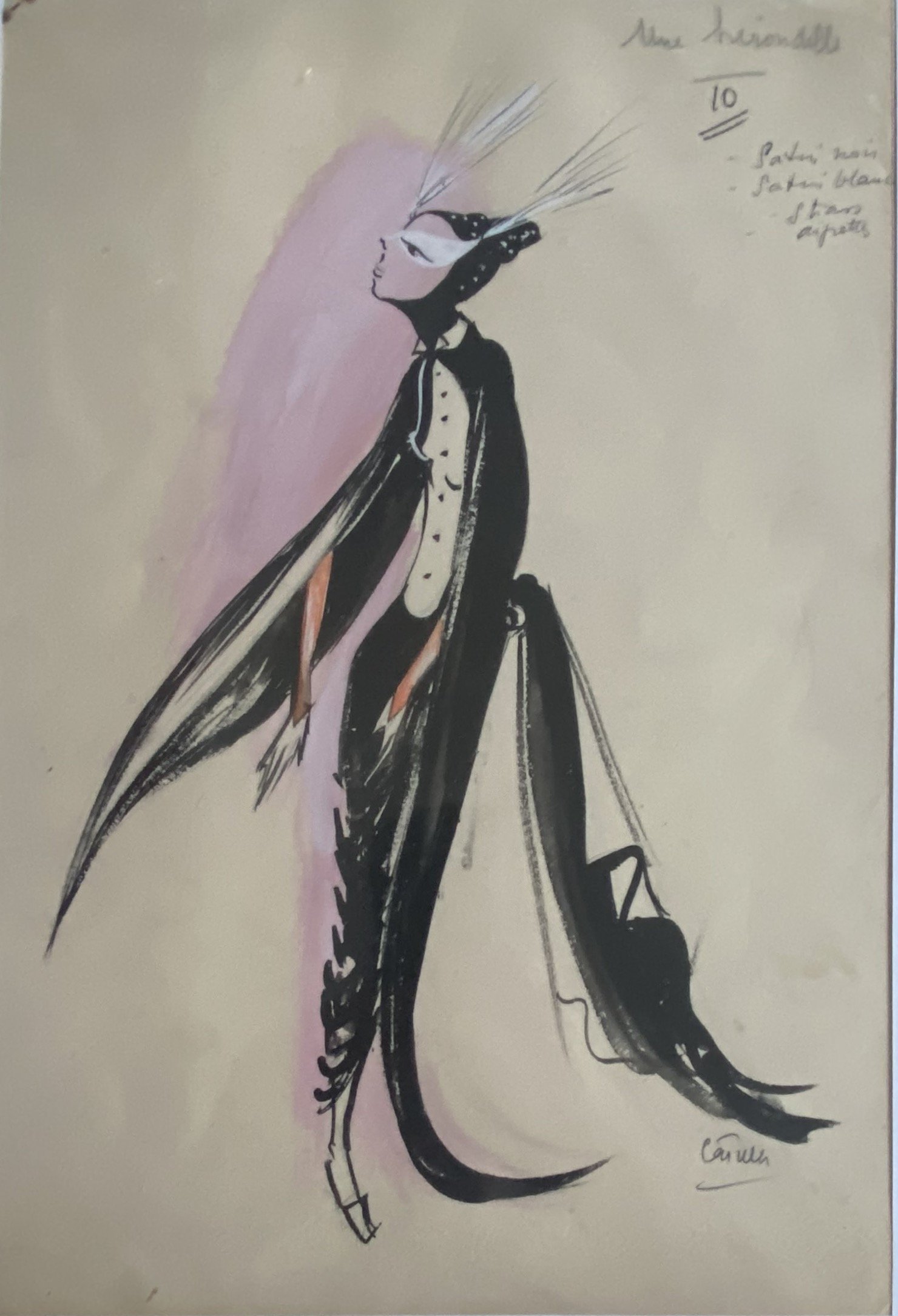 Signée en bas à droite, titrée et annotée "10 / satin noir / satin blanc / strass (?) en haut à droite.