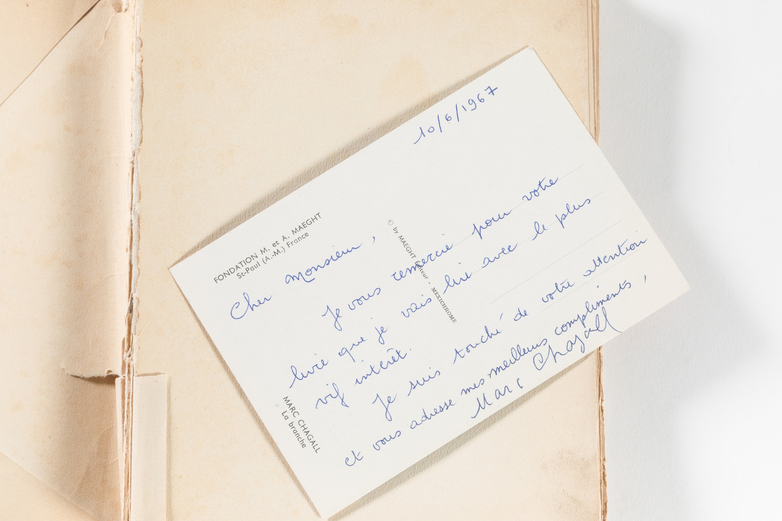 Joint dans l'exemplaire: une carte postale de la fondation Maeght représentant la "Branche" de Chagall, avec six lignes autographes du peintre adressées en remerciements à l'auteur René Schwob.