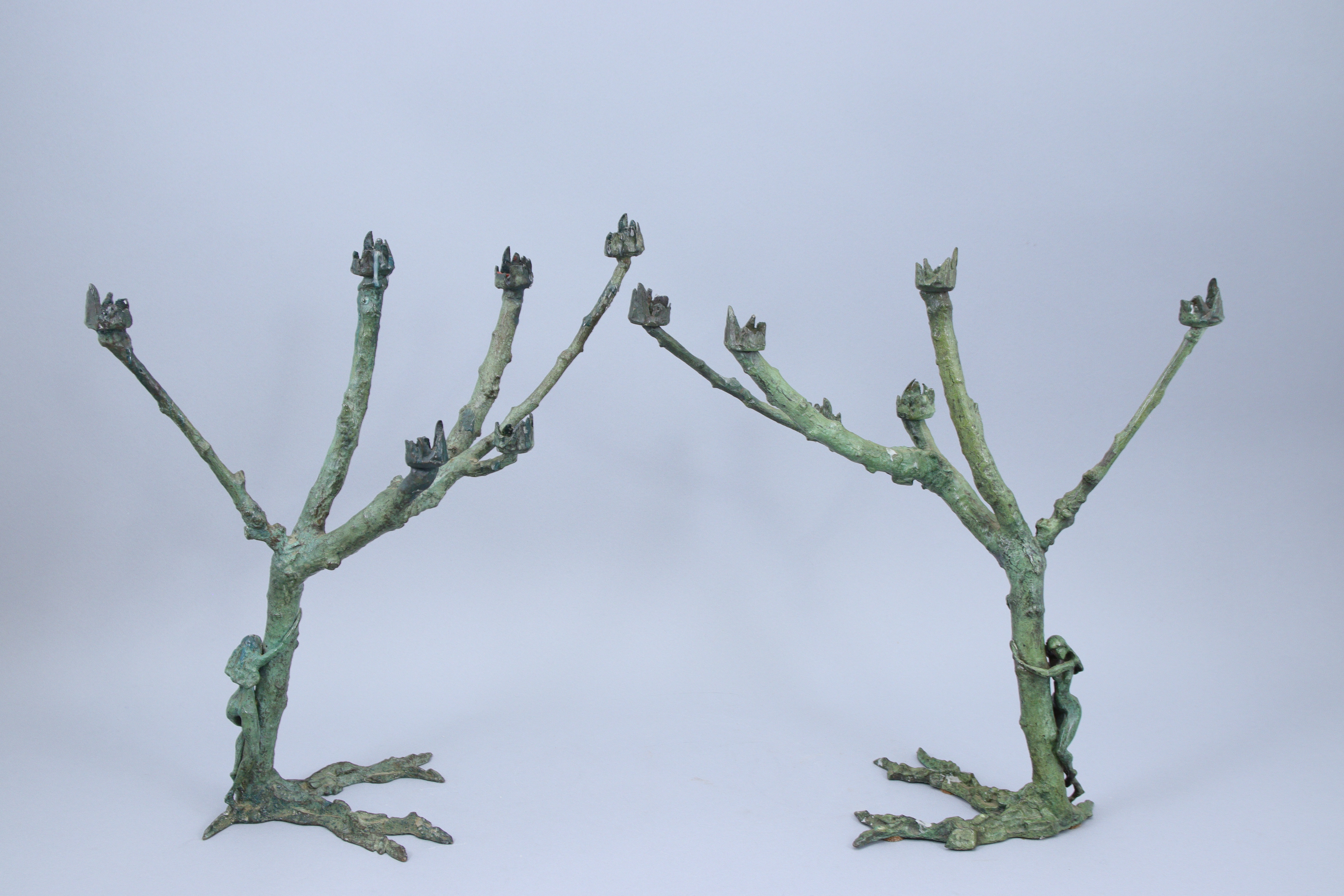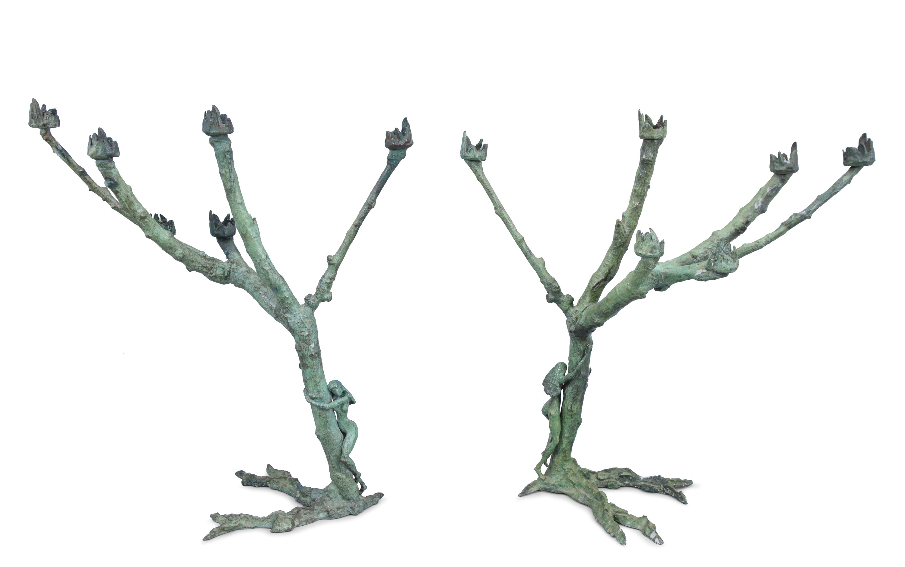 en bronze à patine verte, en forme d'arbre à six branches enlacé par une femme.