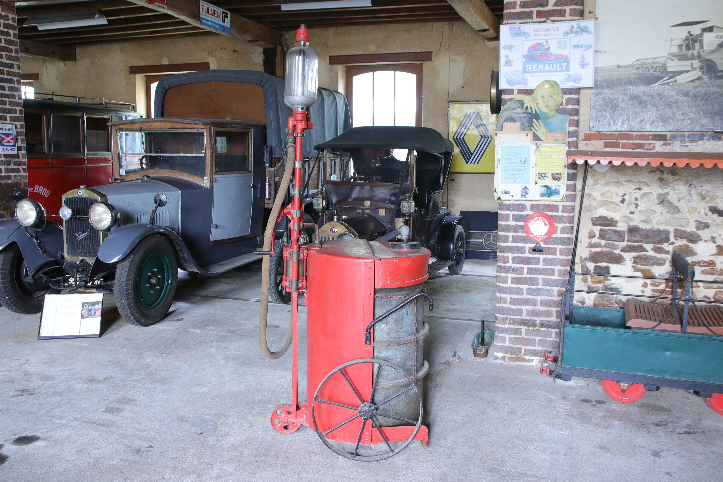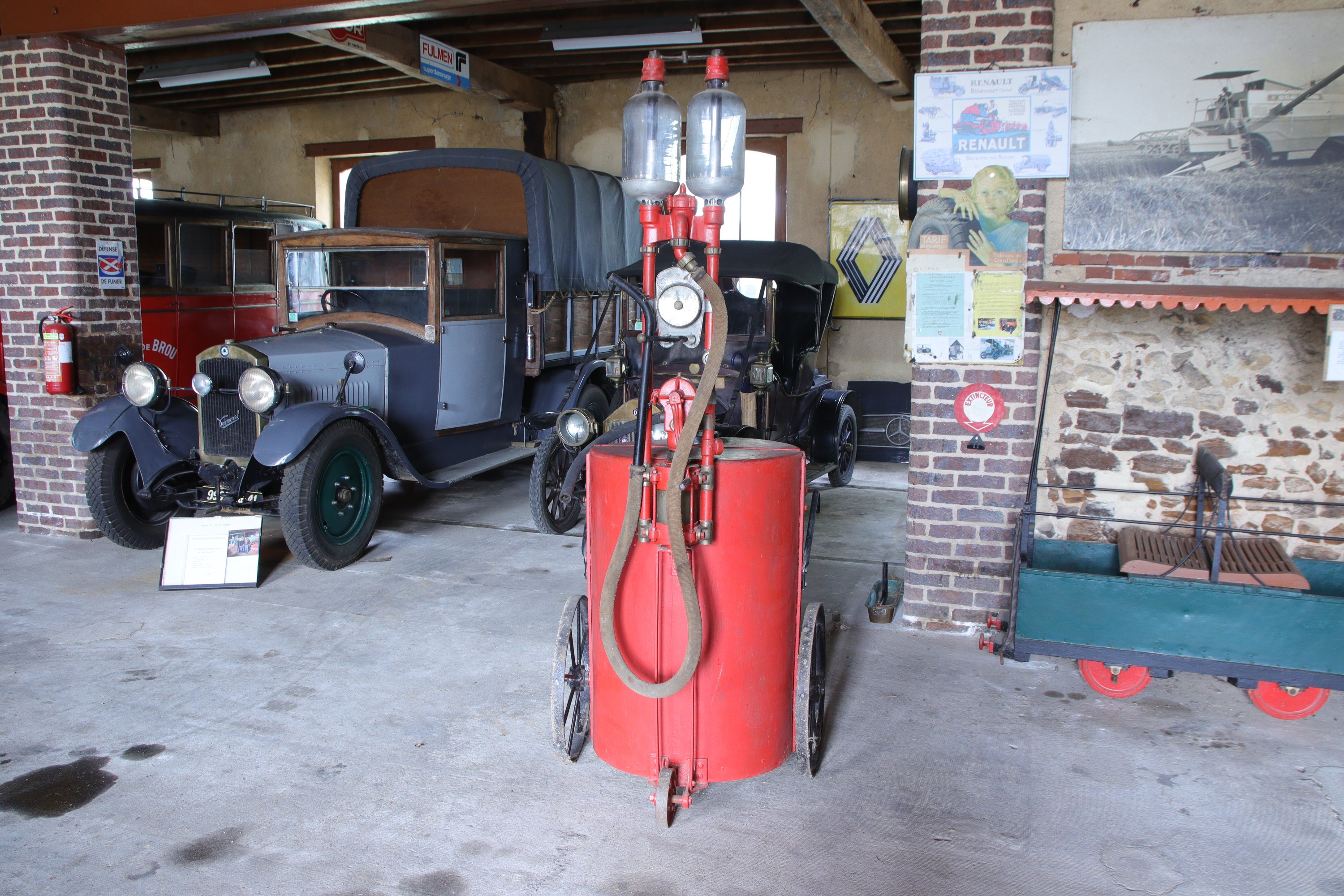 Ancienne pompe à essence à niveau visible, modèle « Rapide », avec son fût de 200L, montée sur roues.