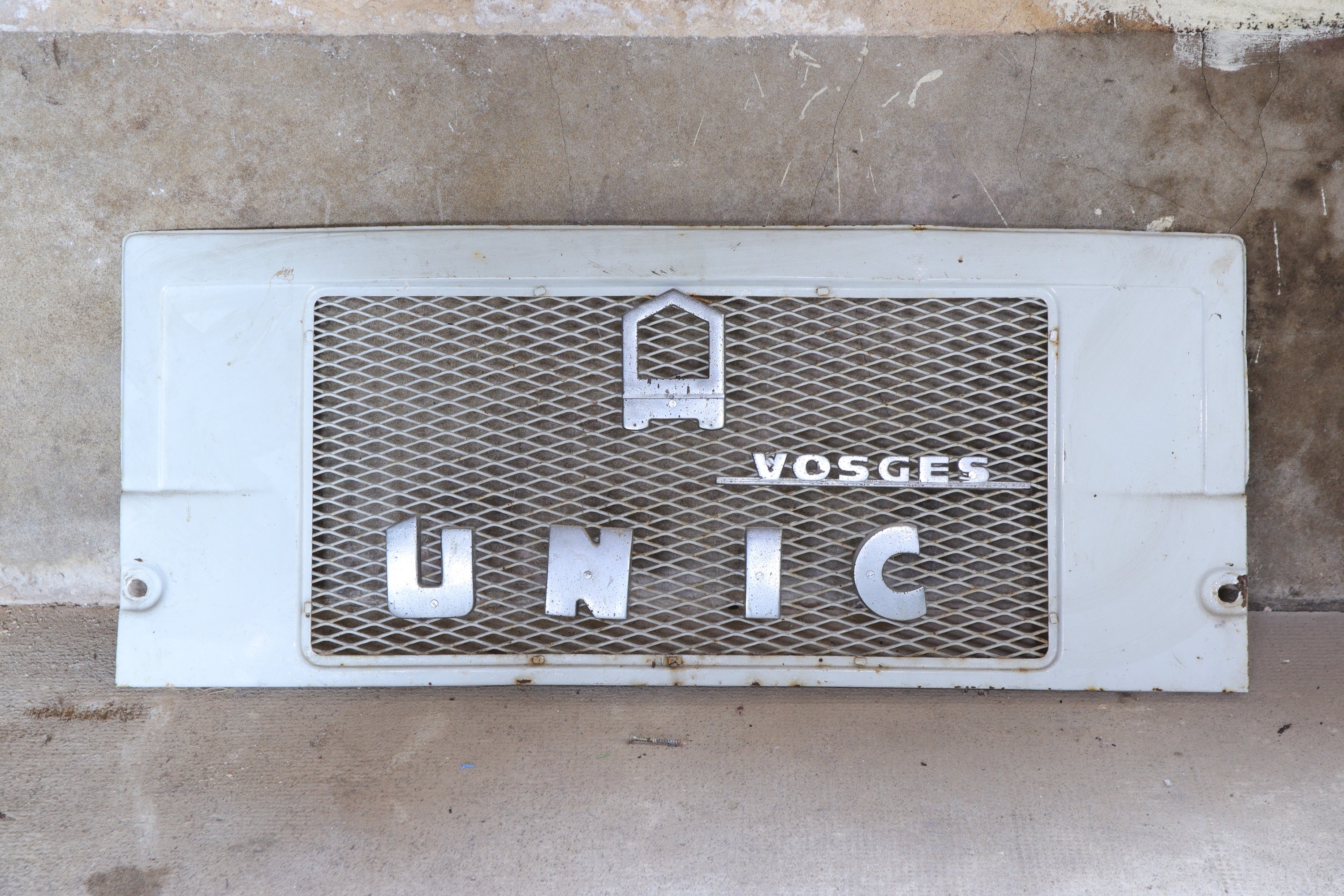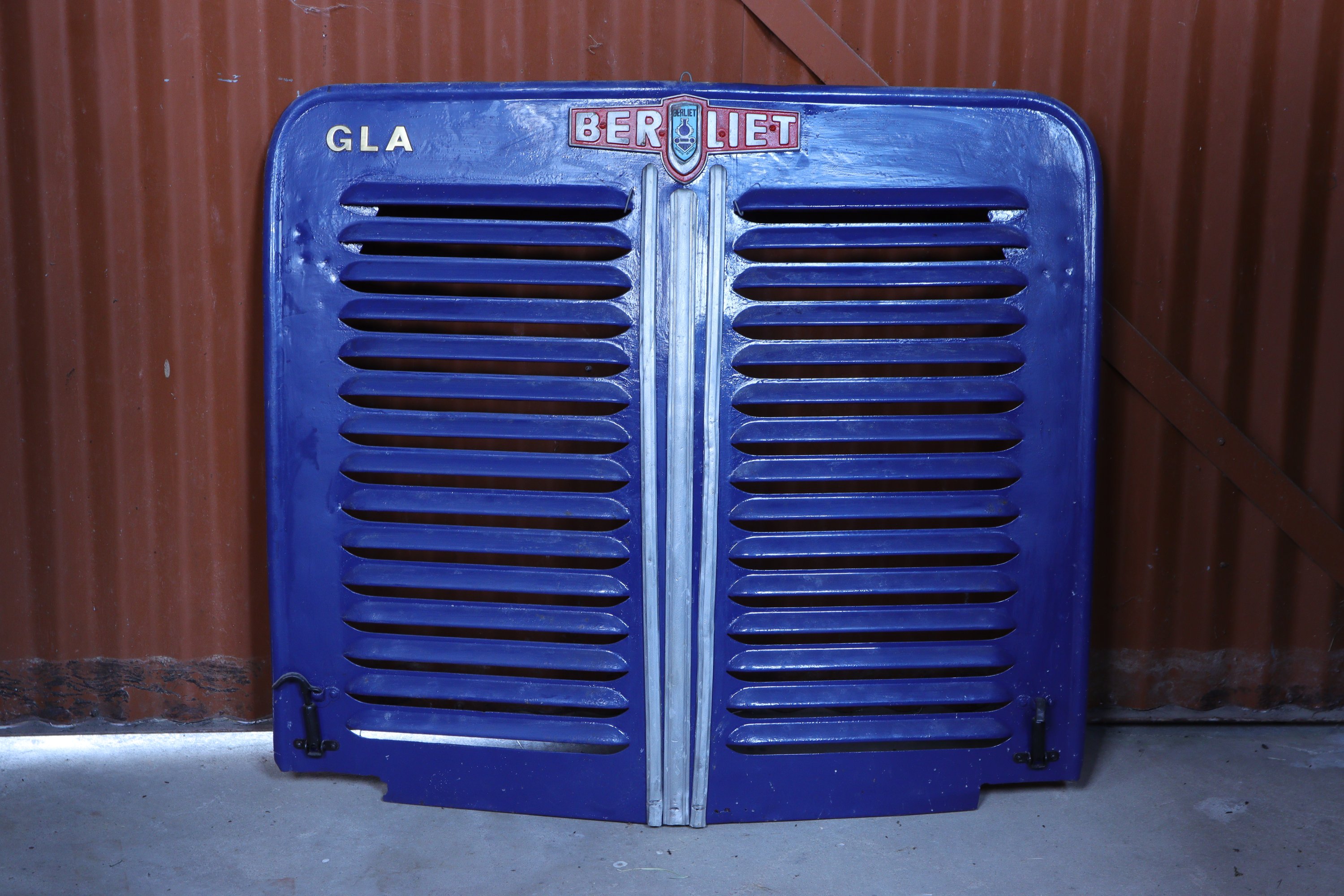 Deux calandres, l’une bleue, provenant d’un Berliet GLA, l’autre grise, provenant d’un Unic OM.