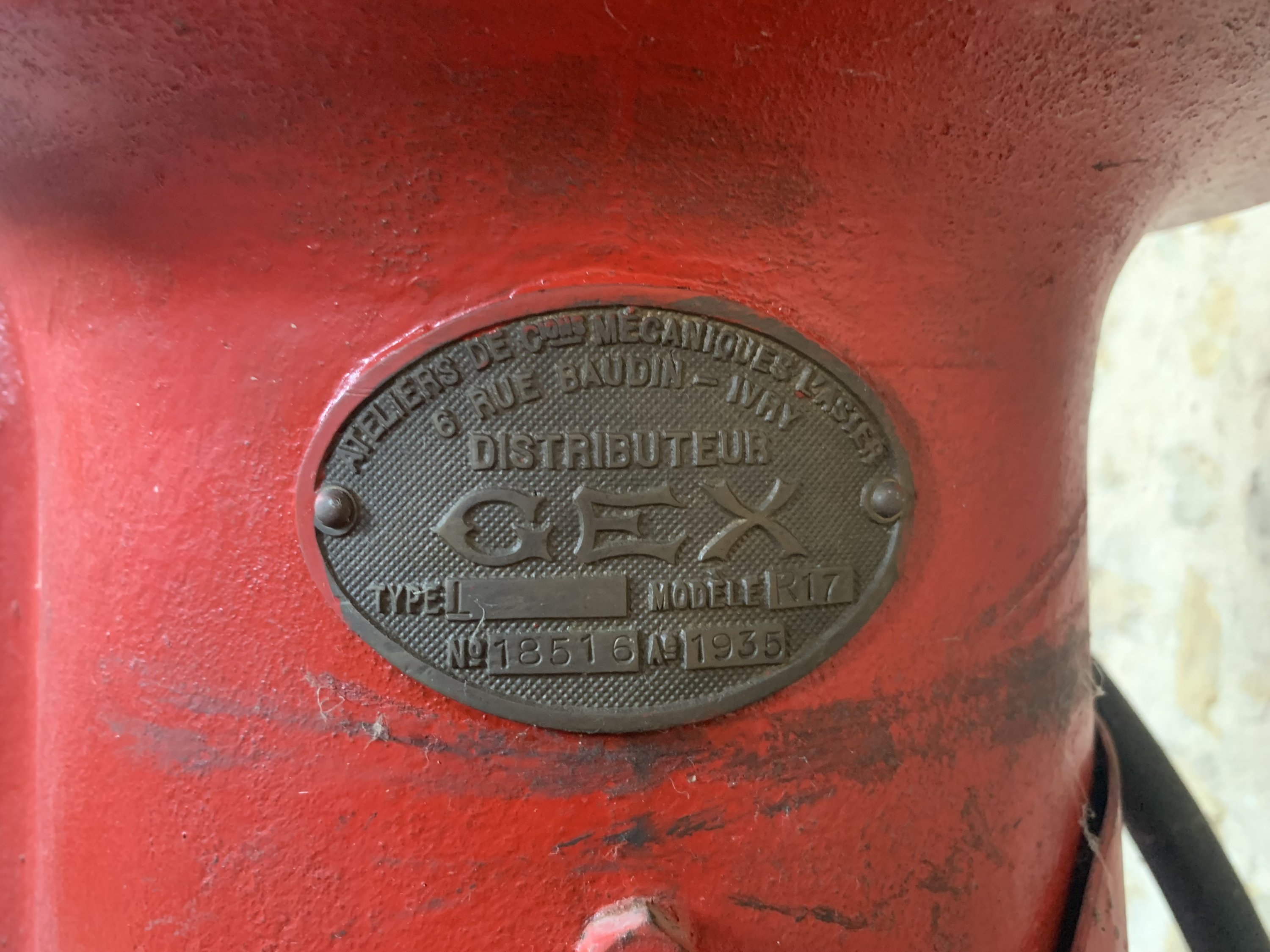 Ancienne pompe à essence à bouteilles à niveau visible, en fonte de fer signée et embossée GEX.