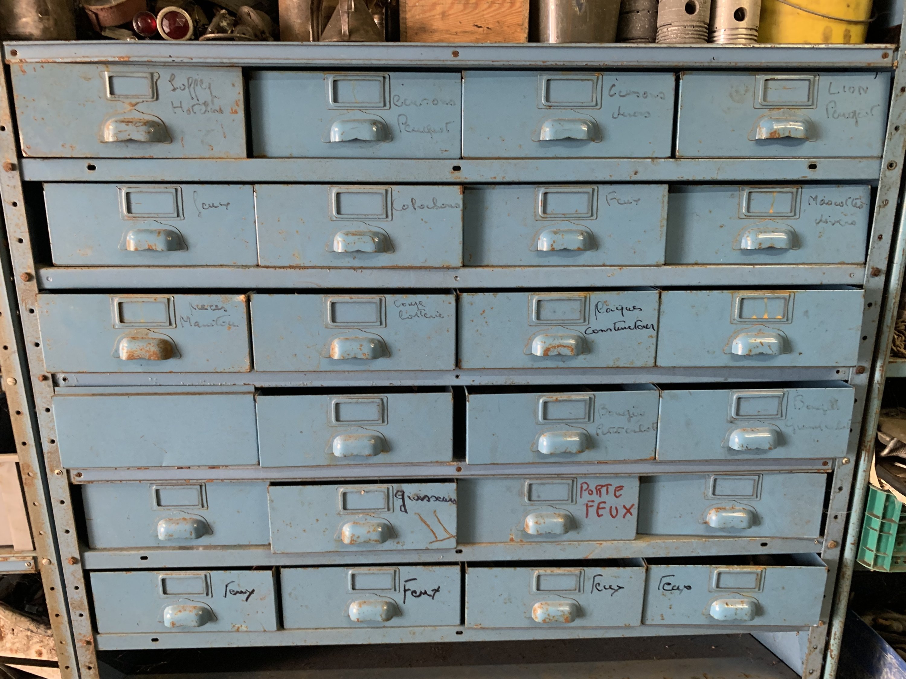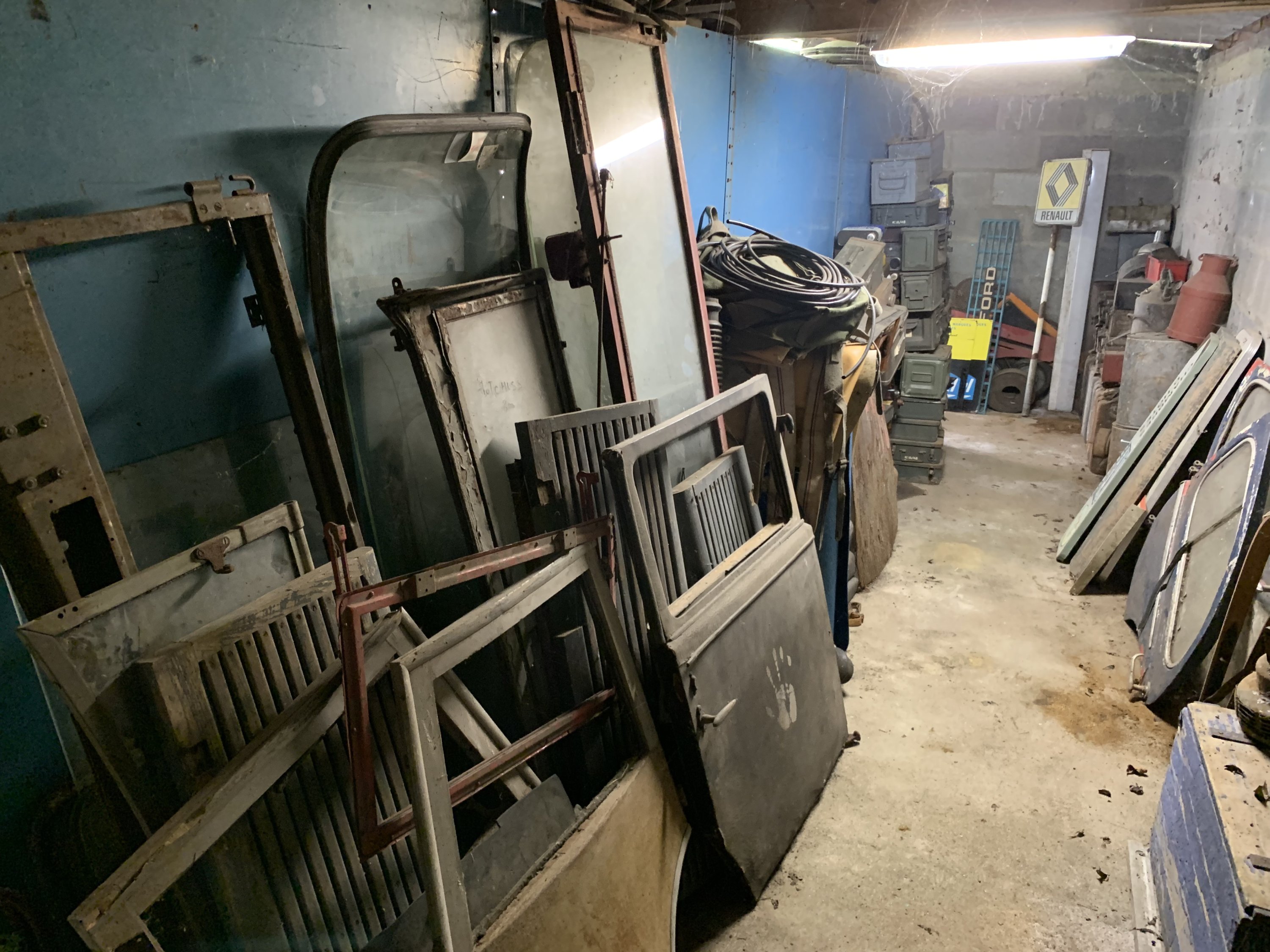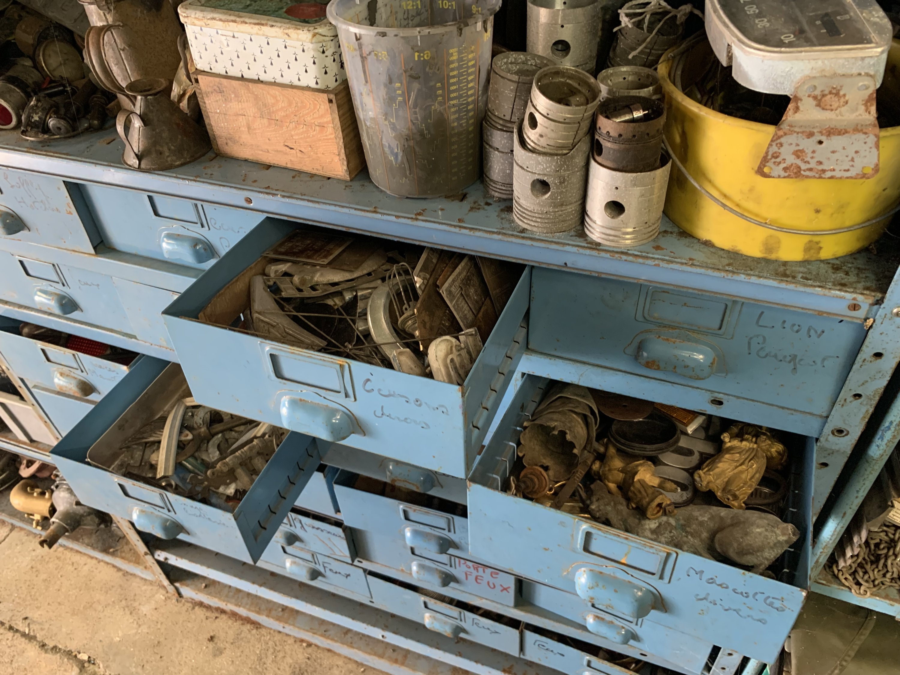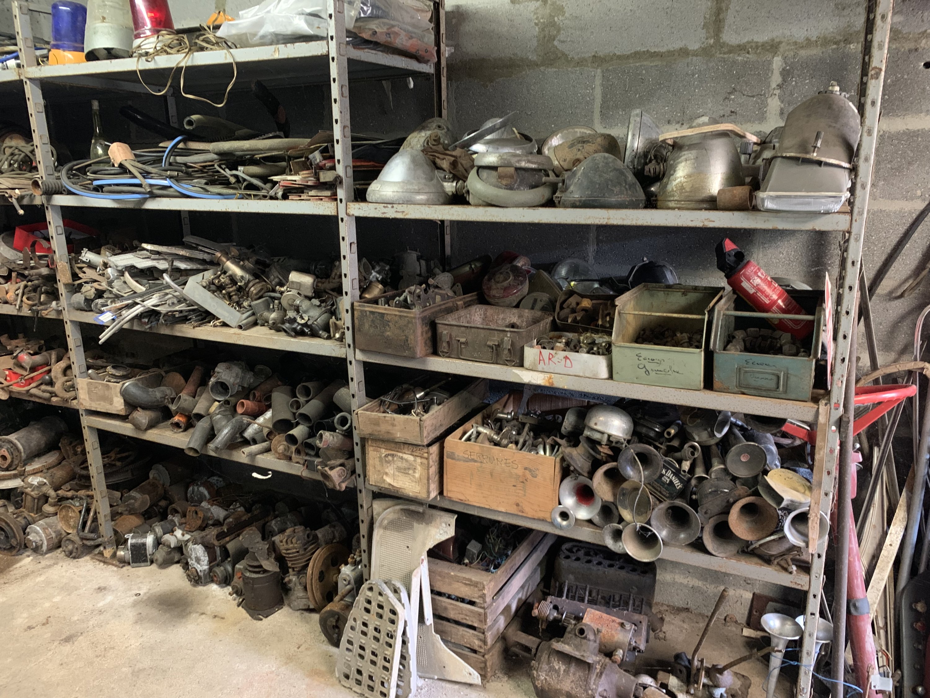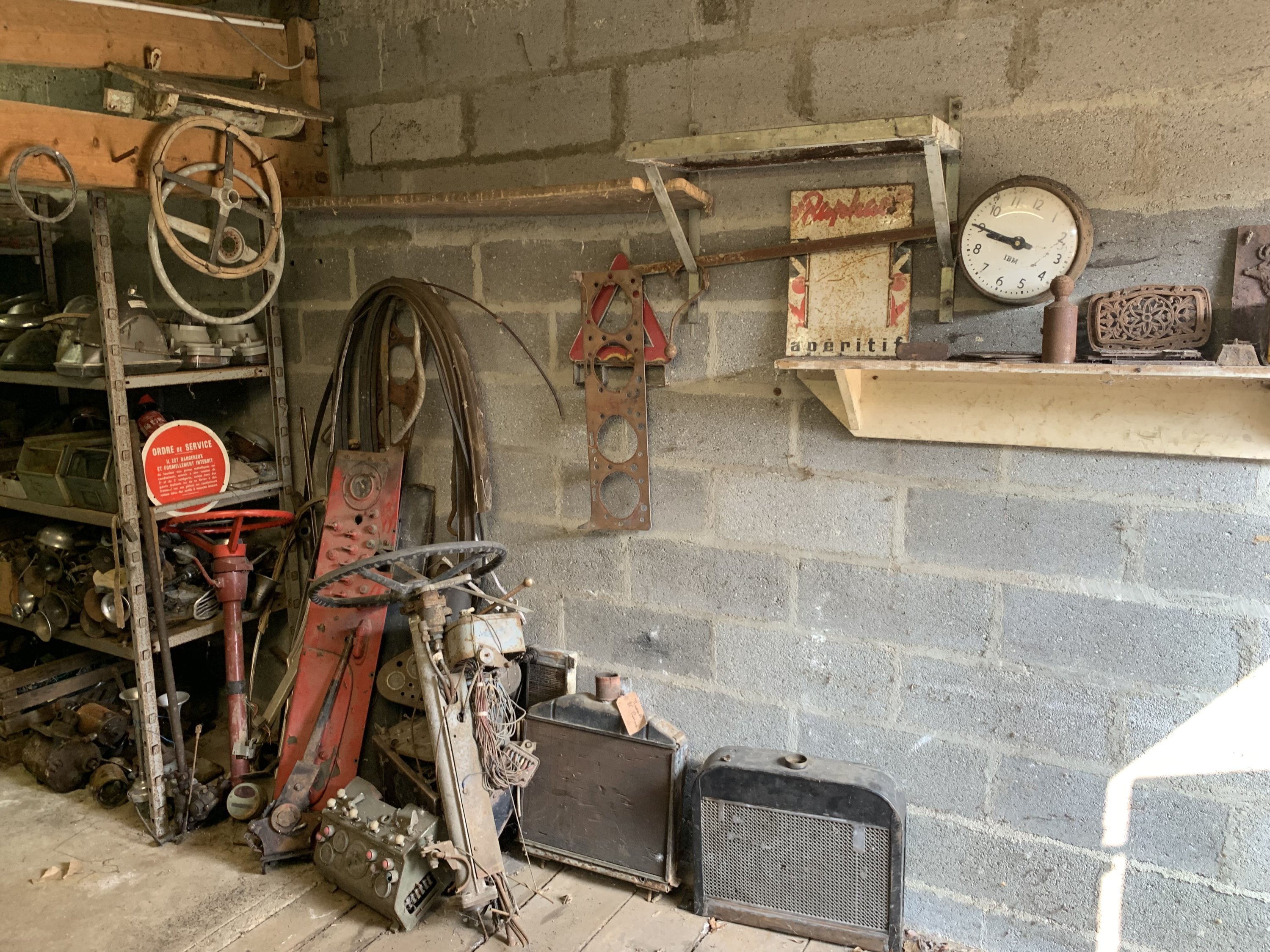 En un seul lot: important stock de pièces automobiles, dont volants, klaxons, plaques publicitaires, mascottes, ampoules, jerricans, etc.
