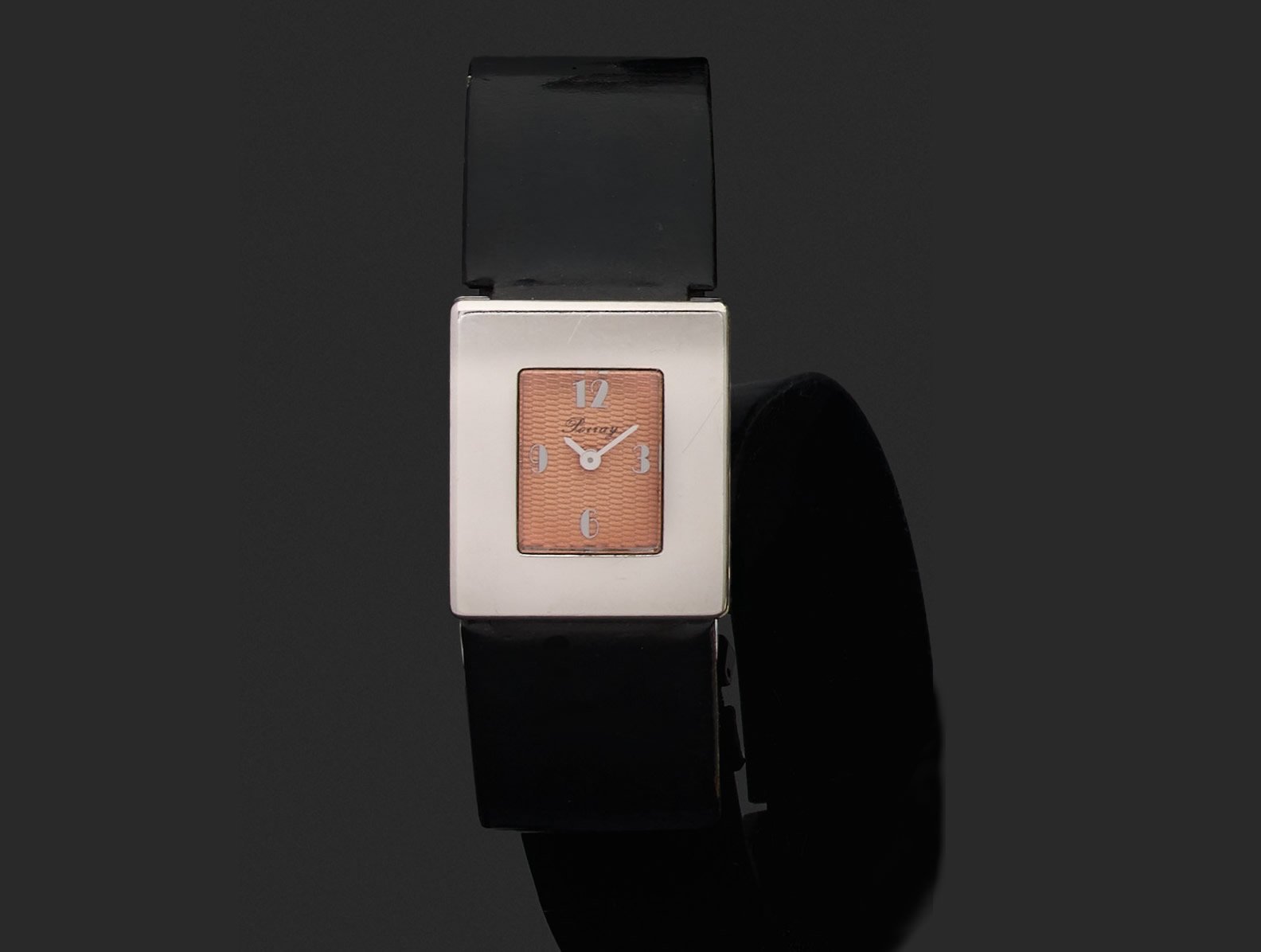 en acier sur cuir. Boitier rectangulaire en acier. Cadran guilloché couleur saumon avec index chiffres arabes appliqués. Mouvement quartz. Bracelet cuir vernis noir avec boucle déployante en acier signée.