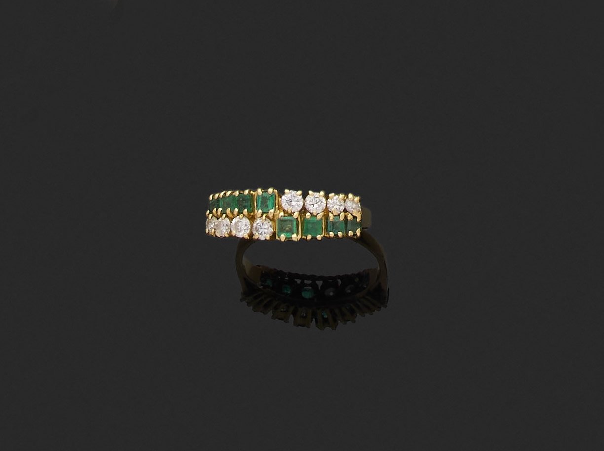 en or jaune 750 millièmes, ornée d'une ligne de diamants ronds de taille brillant et d'émeraudes de forme carrée en chute.