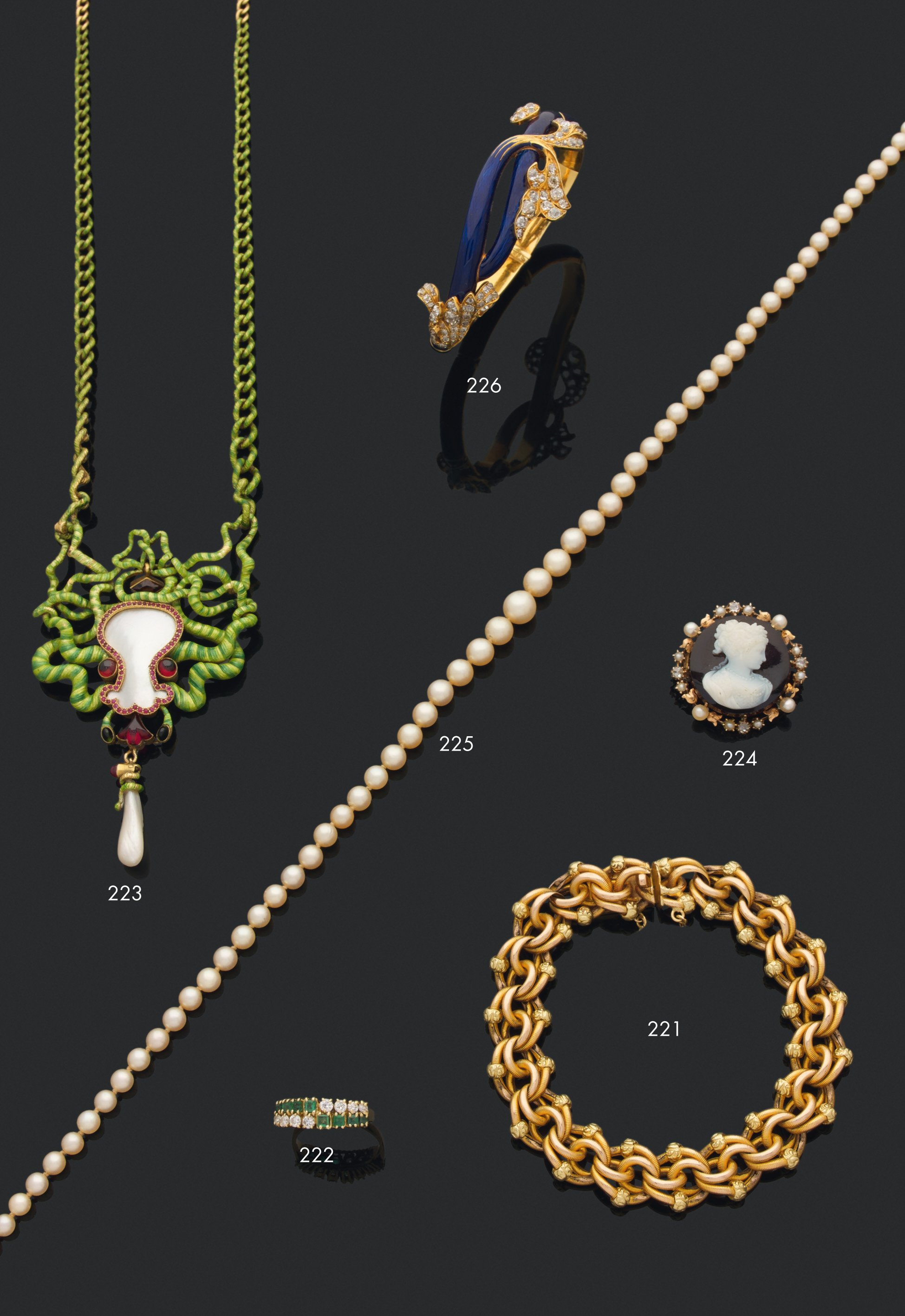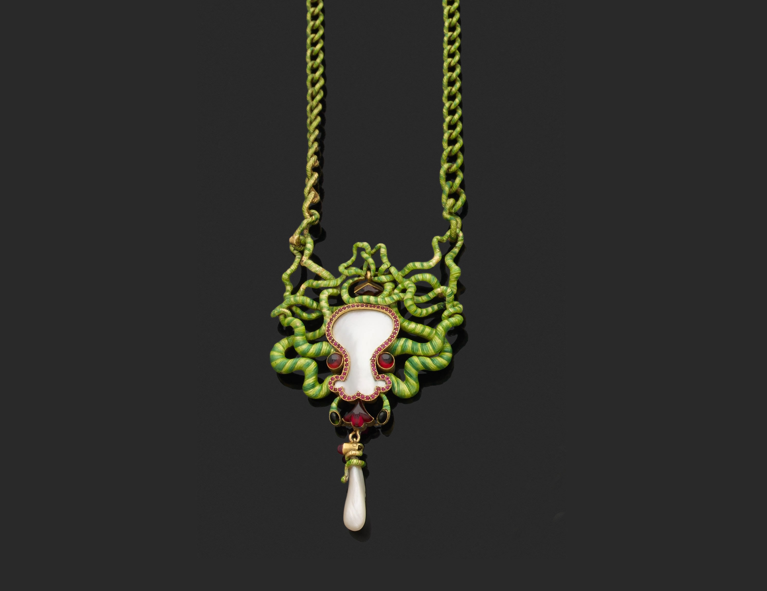 en or jaune 585 millièmes émaillé vert translucide retenant au centre un motif amovible en or jaune 750 millièmes simulant une pieuvre émaillé vert et jaune, le corps orné d'une plaque de nacre dans un entourage de rubis et pierres rouges facettées, de forme cabochon. Une perle Keshi en pampille.