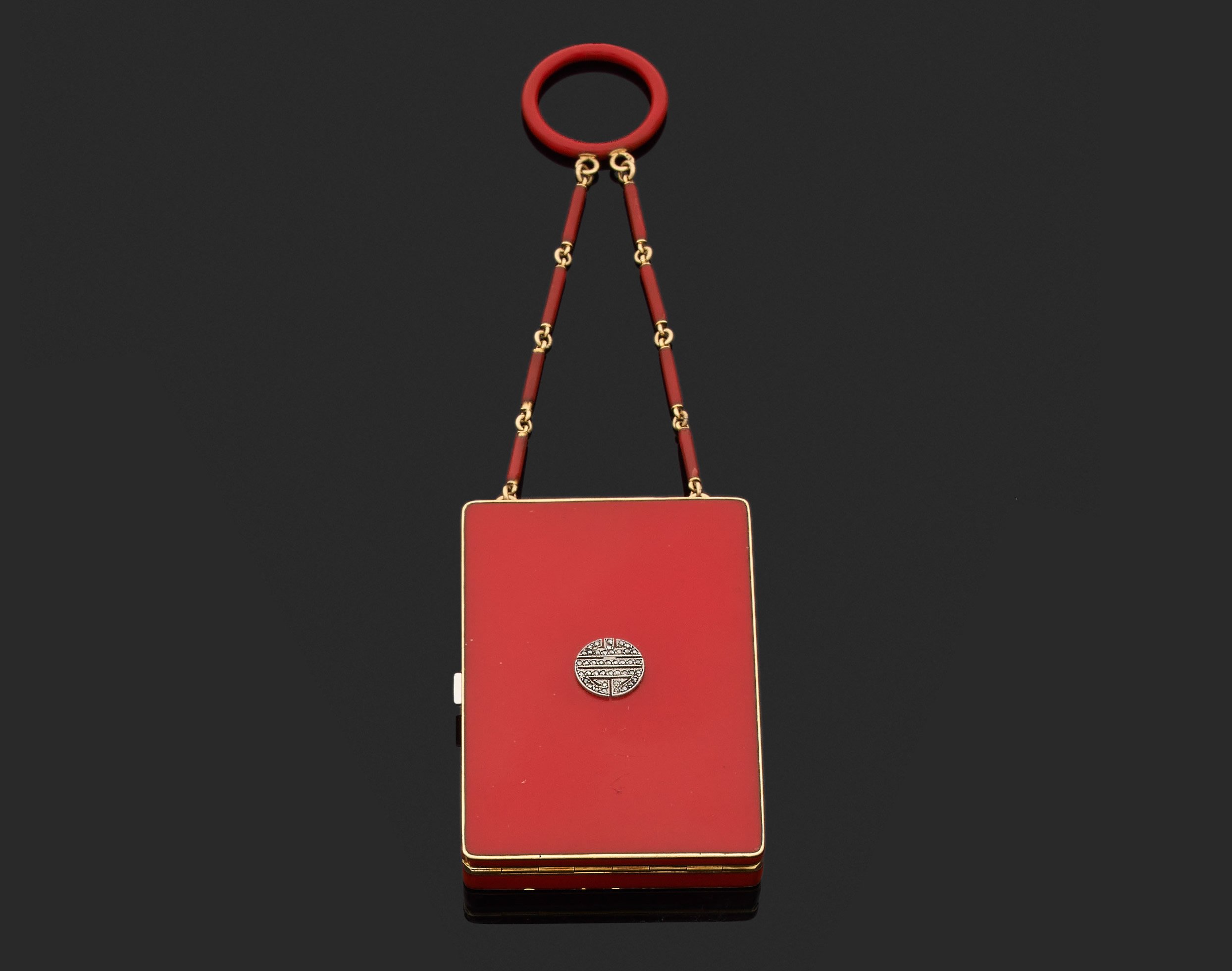 en or jaune 750 millièmes laqué rouge, le couvercle appliqué d'un monogramme serti de diamants taillés en rose. Il renferme un compartiment à poudre et un étui de tube de rouge à lèvres. Avec sa chainette de suspension également émaillé rouge.