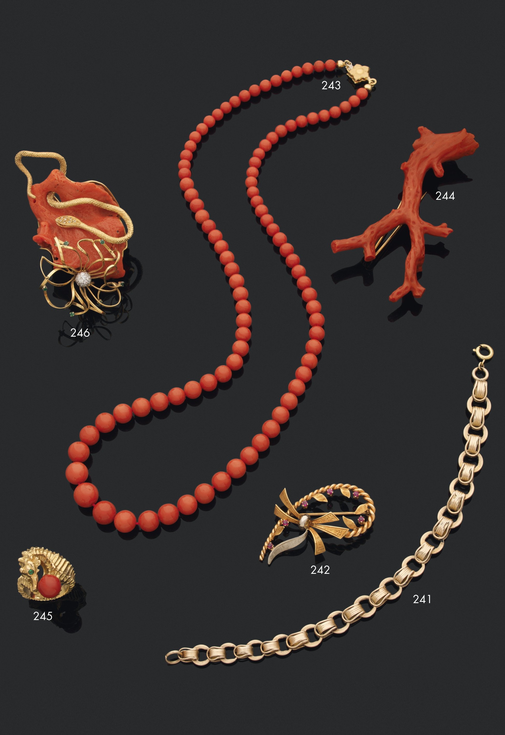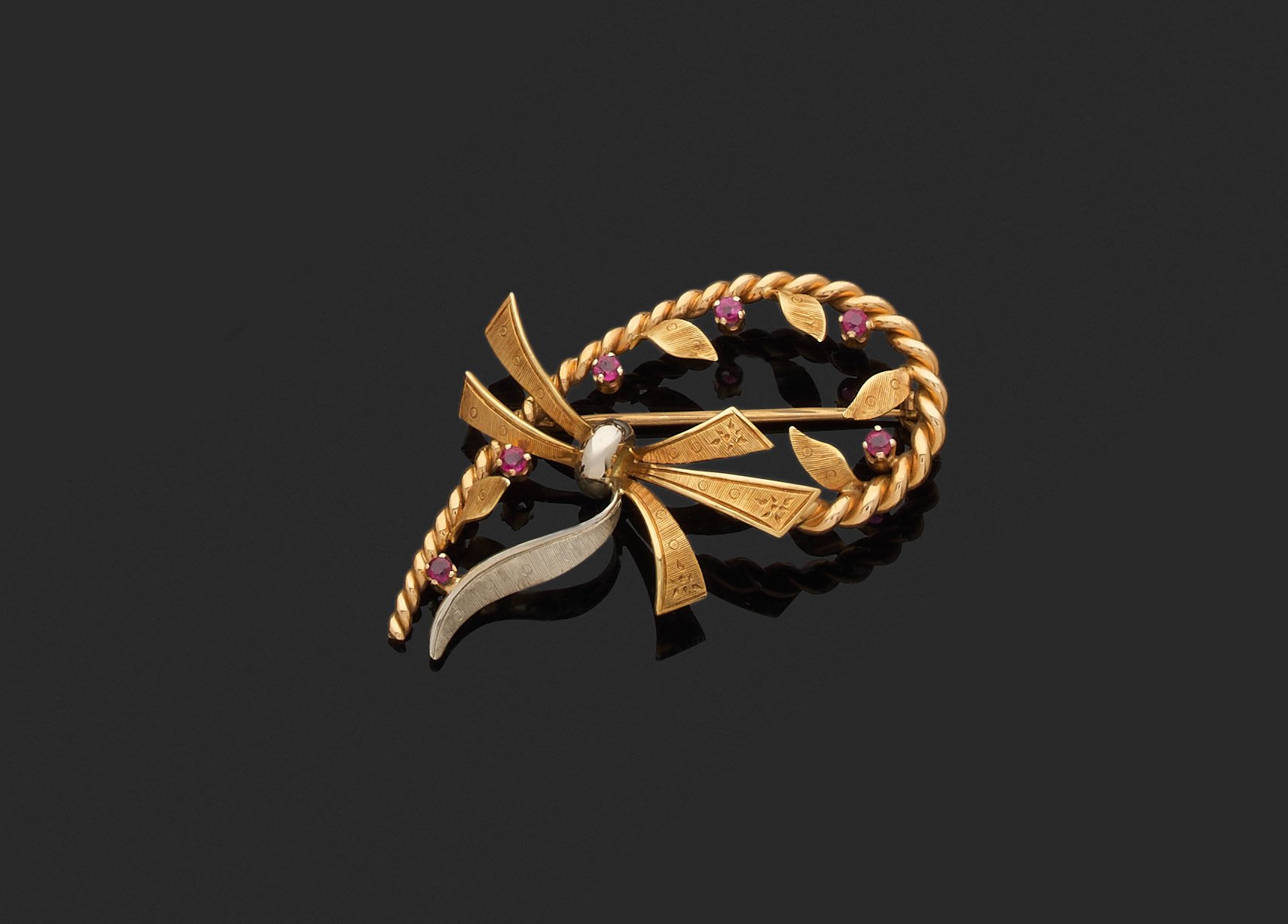 en or 750 millièmes de deux tons à décor de nœuds et de fils d'or torsadé partiellement serti de petits rubis.