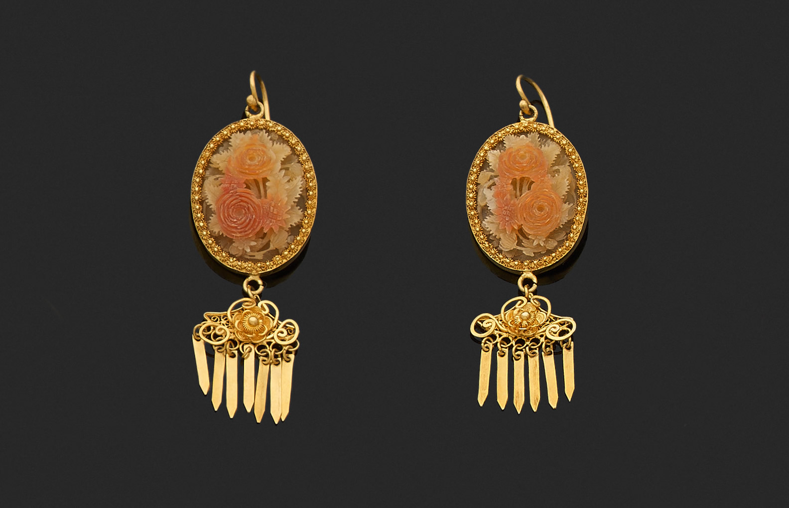 en or jaune 750 et 585 millièmes à décor de feuillages ornées de pierres ornementales gravées. Système pour oreilles percées.