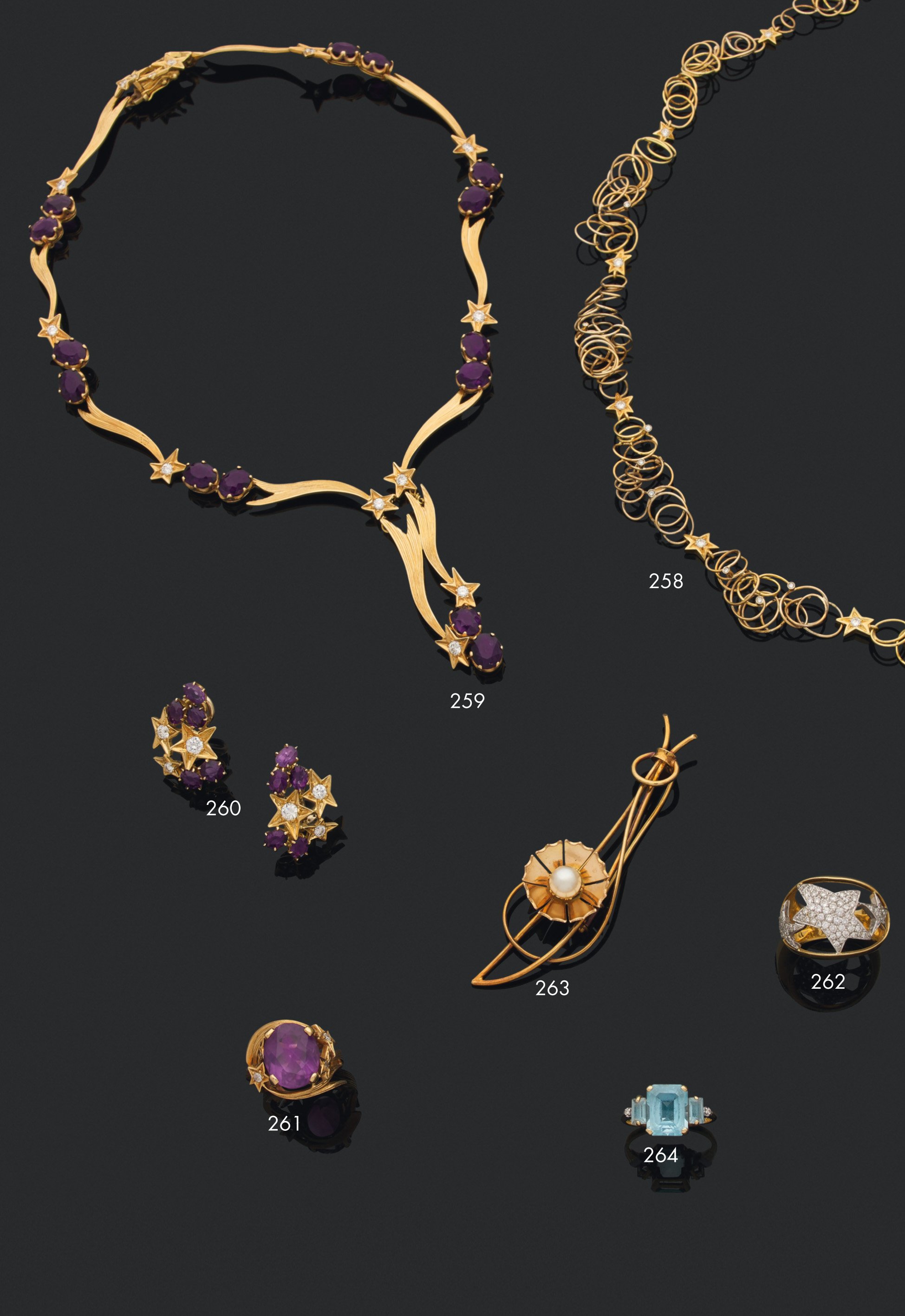 en or jaune 750 millièmes chacune à décor d'étoiles ornées d'améthystes et de diamants ronds de taille brillant.