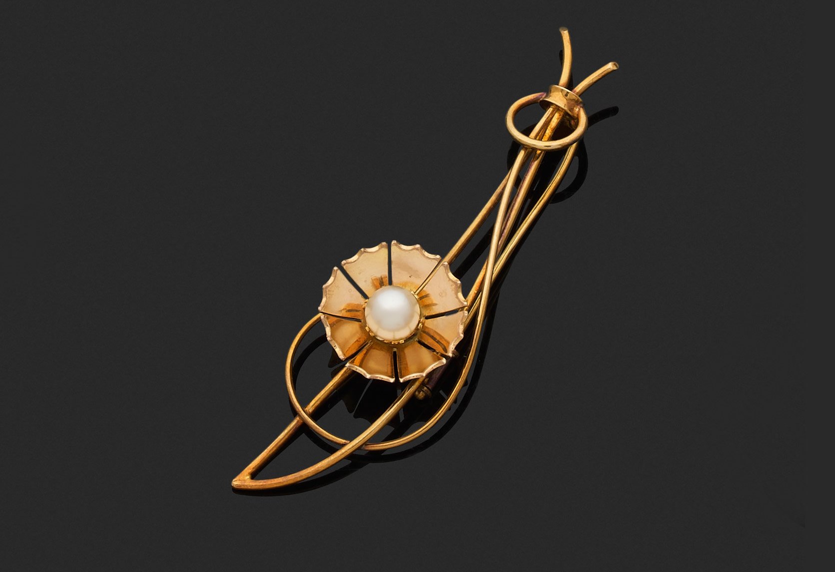 en or jaune 585 millièmes figurant une fleur, le centre orné d'une perle de culture.