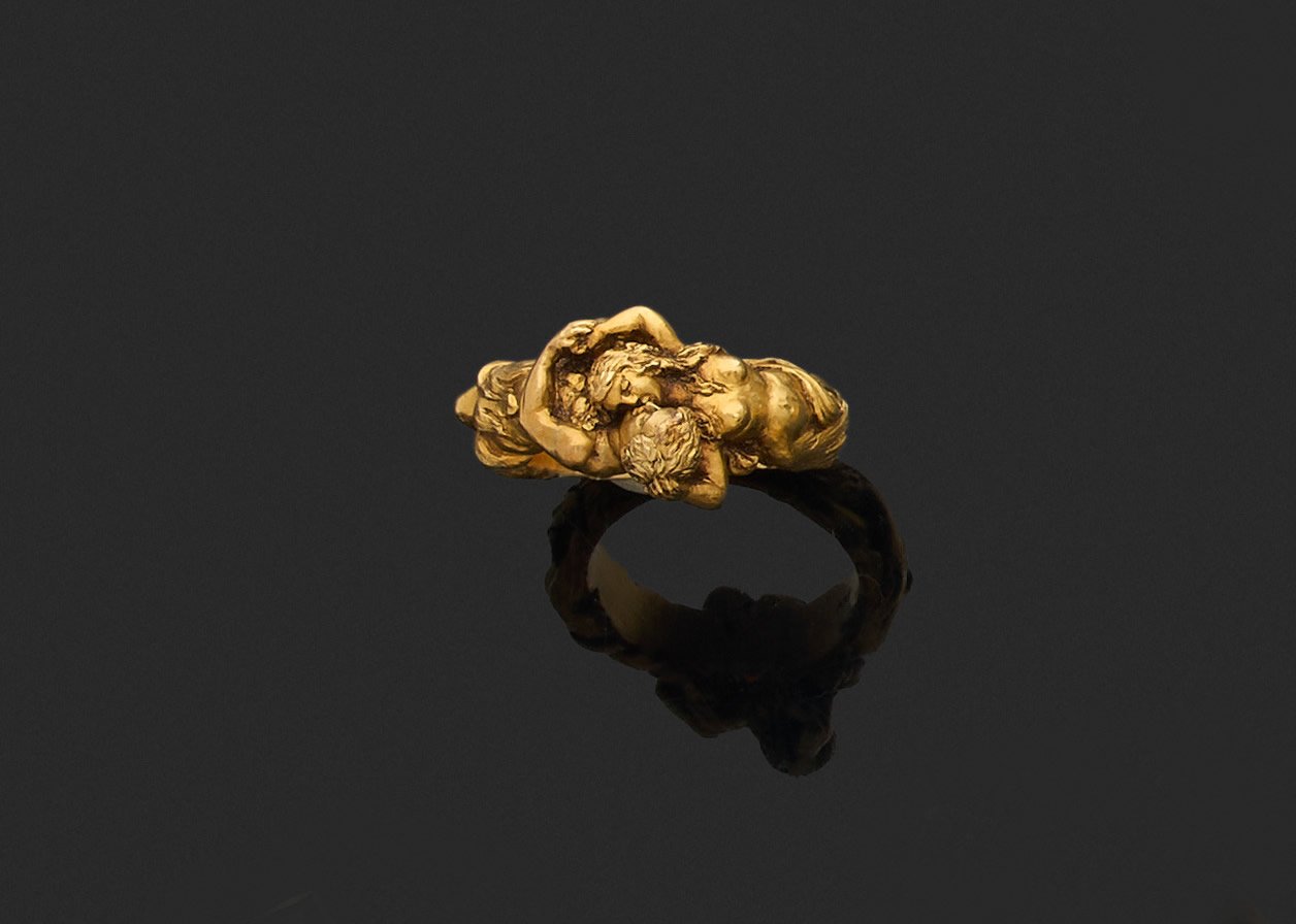 en or jaune 750 millièmes, entièrement gravé figurant un couple enlacé.