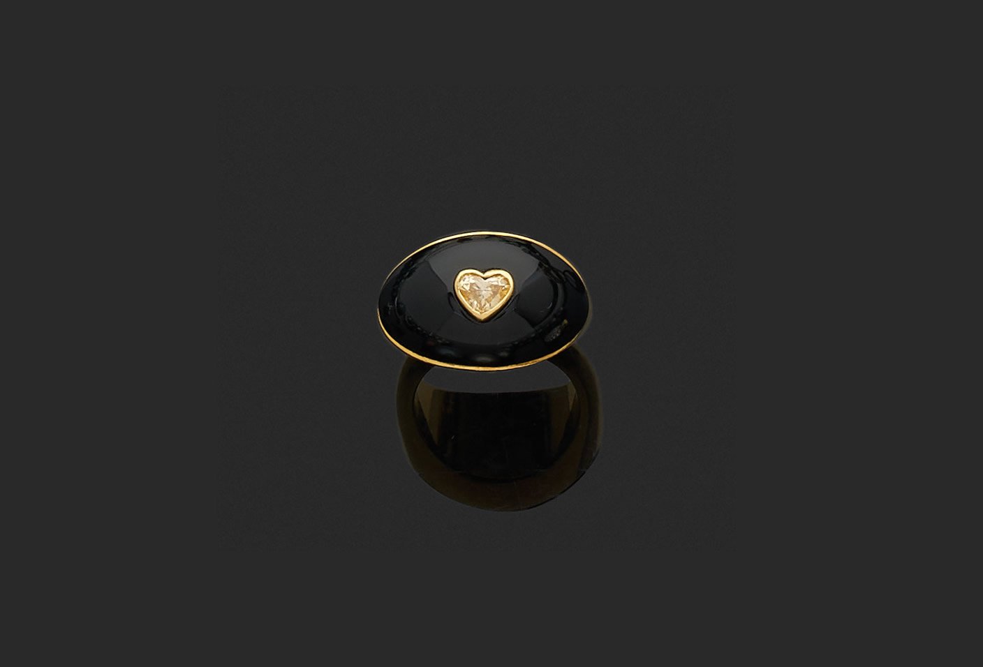 en or jaune 750 millièmes de forme bombée ornée d'onyx serti au centre d'un diamant cœur.