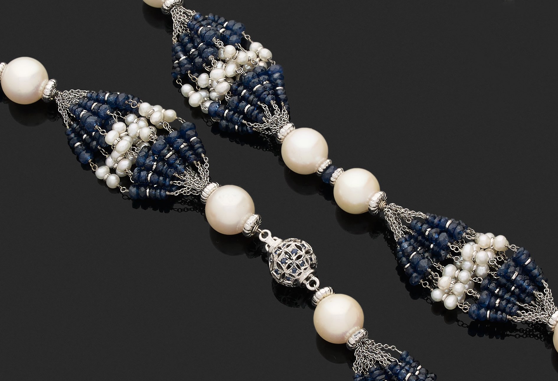 en or gris 750 millièmes orné de perles de culture alternées de saphirs facettés.