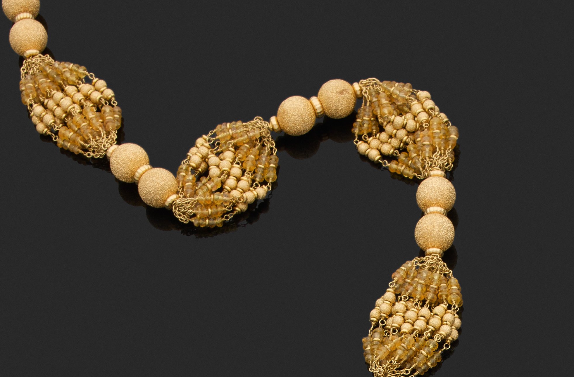 en or jaune 750 millièmes décoré de boules d'or gravées alternées de citrines facettées.