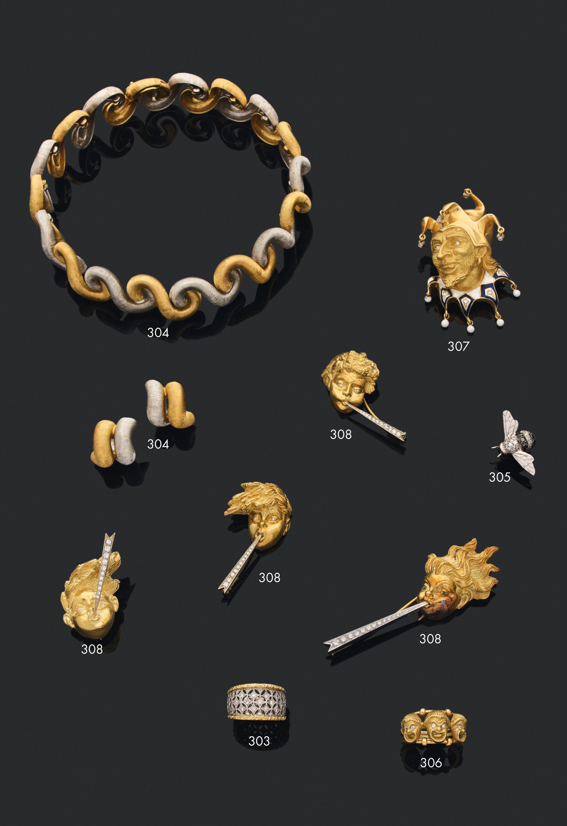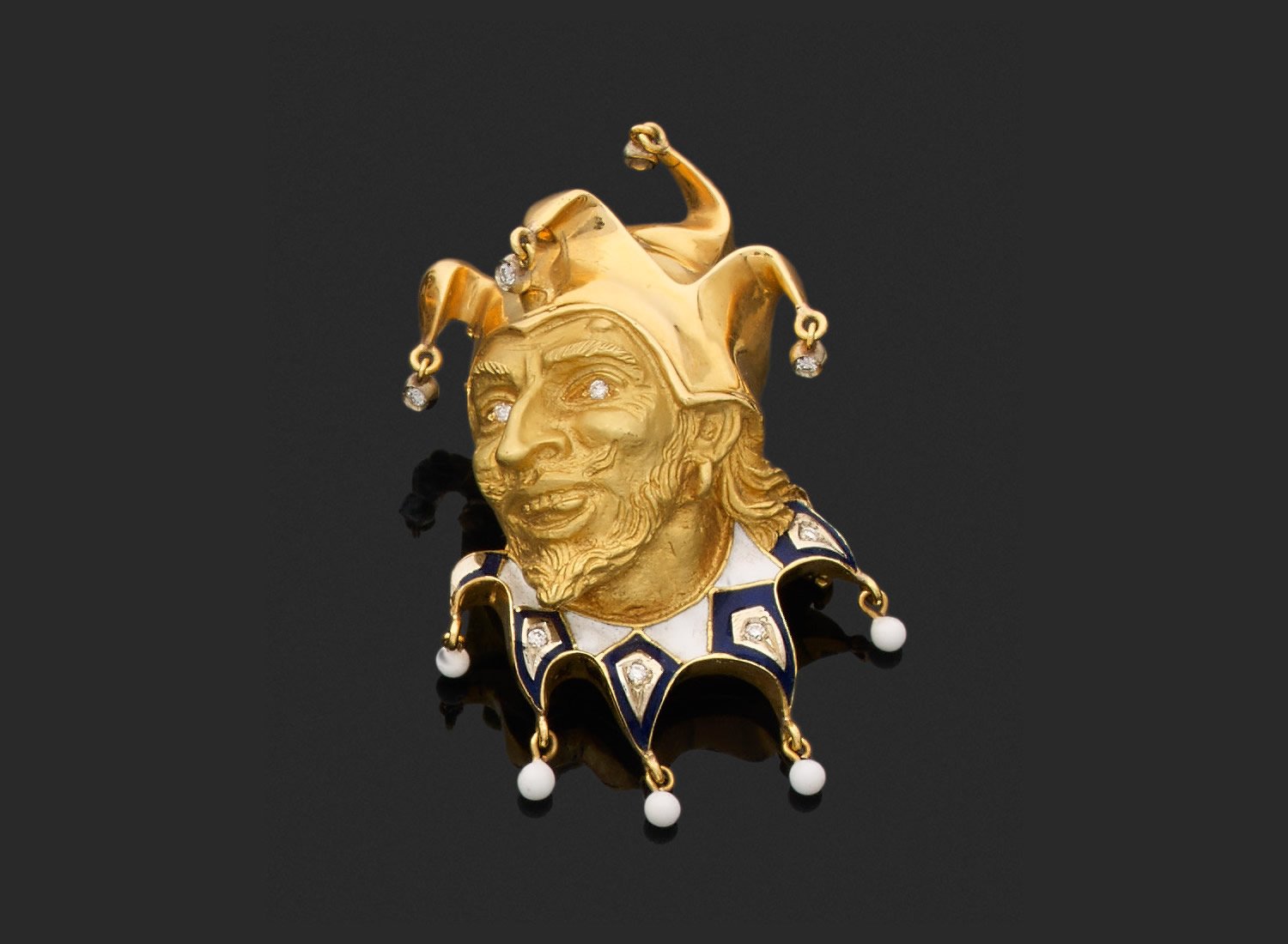 en or jaune 750 millièmes figurant une tête de "bouffon du roi", la collerette émaillée blanc et bleu partiellement sertie de diamants ronds de taille brillant et retenant des petites boules en pampille.