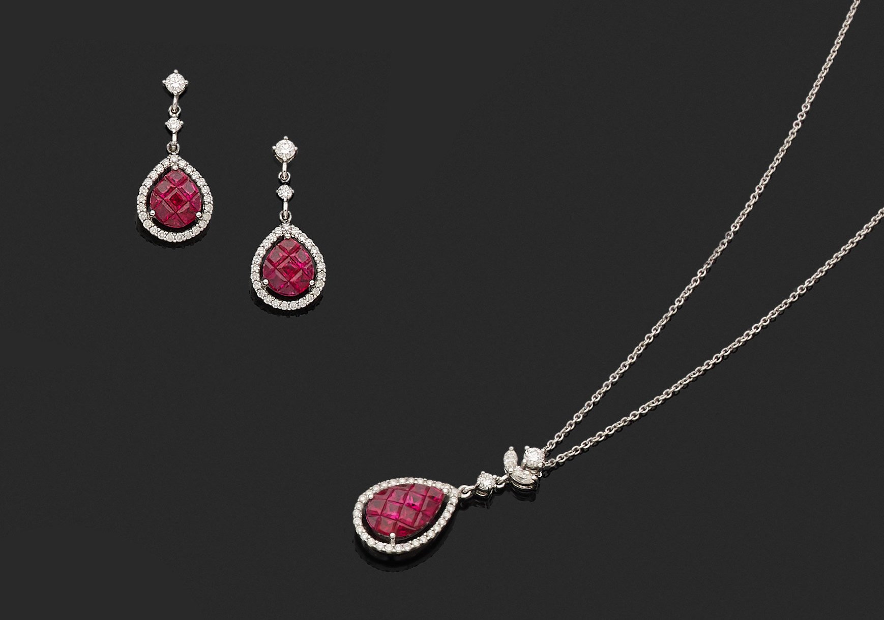 en or gris 750 millièmes chacun décoré de motifs poire ornés de rubis calibrés dans un entourage de diamant ronds de taille brillant.