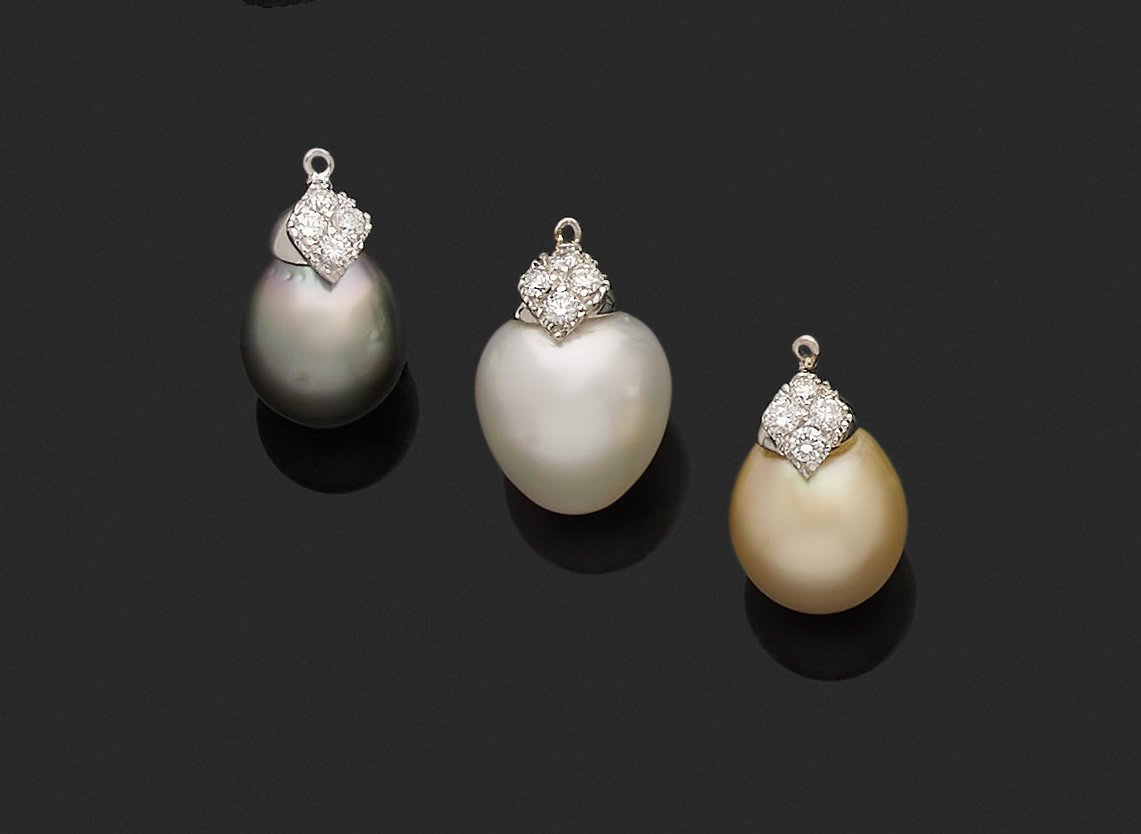 JOINT: trois pendentifs en or gris 750 millièmes, chacun orné d'une perle de culture surmontée de diamants ronds de taille brillant.