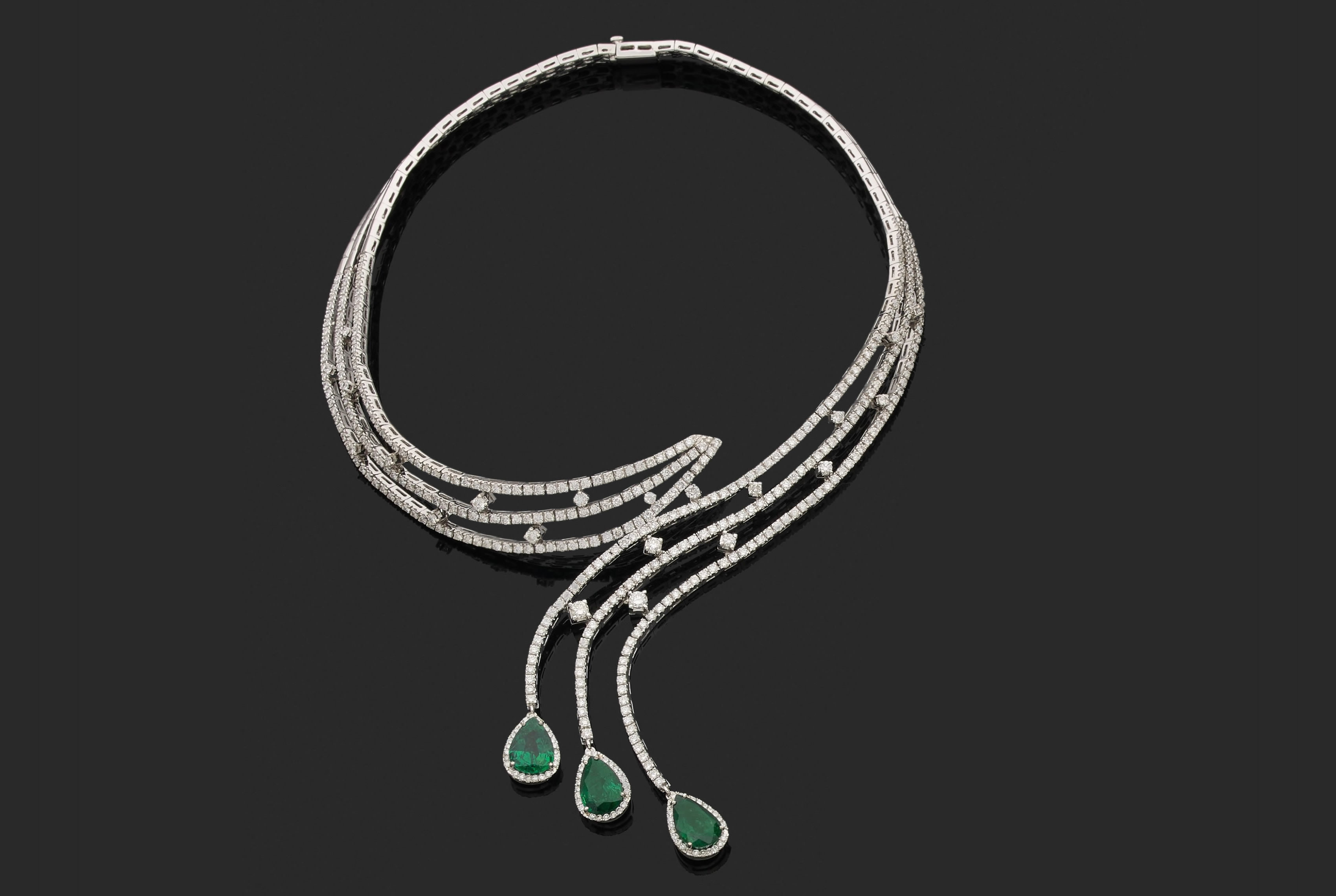 en or gris 750 millièmes, le centre à décor d'enroulements orné de trois lignes de diamants ronds de taille brillant supportant chacune une émeraude de forme poire amovible.