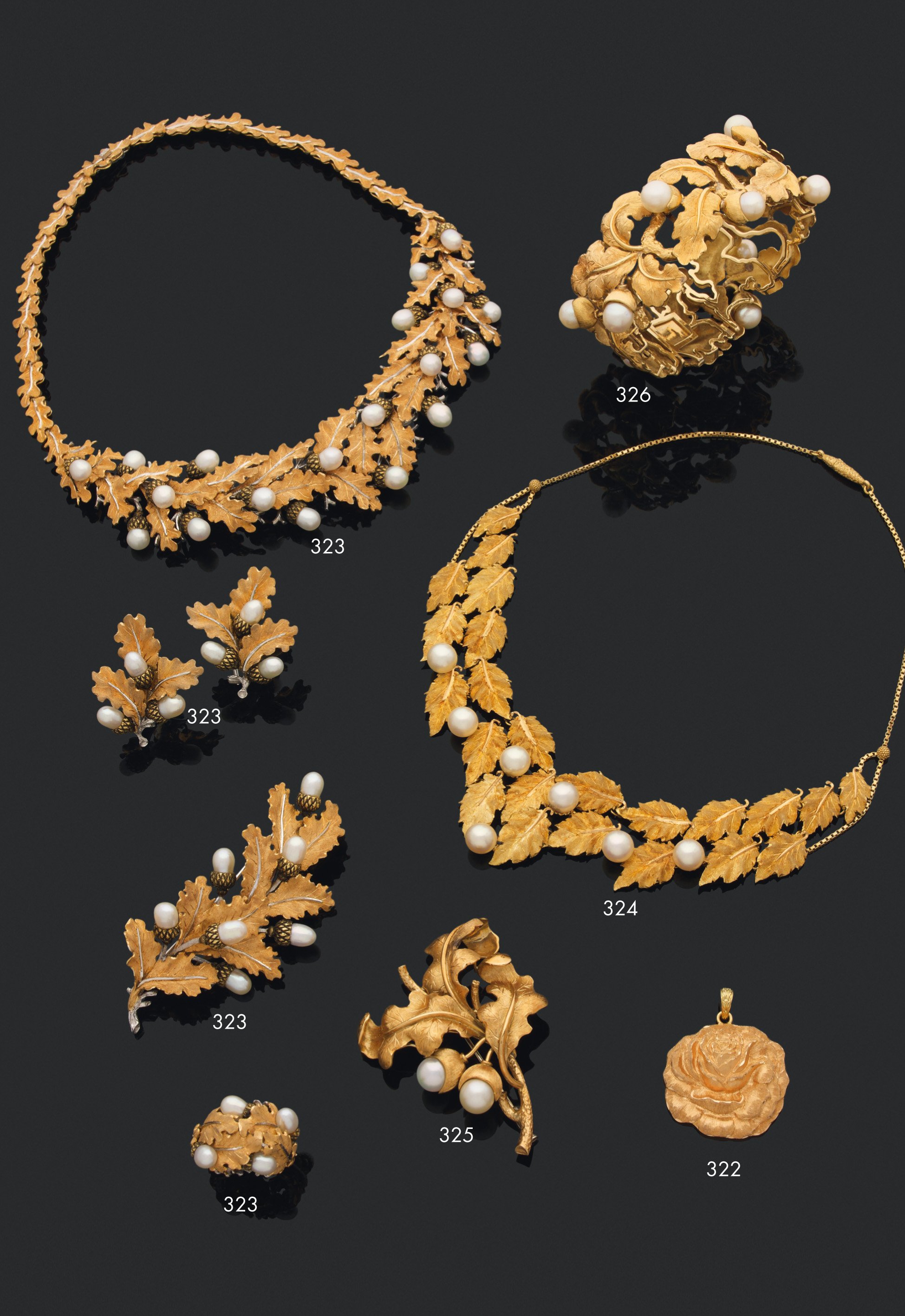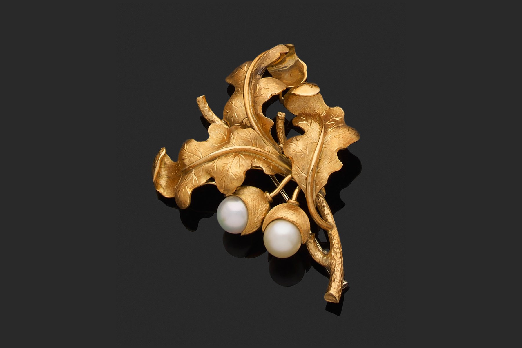 en or jaune 750 millièmes gravé figurant des feuilles de chêne, les glands ornés de perles de culture.