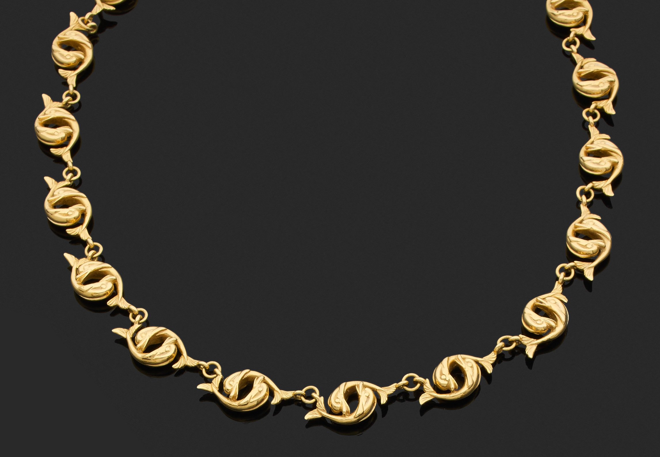 en or jaune 750 millièmes, les maillons à décor de dauphins.