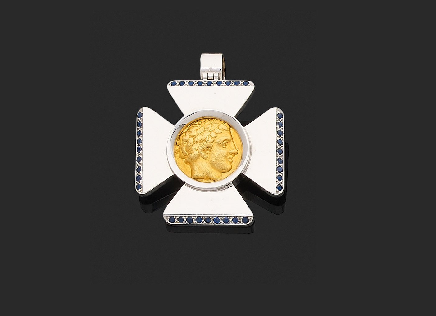 le centre orné d'une pièce de style antique, les extrémités ornées de petits saphirs.