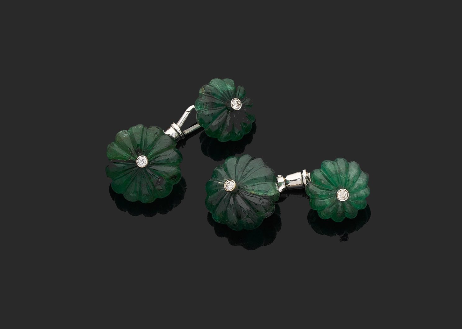 en or gris 585 millièmes, les extrémités ornées d'émeraudes gravées à décor de côtes de melon, le centre serti d'un petit diamant rond de taille brillant.