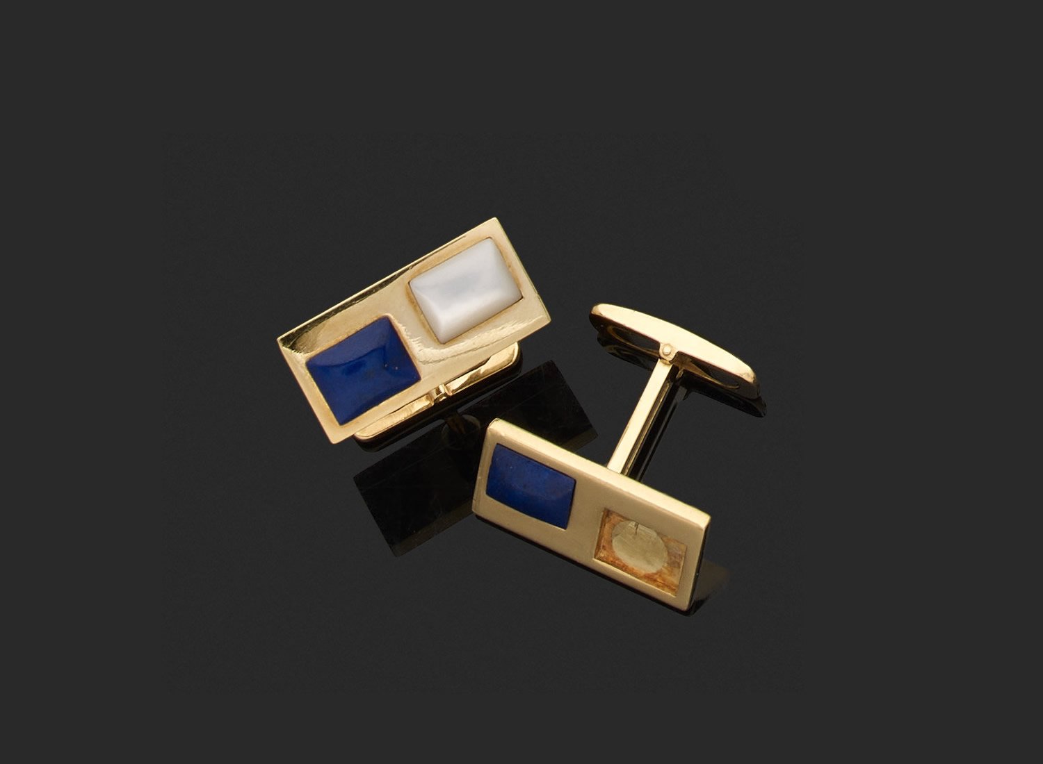 en or jaune 750 millièmes, les extrémités de forme rectangulaire à décor de godrons ou ornées de nacre et lapis-lazuli teinté.