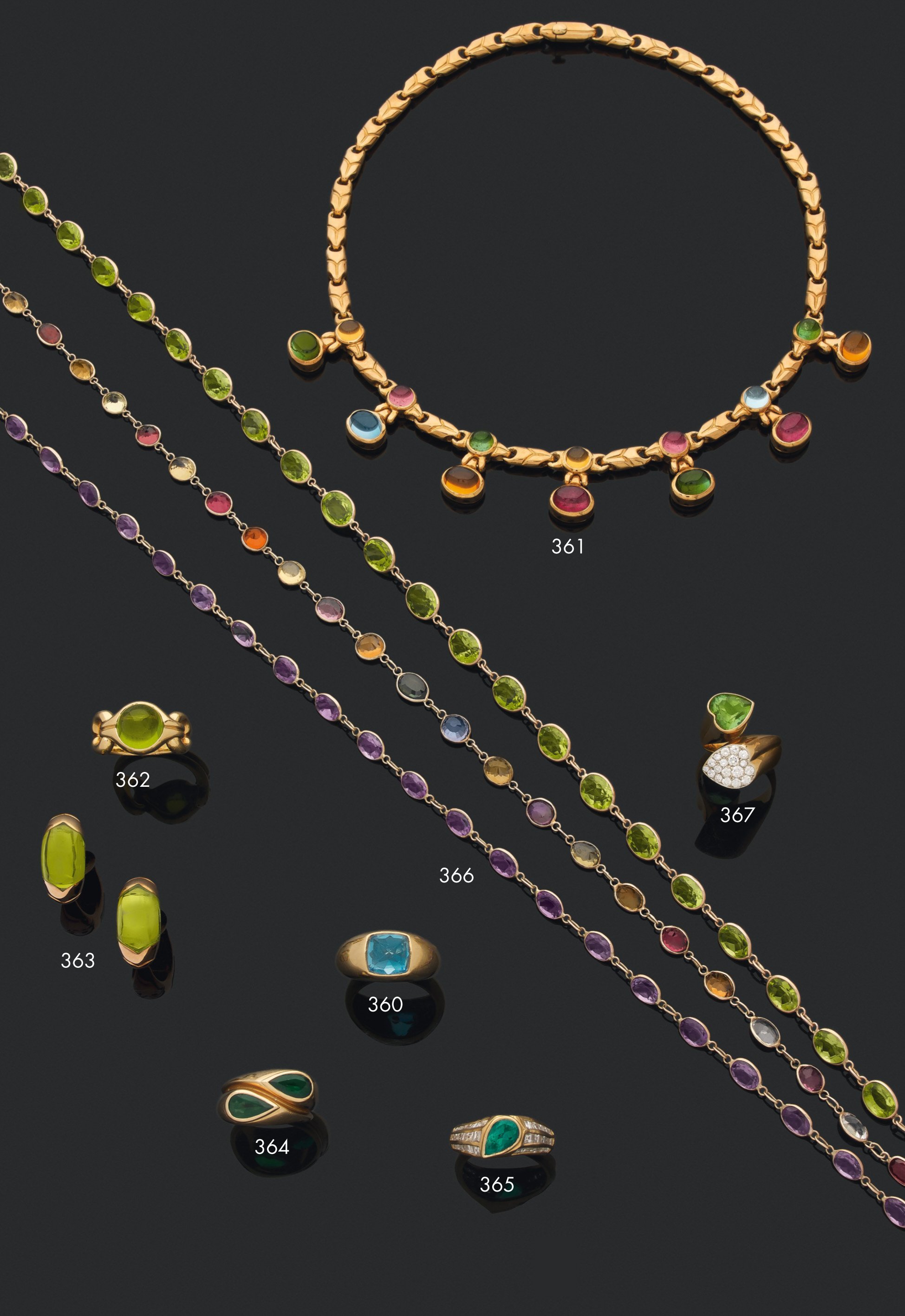 en or jaune 750 millièmes, le centre orné d'une émeraude de forme poire serti-clos entre des lignes de diamants carrés et rectangulaires.