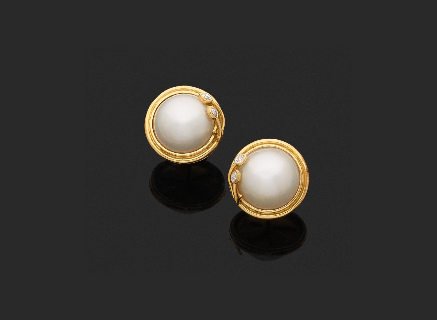 en or jaune 750 millièmes, chacune ornée d'une perle mabé, système pour oreilles percées.