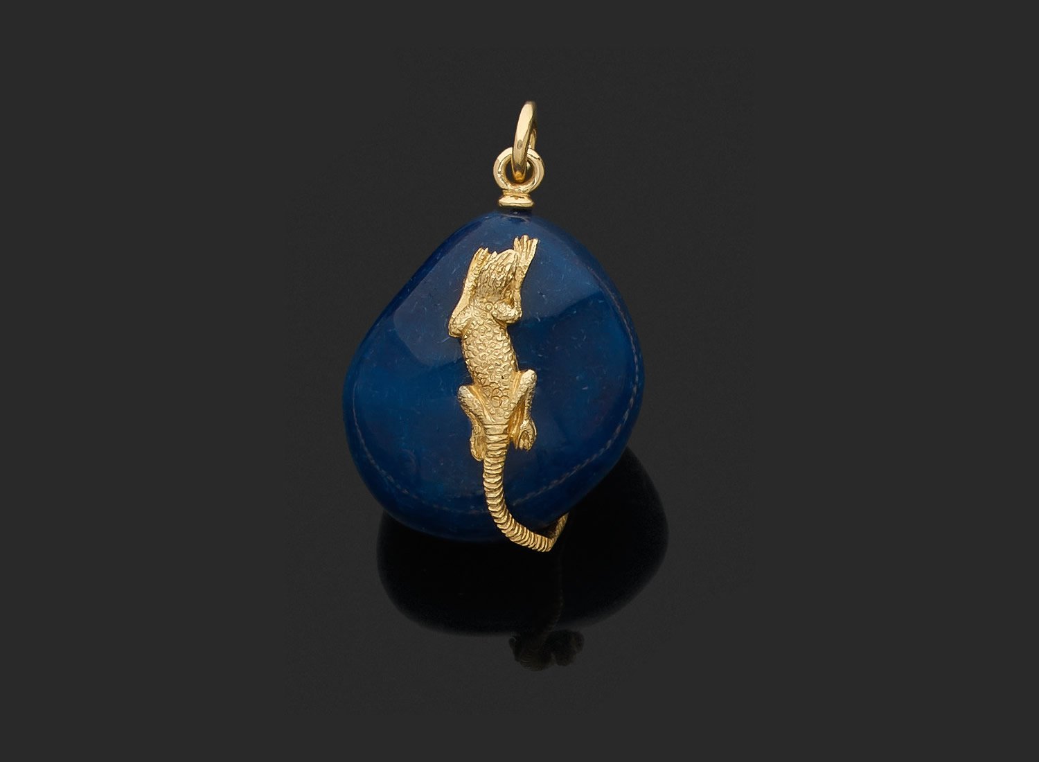 orné d'une pierre d'imitation bleue appliquée d'un motif en or figurant une salamandre.