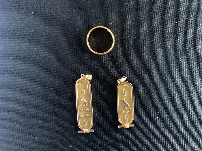 en or jaune 750 millièmes à décor de hiéroglyphes (dont un en or 585 millièmes).