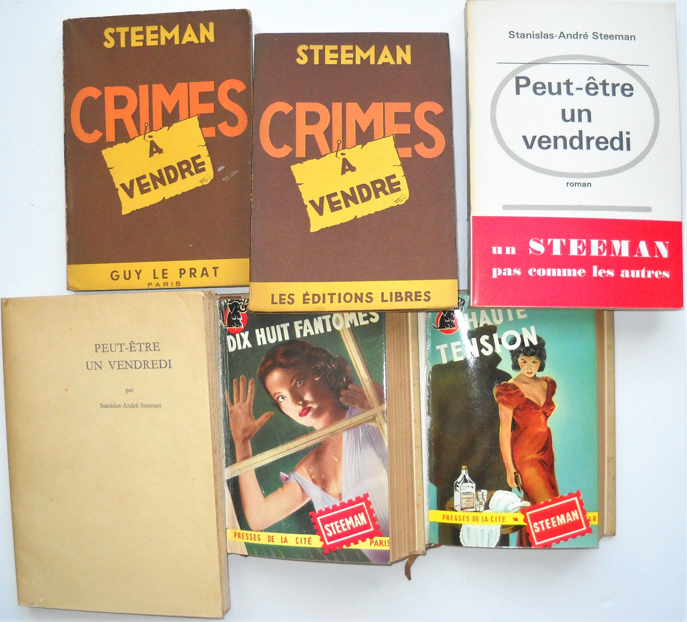 Stanislas-André Steeman, « Crimes à vendre », Paris et Bruxelles, 1946 (3 ex. E.O.) ; « Dix-huit fantômes », Paris, Presses de la Cité, 1952 (E.O.) ; « Haute tension », Paris, Presses de la Cité, 1953 (E.O.) ; « Peut-être un vendredi », Paris, Denoël, 1964 (3 ex.) ;
