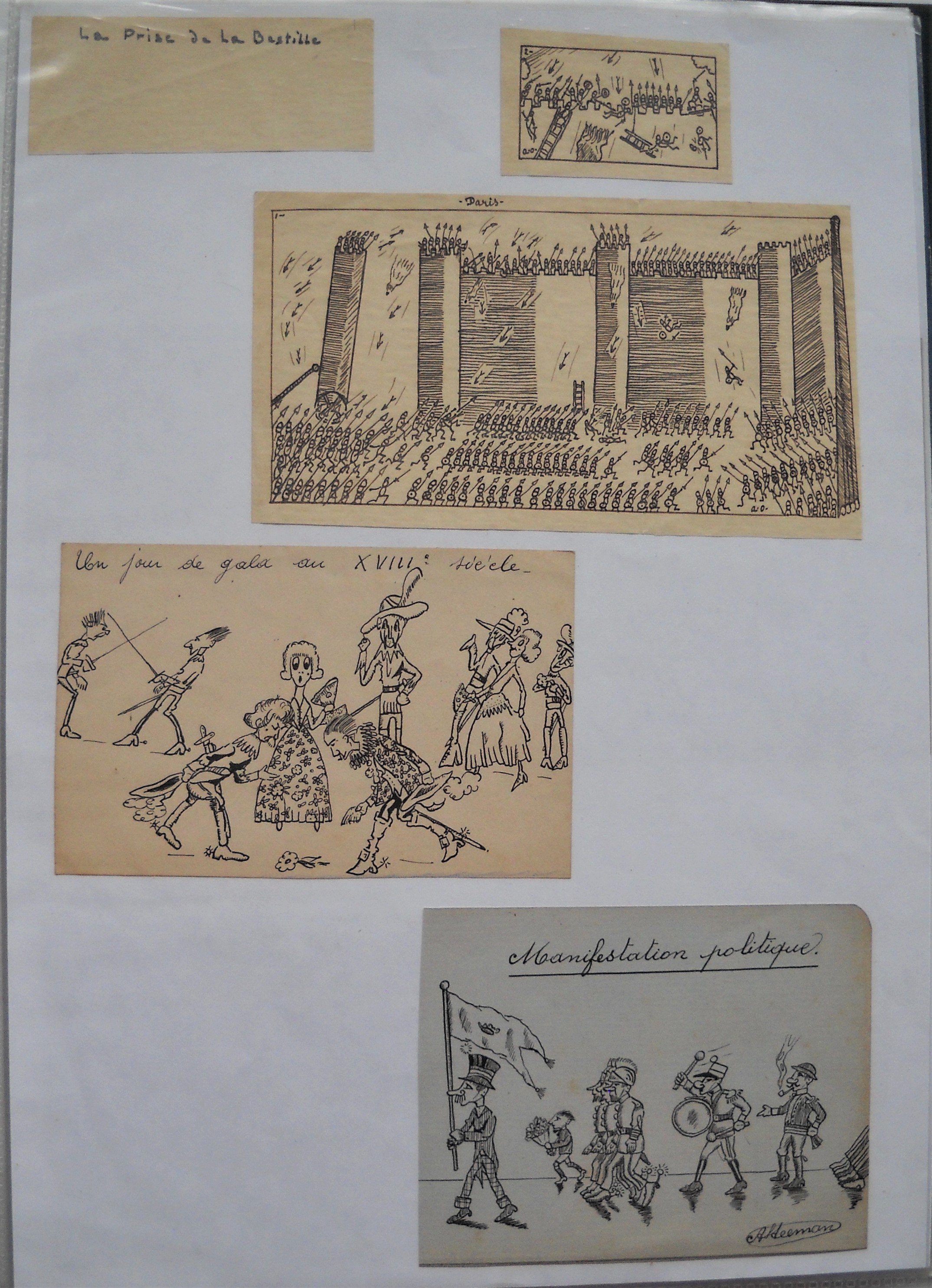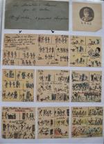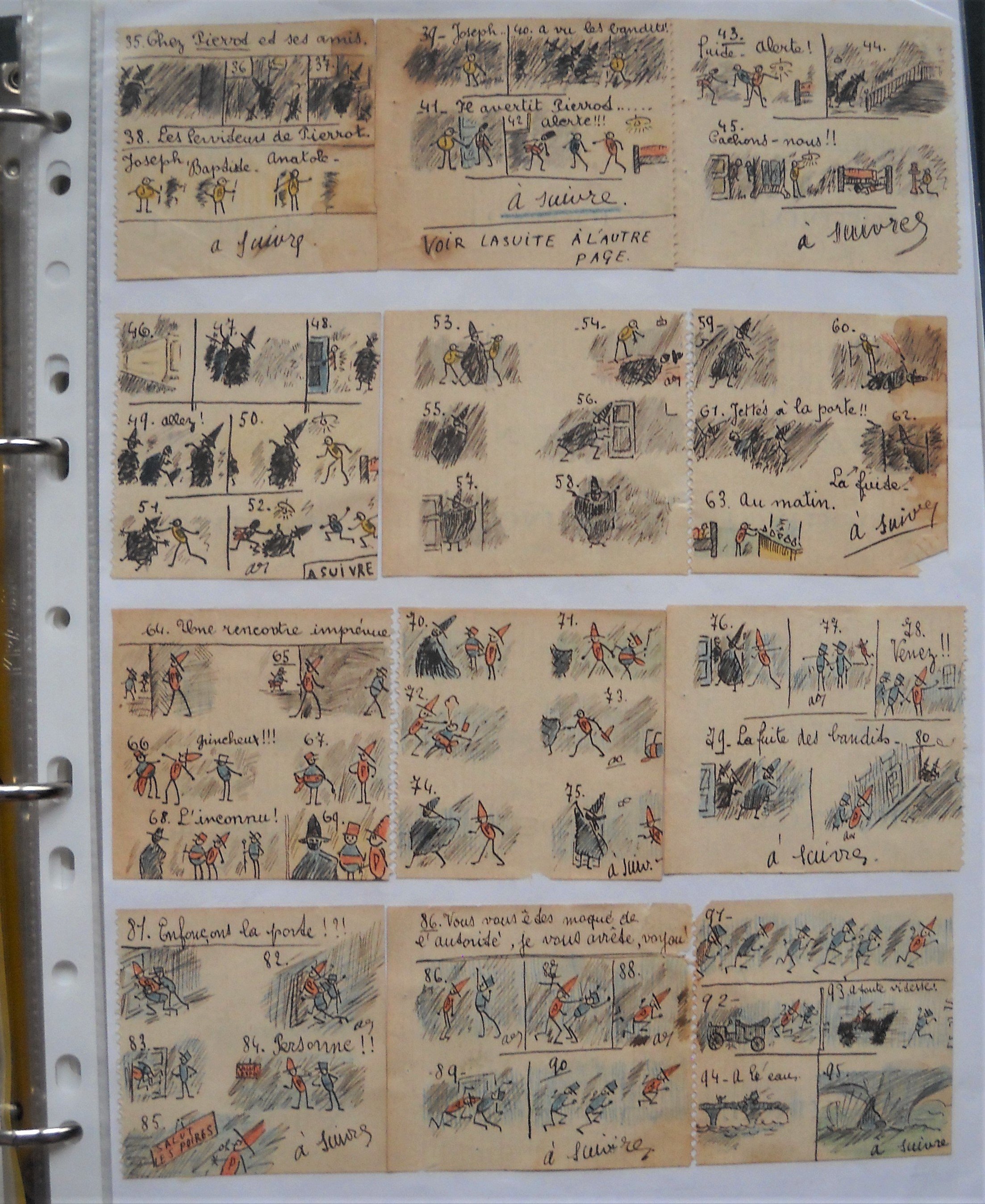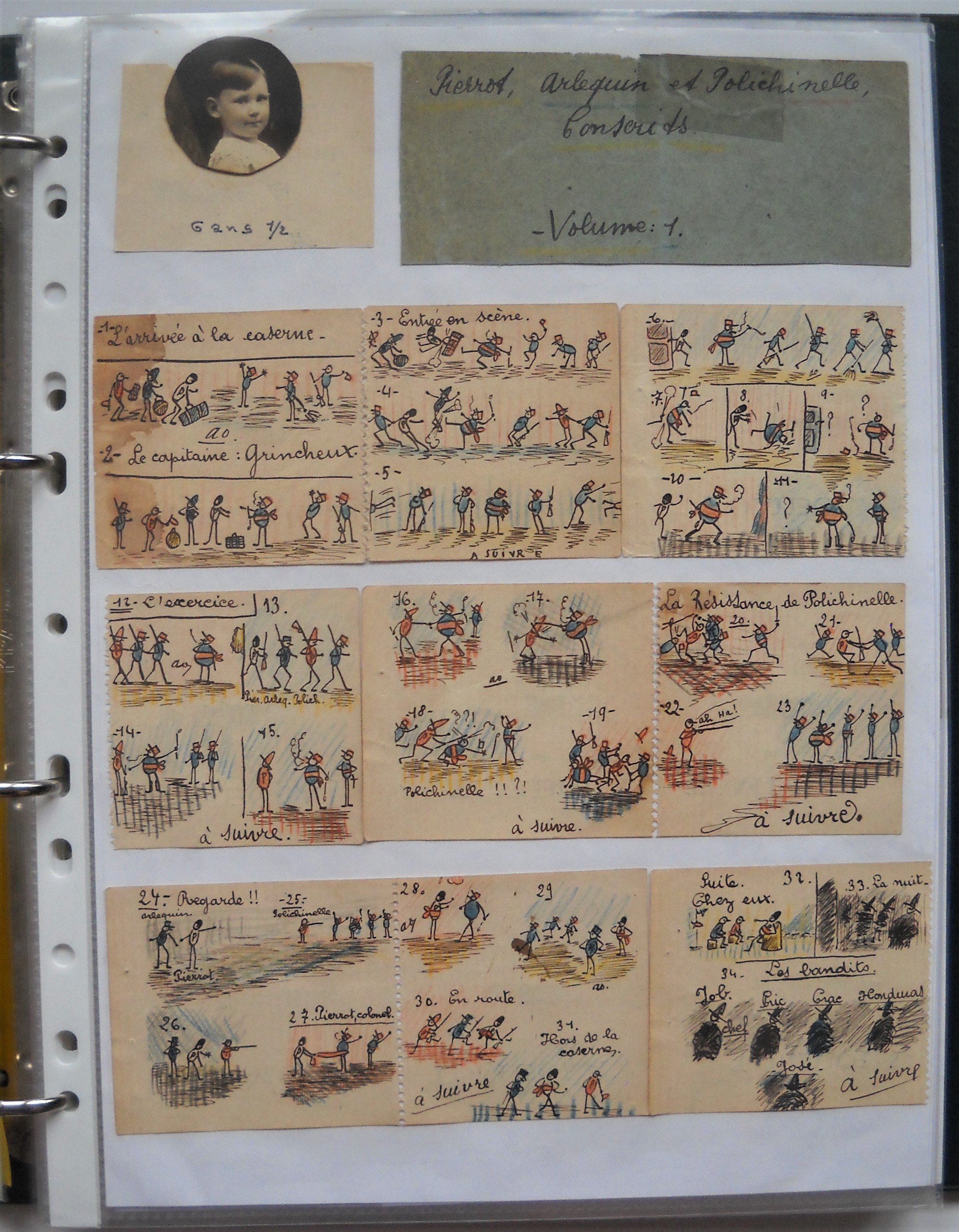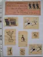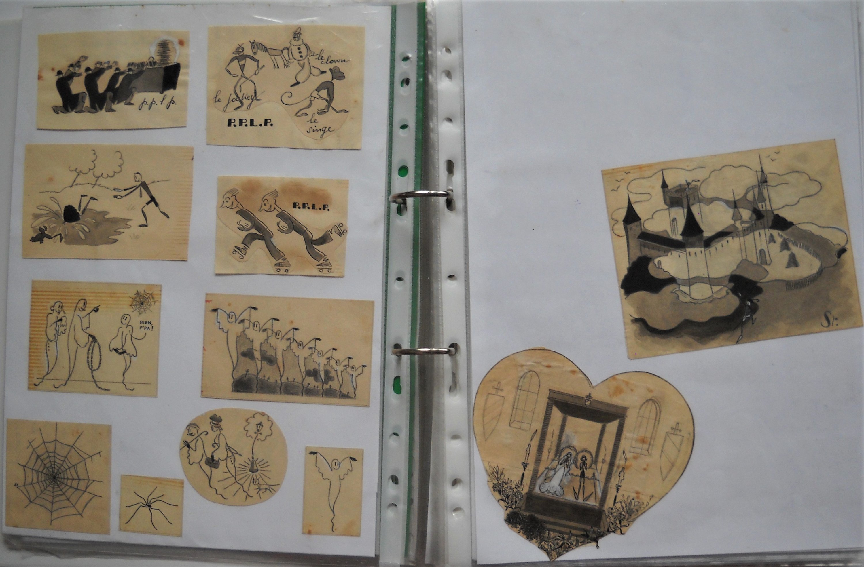 Classeur contenant les petits dessins originaux de Steeman enfant contrecollés sur feuilles blanches, env. 50 pp. + 2 minis carnets ;